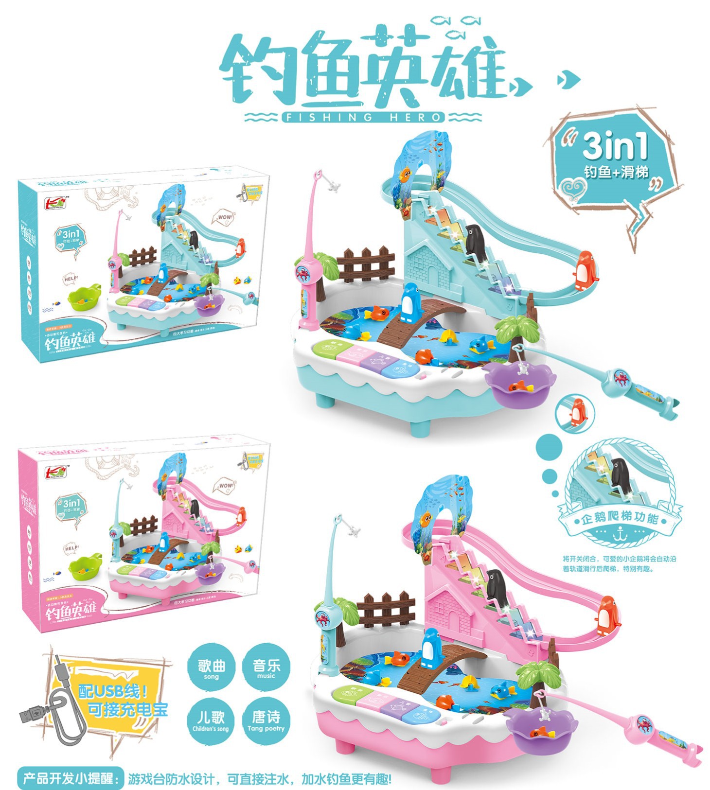 • 핑크 [계단을 오르는 펭귄 낚시대] 배터리 버전