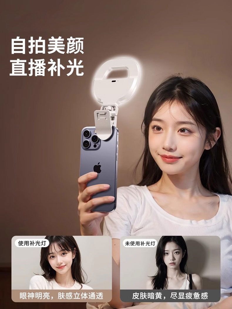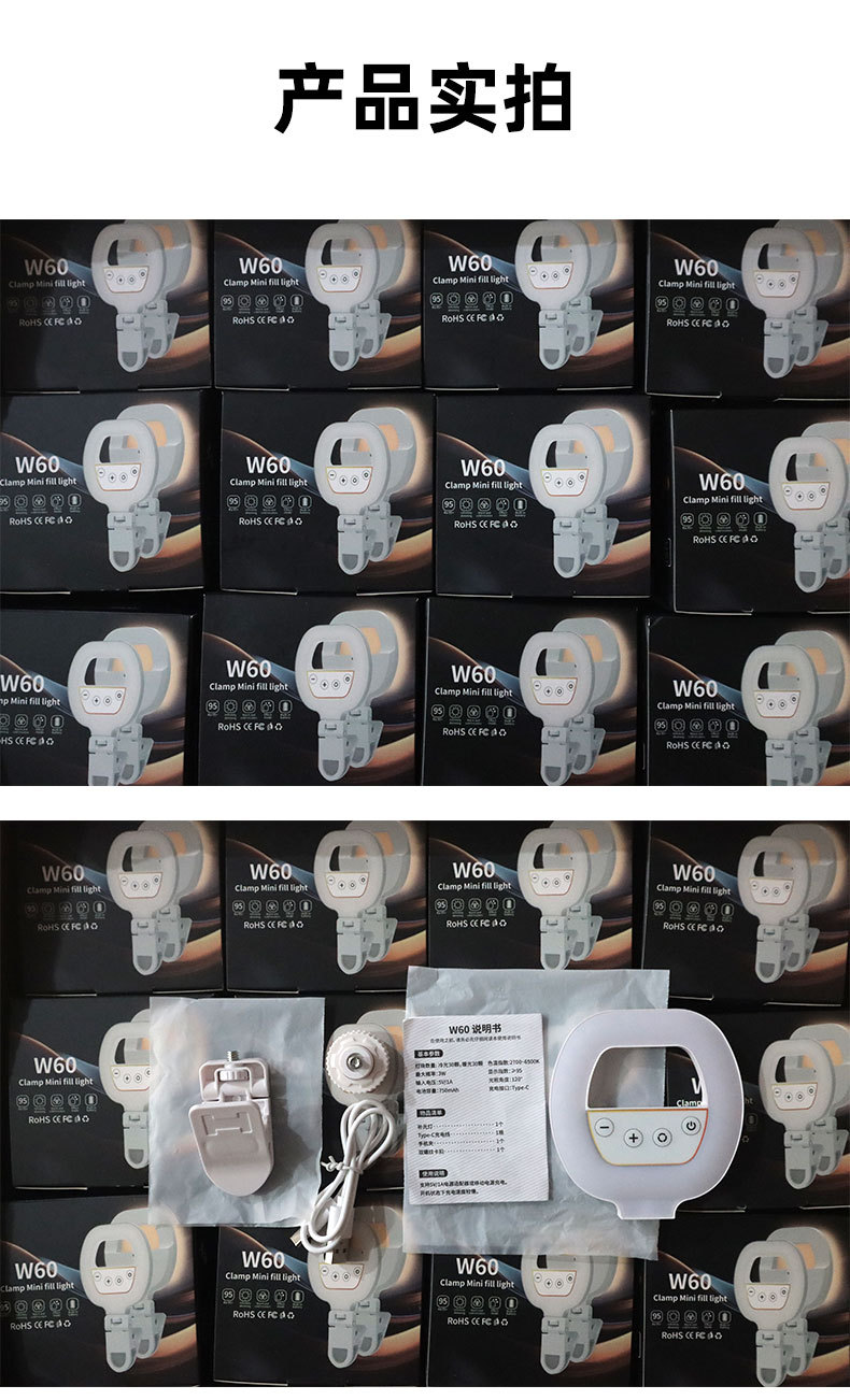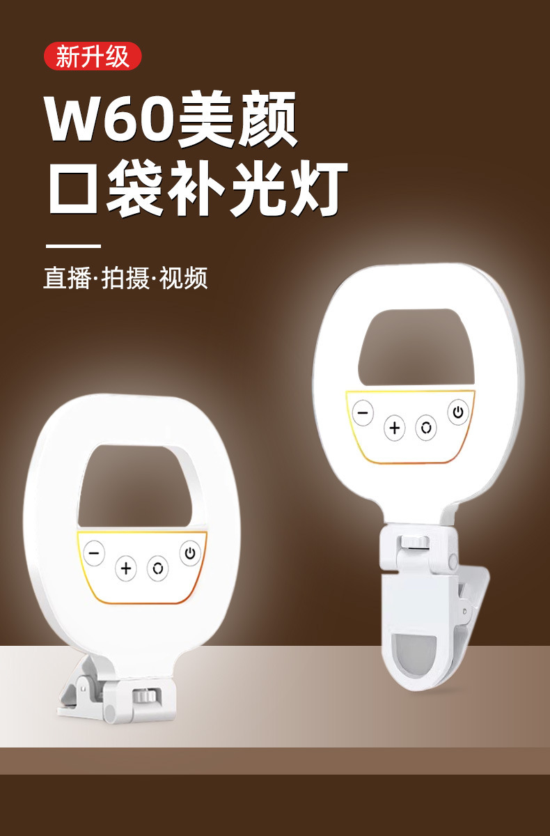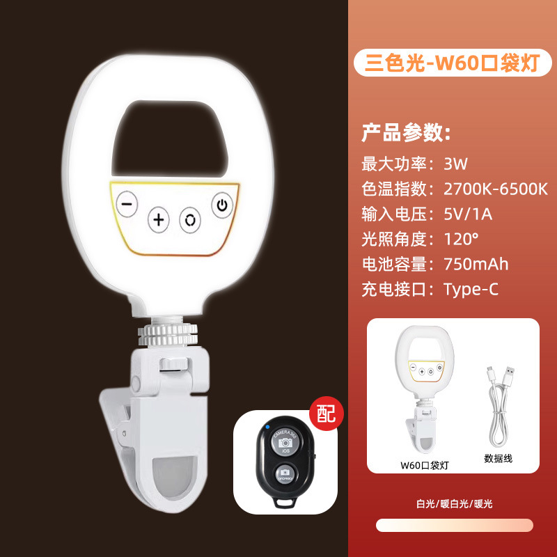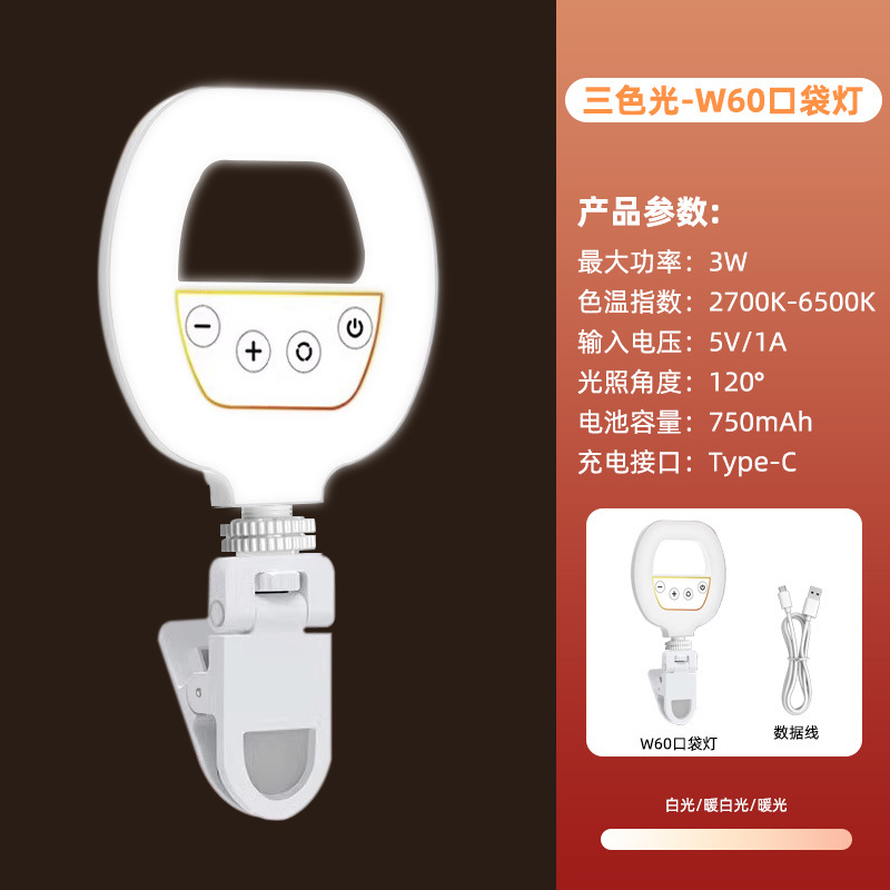 휴대 전화 라이브 사진 채우기 빛 휴대용 LED 셀카 클립 조명 충전 링 뷰티 라이트 W60 포켓 라이트
