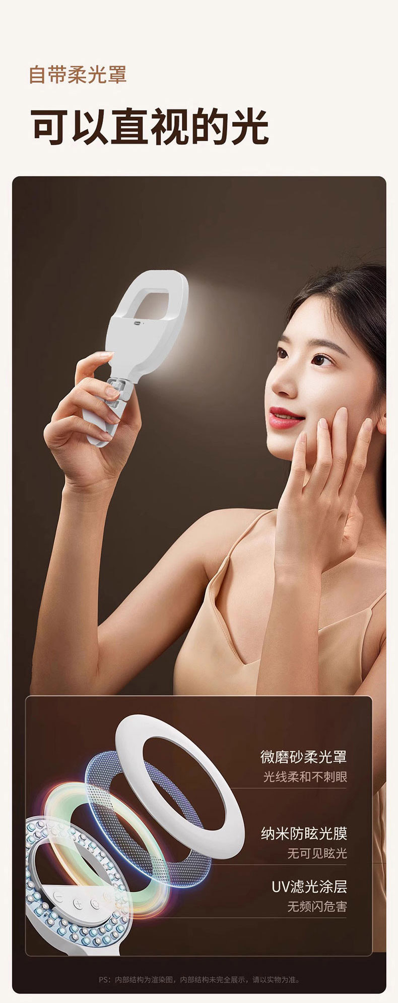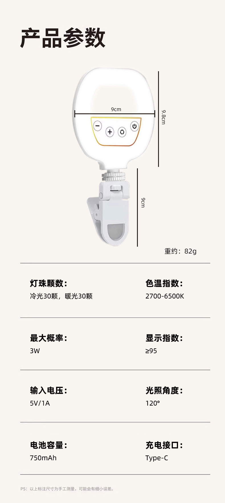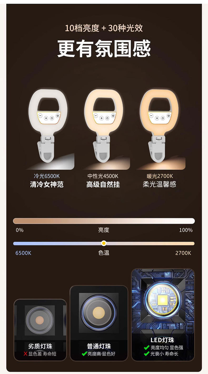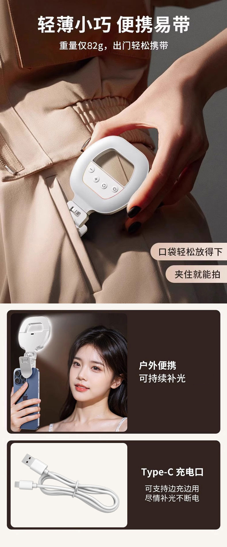 휴대 전화 라이브 사진 채우기 빛 휴대용 LED 셀카 클립 조명 충전 링 뷰티 라이트 W60 포켓 라이트