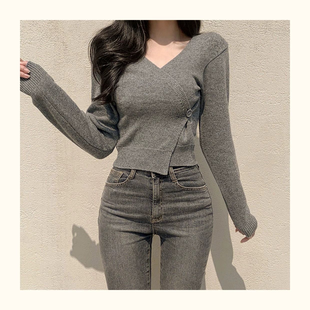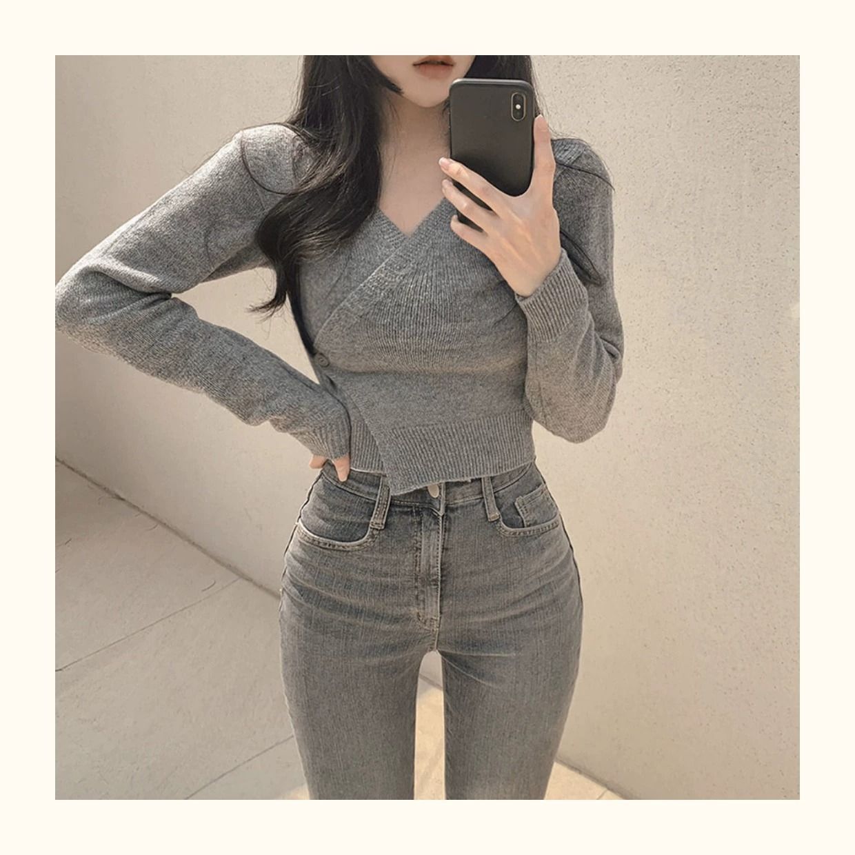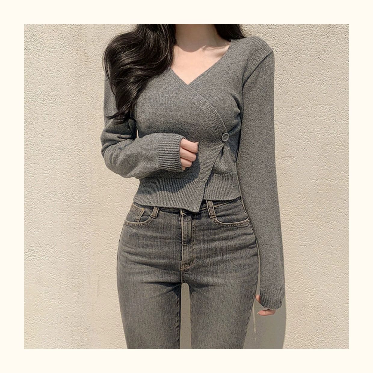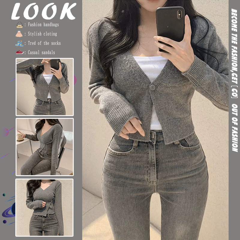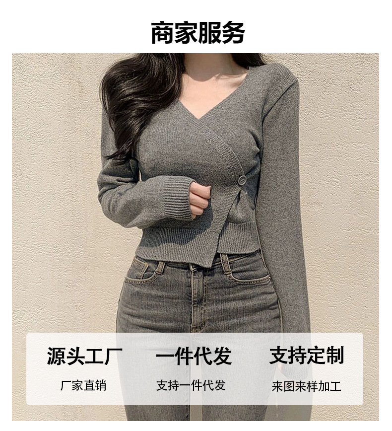 순수한 욕망 스타일 달콤하고 매운 V 넥 울 스웨터 여성의 2024 가을 및 겨울 새로운 슬림 핏 솔리드 컬러 슬리밍 짧은 긴팔 탑스토어 가기