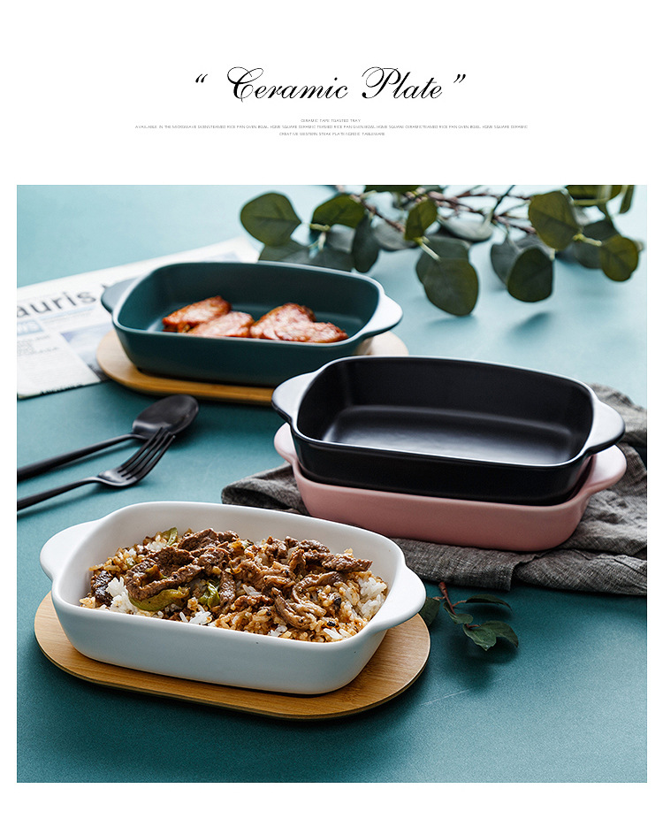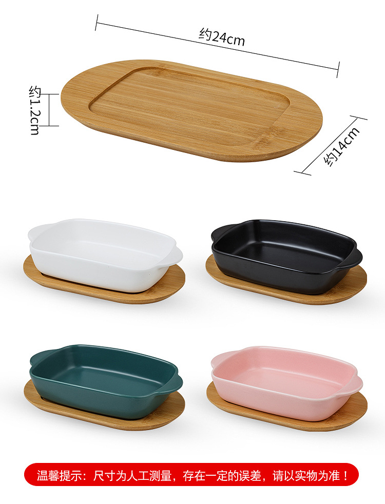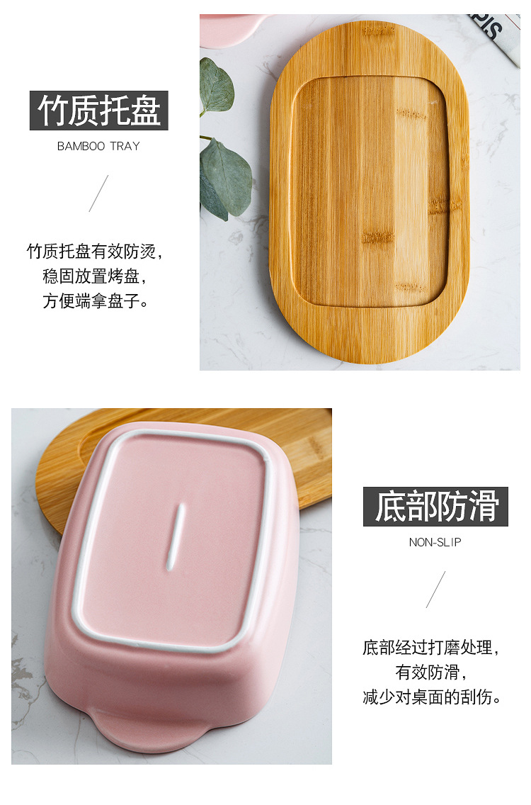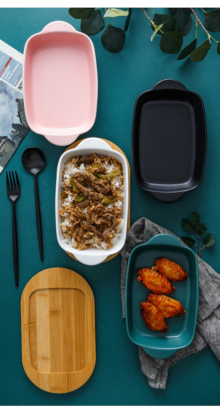 나무 커버 트레이가있는 이진 베이킹 플레이트 오븐 세라믹 플레이트 전자 레인지 베이킹 플레이트 구운 쌀 플레이트 홈 조식 플레이트