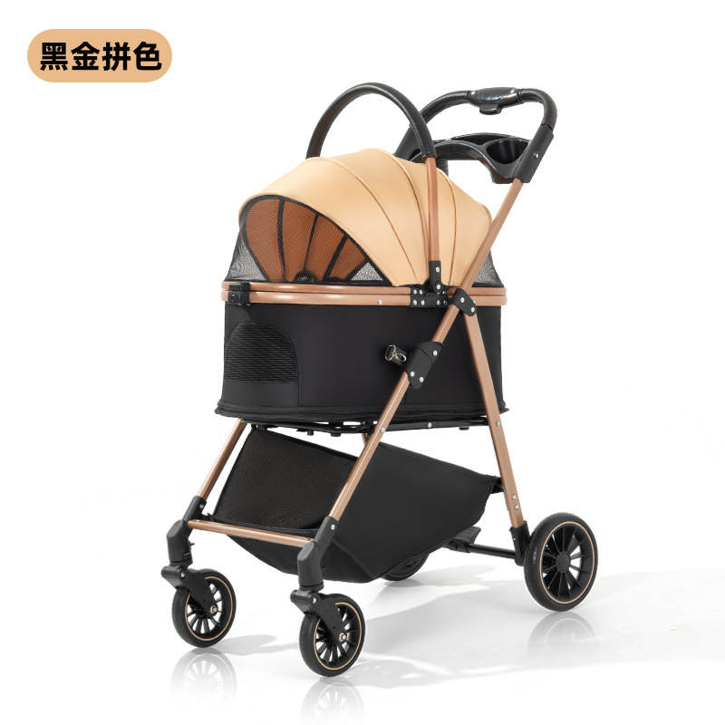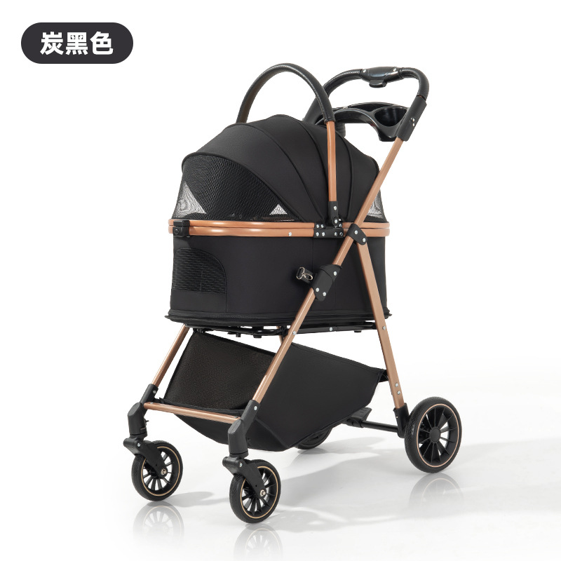 本产品为中小型宠物推车,标配餐盘和底筐,可选配防雨罩和便携挂包。