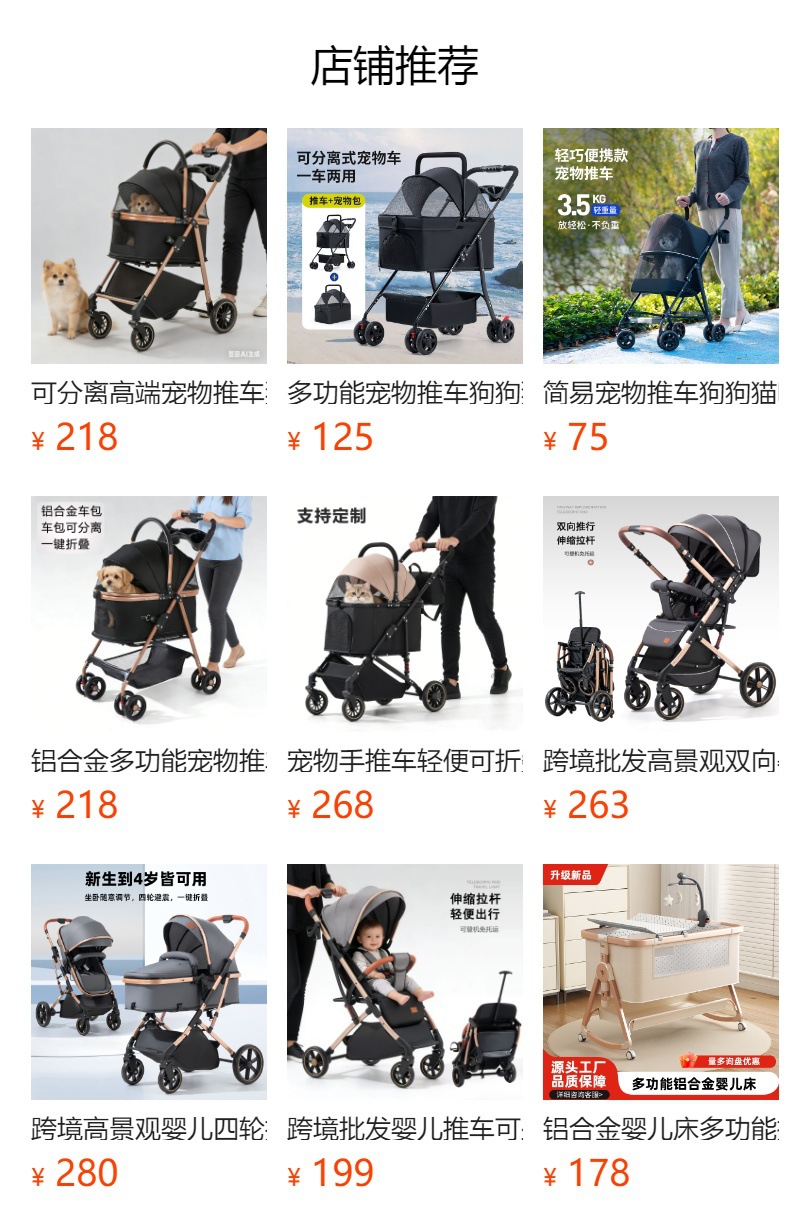 功能:推车和提篮是可分离的,推车可一键折叠,折叠时可不拆提篮,提篮也可以折叠,推车配有遛宠物挂钩。