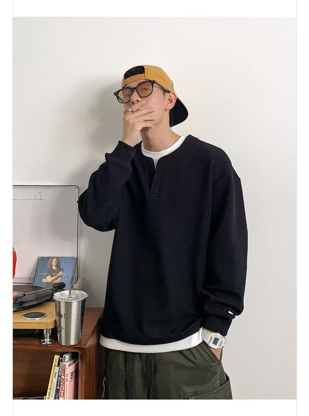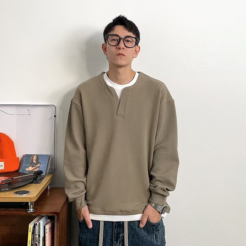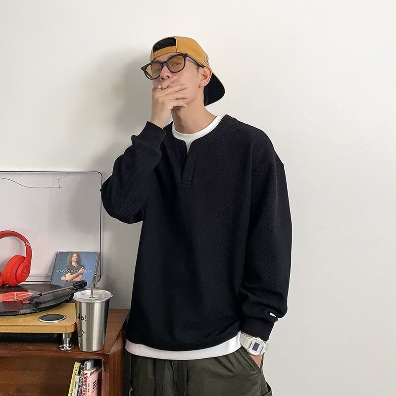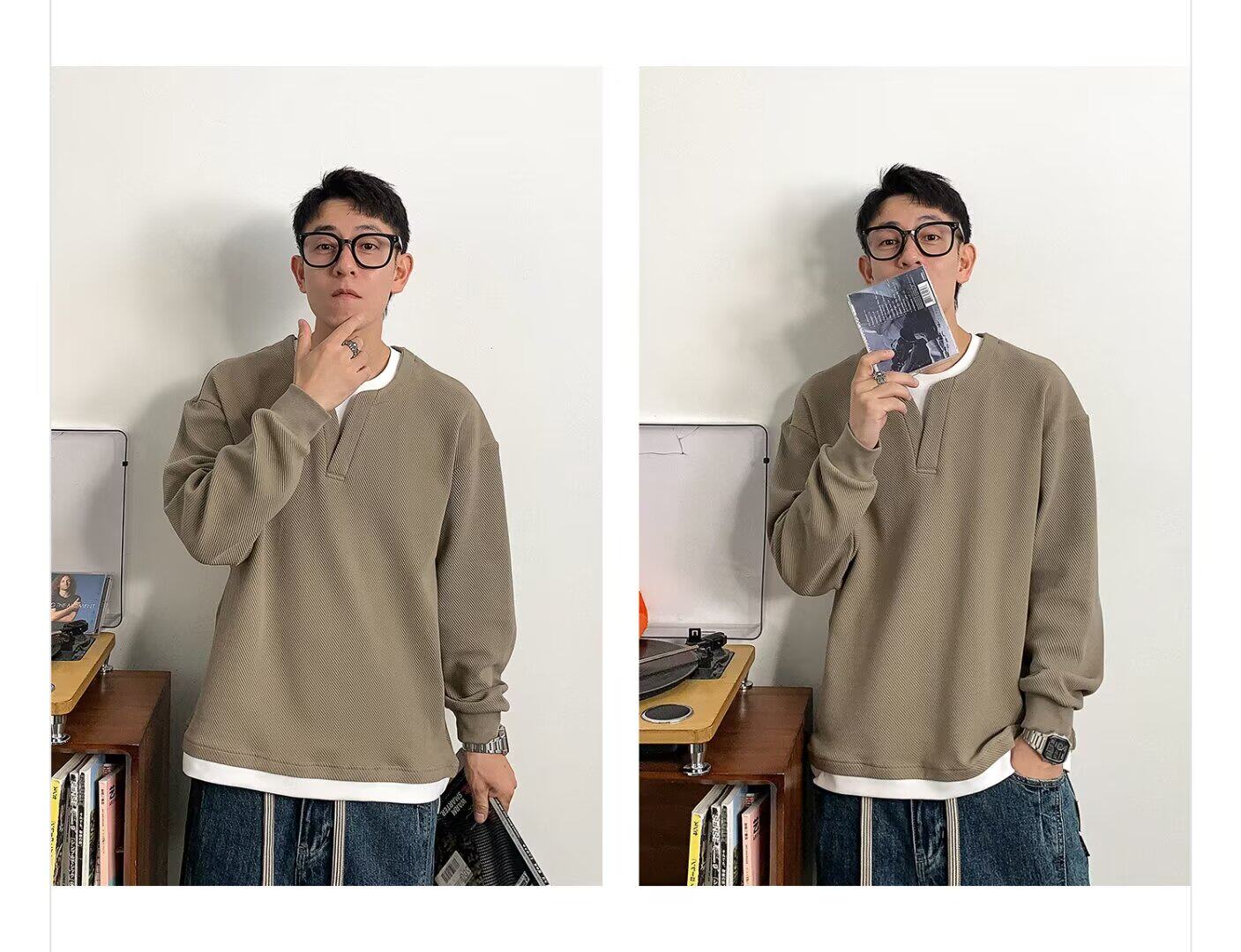 가짜 투피스 바느질 질감 가을 및 겨울 유행 디자인 크루 넥 스웨트 셔츠 남자의 무거운 긴팔 재킷스토어 가기