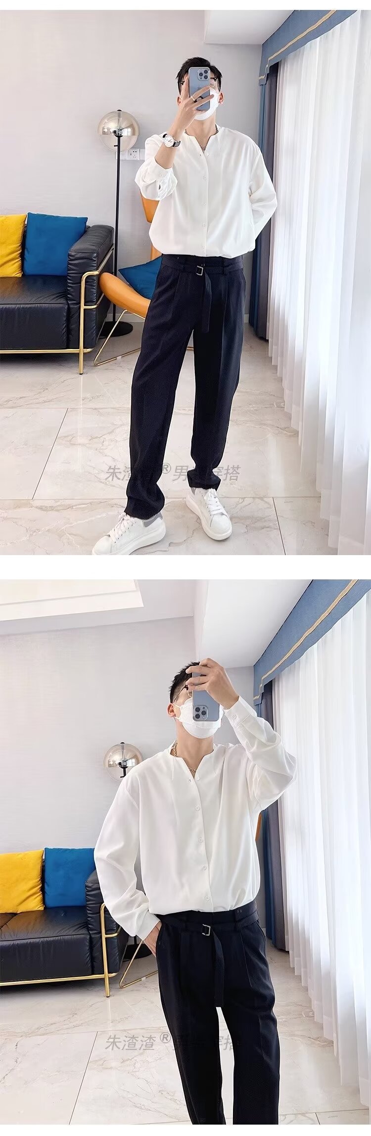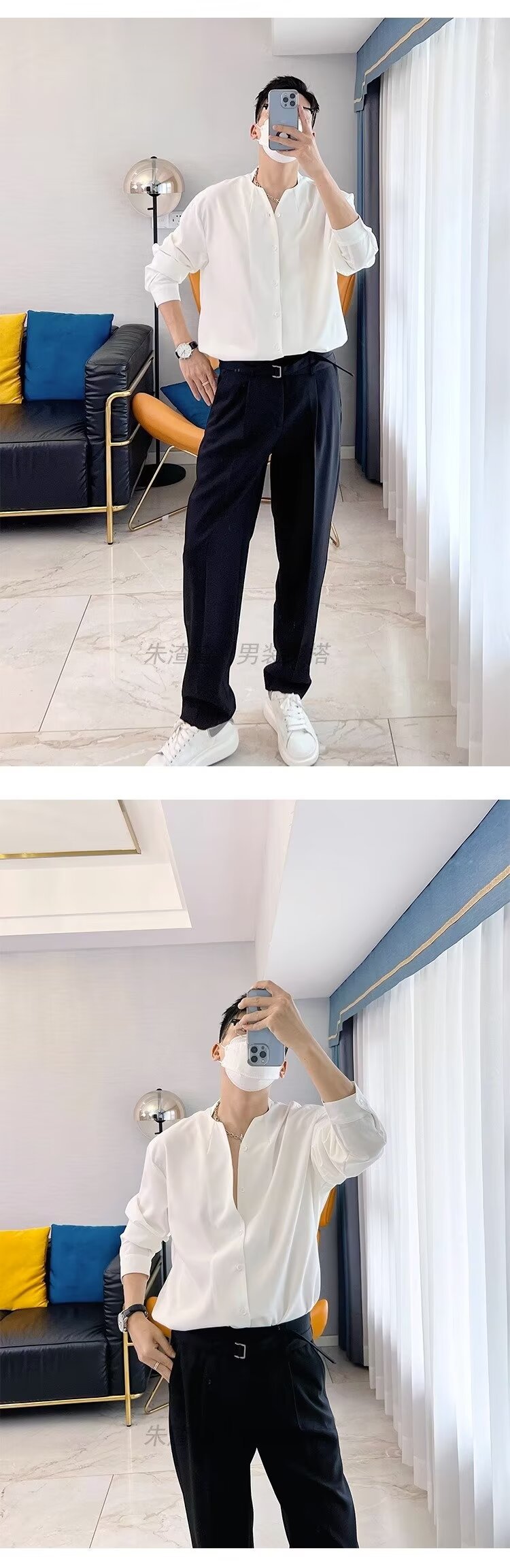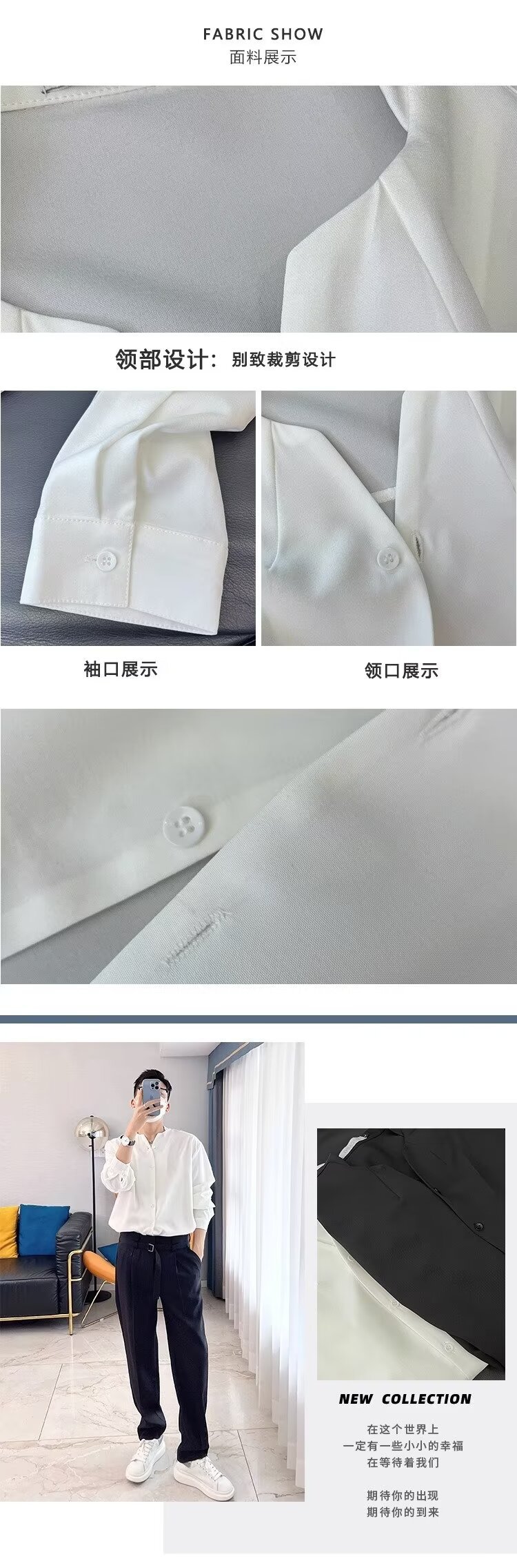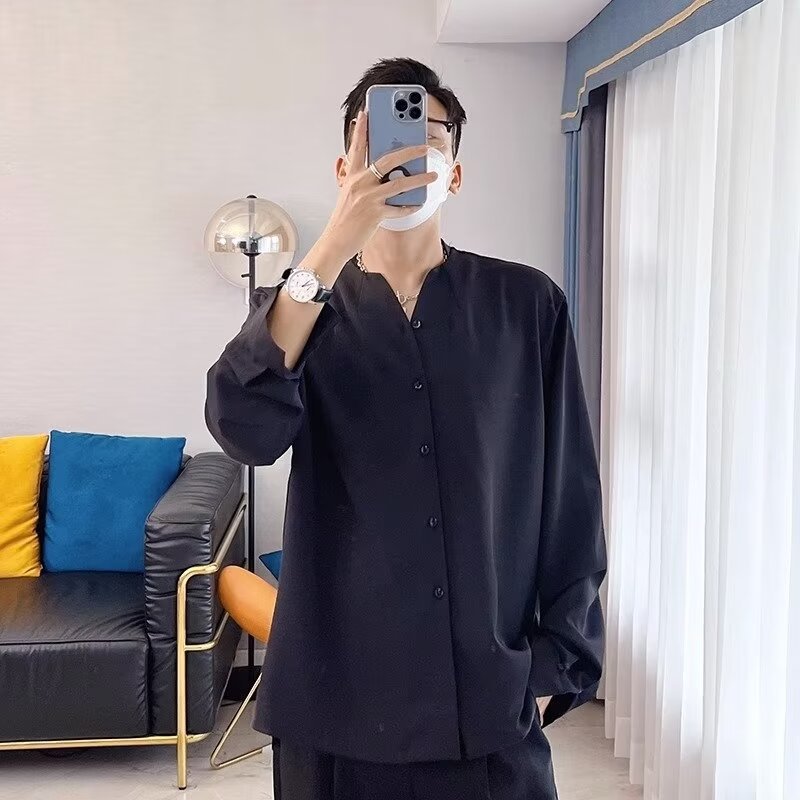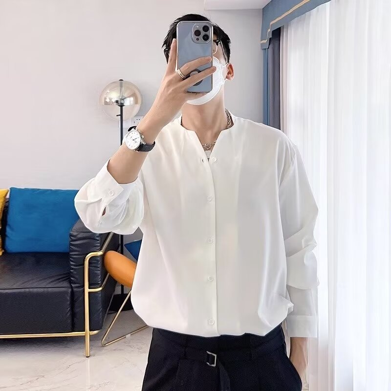 금욕 스타일 화이트 셔츠 남성 디자인 센스 V 넥 긴팔 탑 세트 내부 셔츠 비 다림질 봄 느슨한 스타일스토어 가기