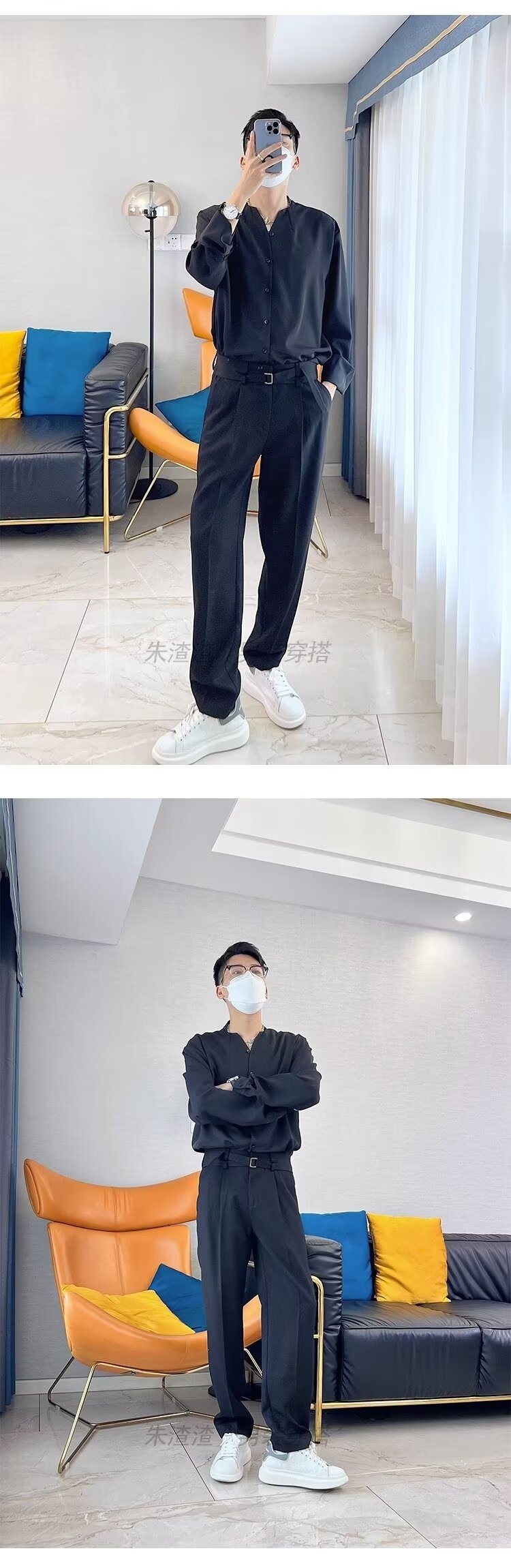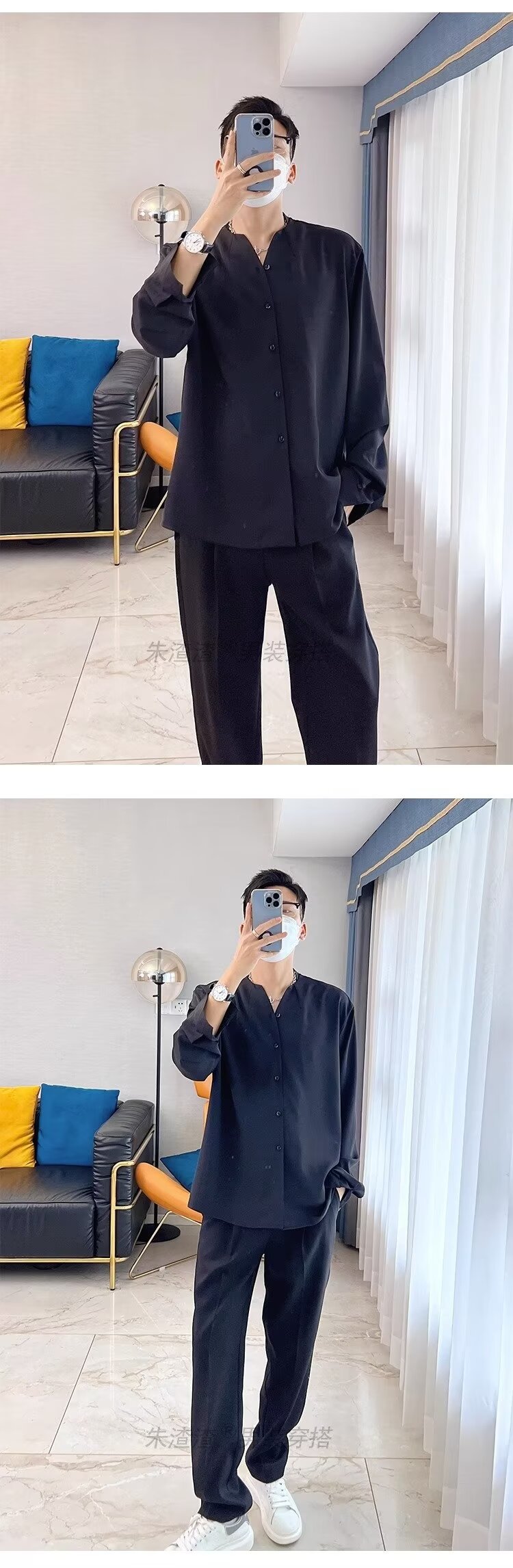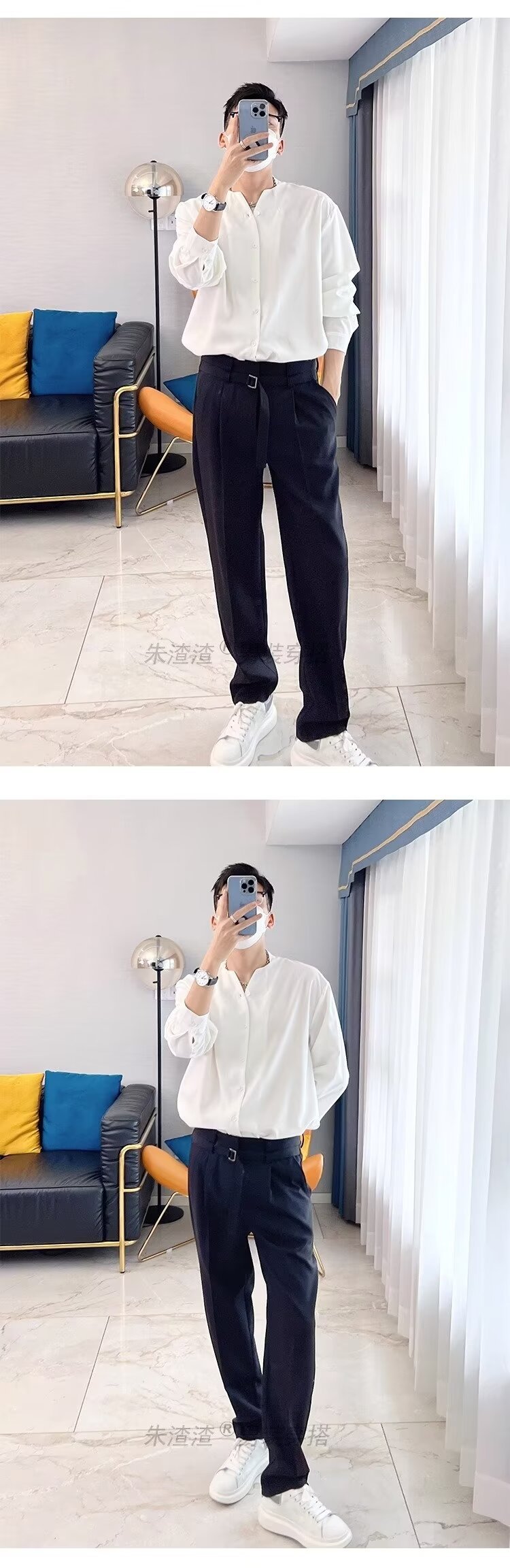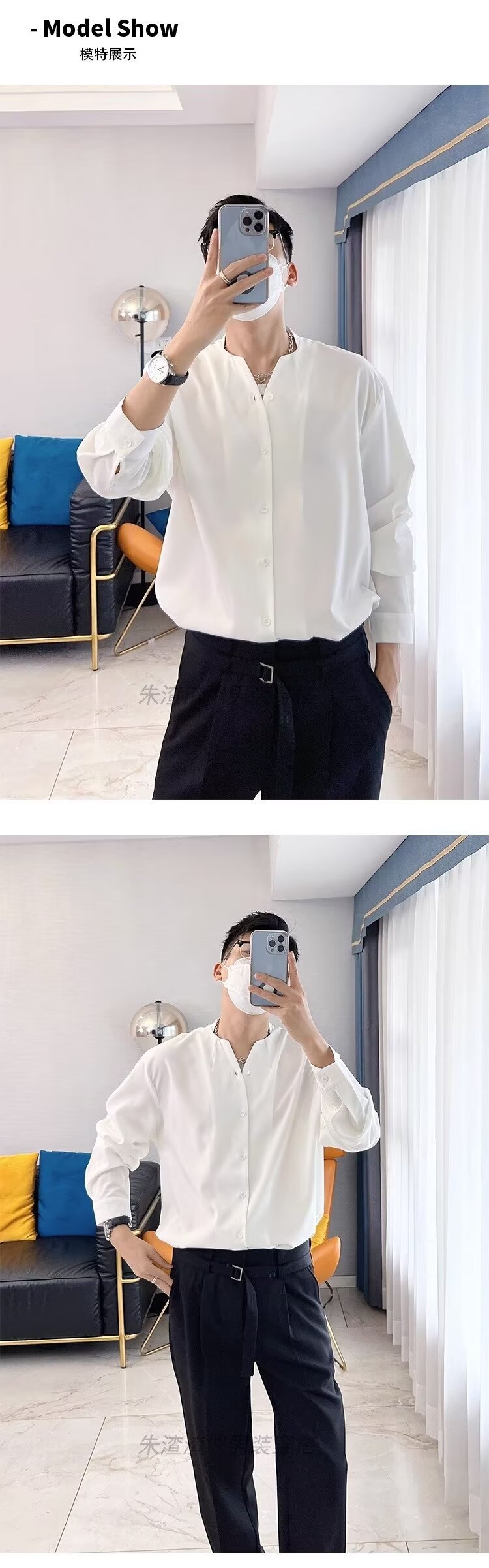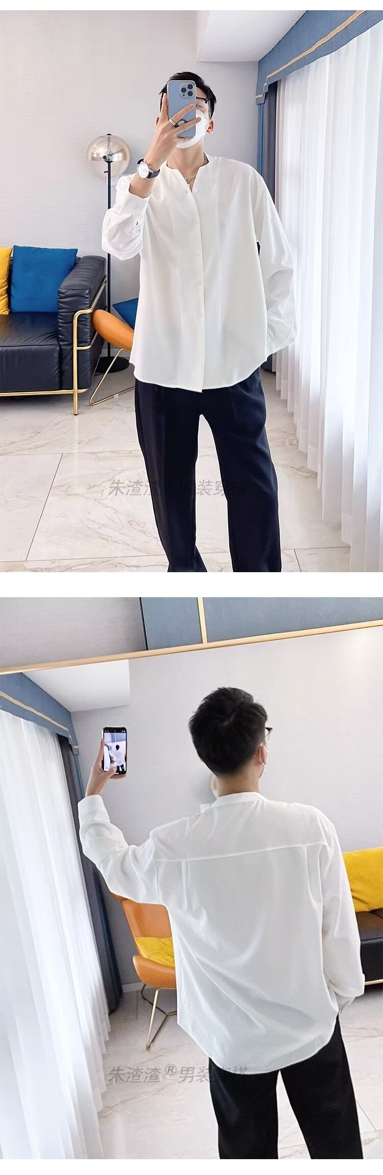 금욕 스타일 화이트 셔츠 남성 디자인 센스 V 넥 긴팔 탑 세트 내부 셔츠 비 다림질 봄 느슨한 스타일스토어 가기