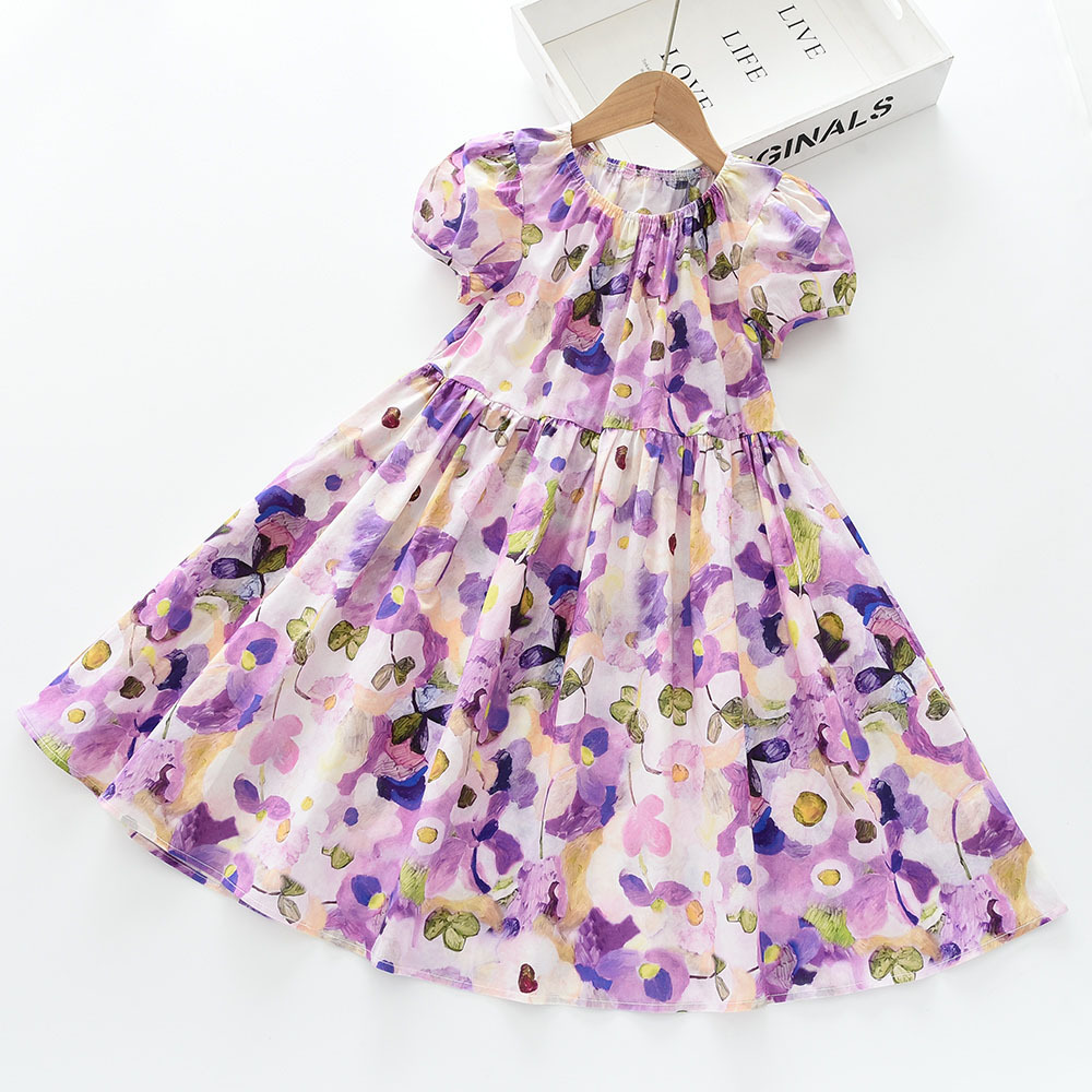 1204-05 2025 여름 새 꽃 인쇄 소녀 크루 넥 버블 짧은 소매 원피스