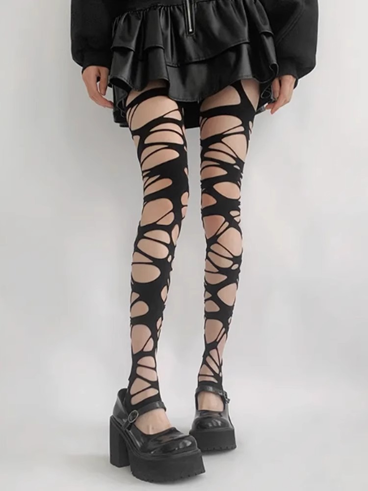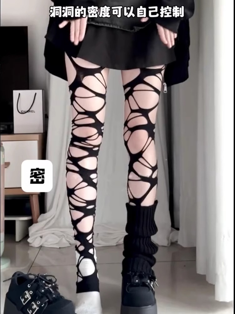 봄과 여름 검은 펑크 고딕 바람 칼 컷 파괴 낚시 그물 y2k 밀레니엄 스파이스 걸스 팬티 스타킹 여성 Ins