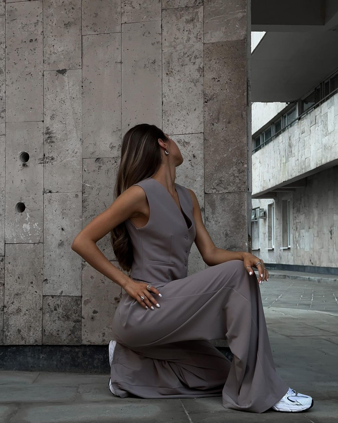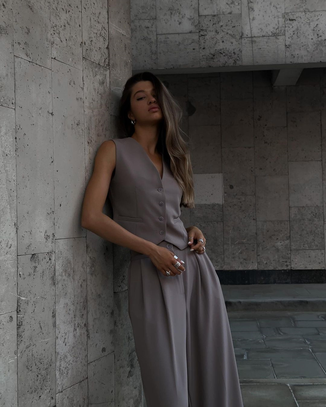 국경 간 유럽 및 미국 여성 의류 2025 봄 새로운 V 넥 민소매 조끼 드래핑 넓은 다리 바지 캐주얼 세트스토어 가기
