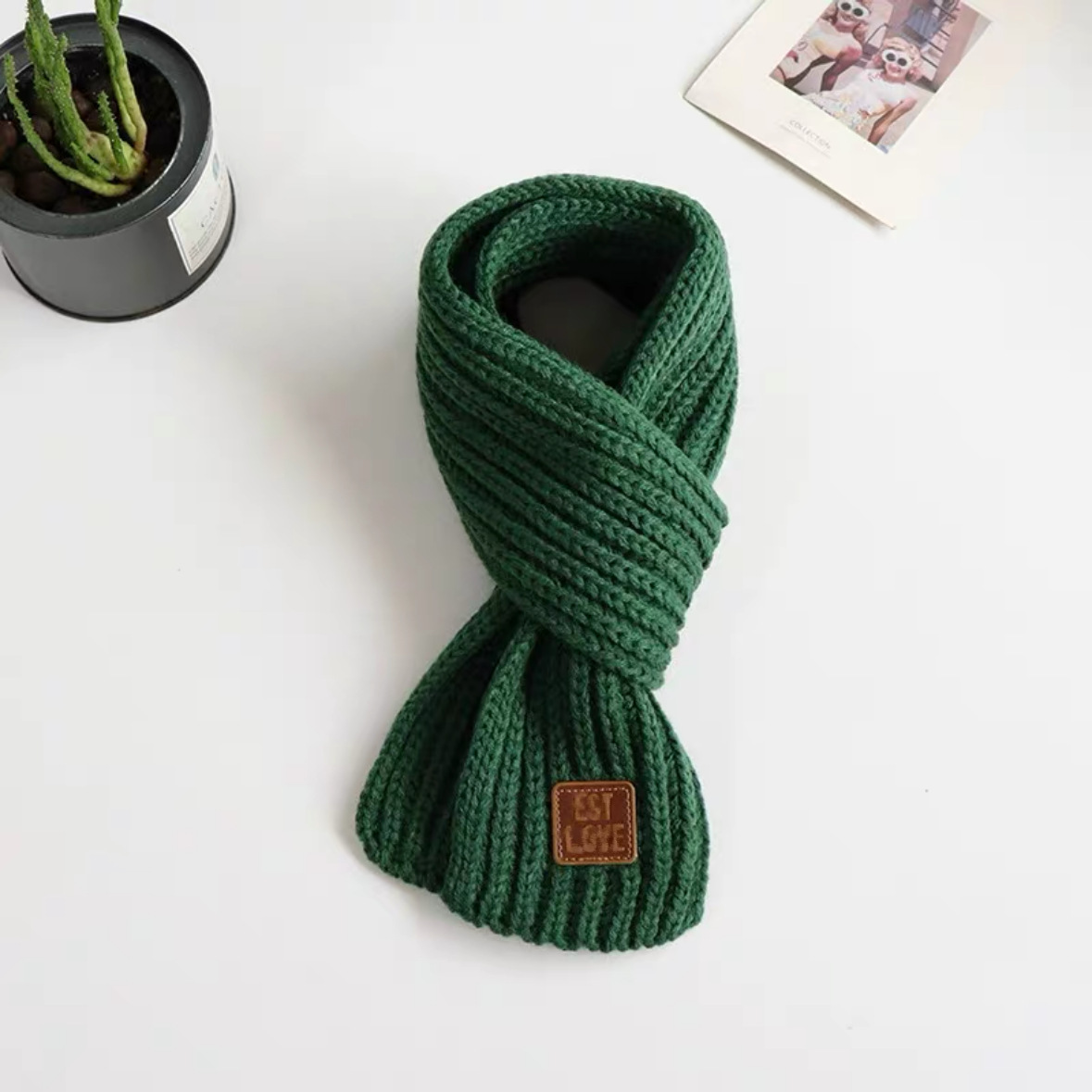 겨울 아기 소년과 소녀 따뜻한 두꺼운 한국 니트 스카프 어린이 목 보호 방풍 솔리드 컬러 가죽 라벨 스카프