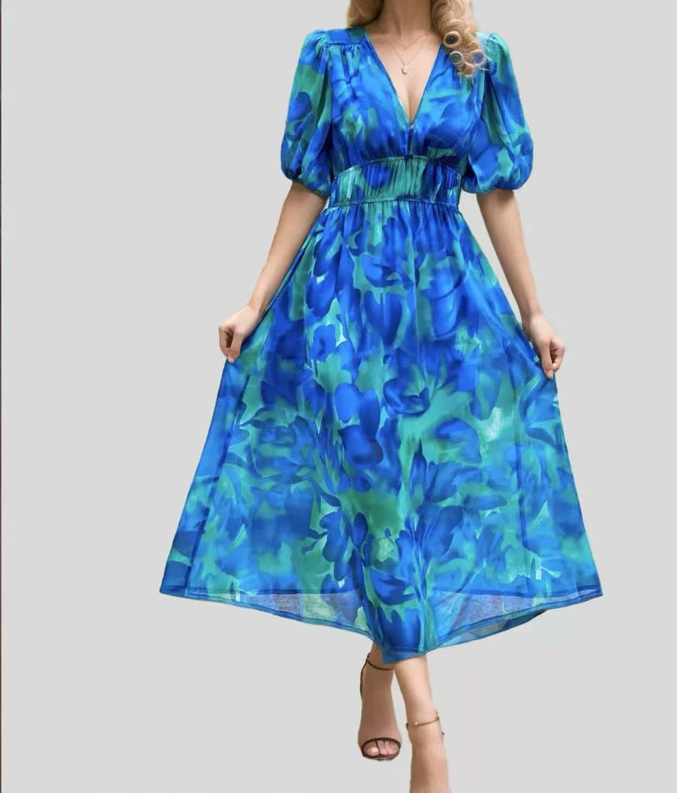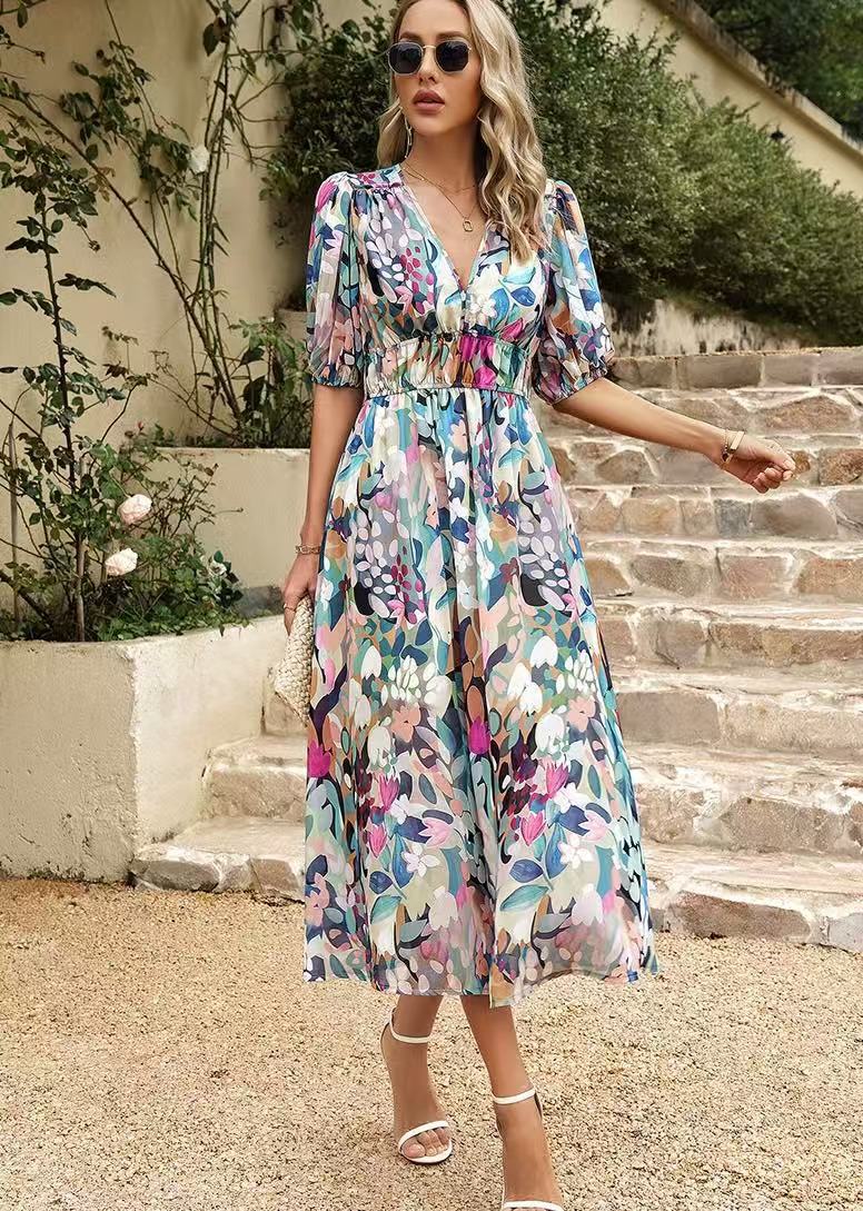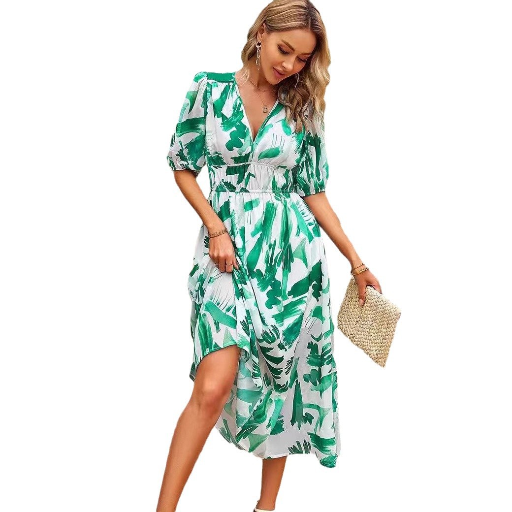 유럽과 미국 아마존 원피스 봄과 여름 의류 폭발 V 칼라 인쇄 허리 원피스 패션 여성의 대외 무역 도매