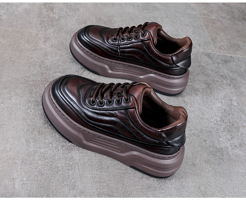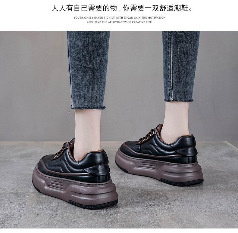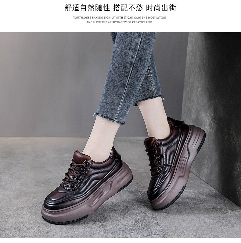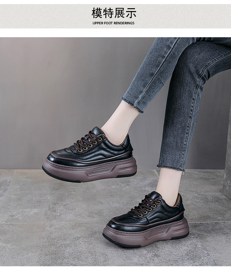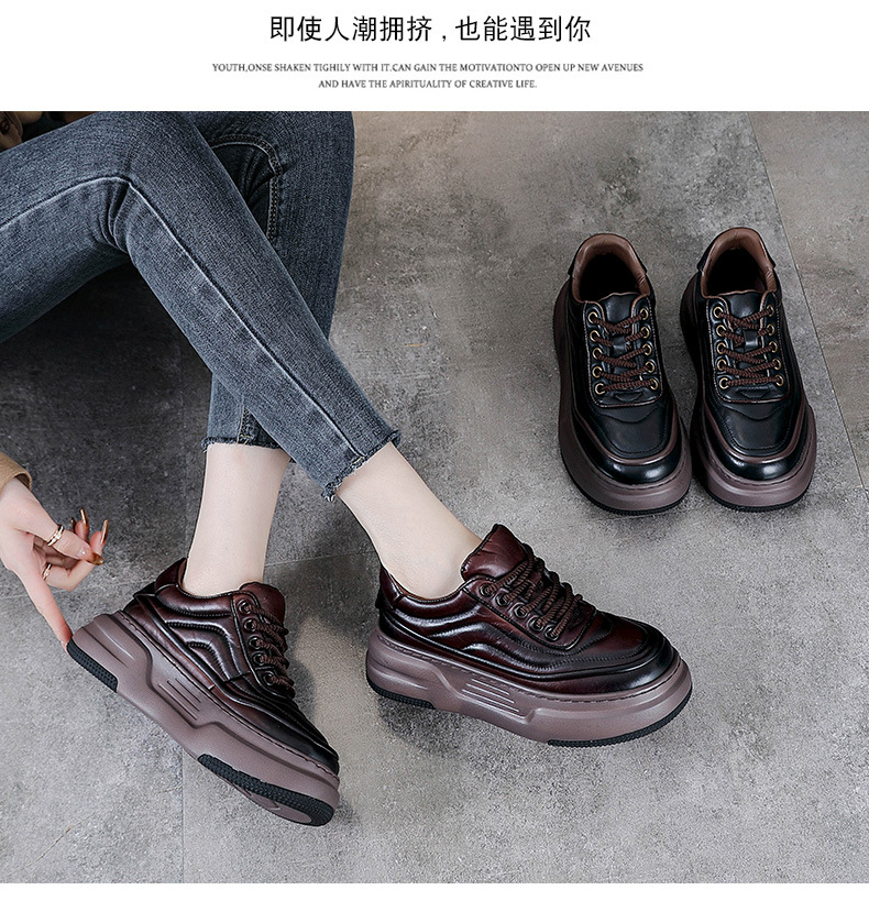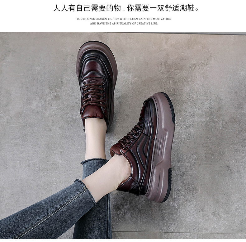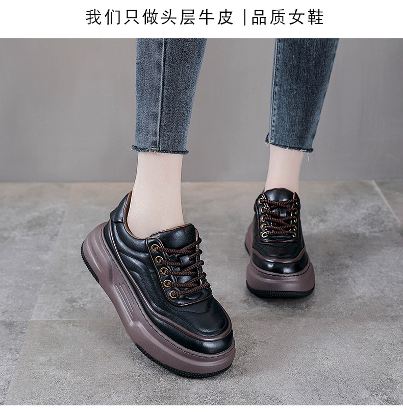 탑 레이어 소 가죽 두꺼운 밑창 신발 여성 캐주얼 스케이트 신발 2025 봄과 가을 새로운 머핀 정품 가죽 빈티지 빵 여성 신발