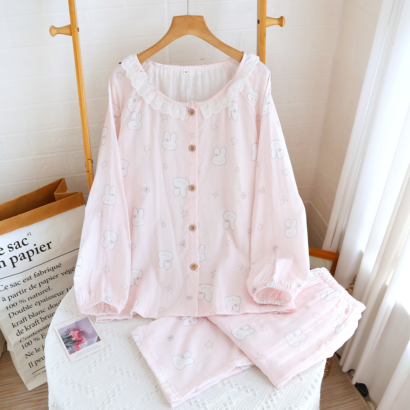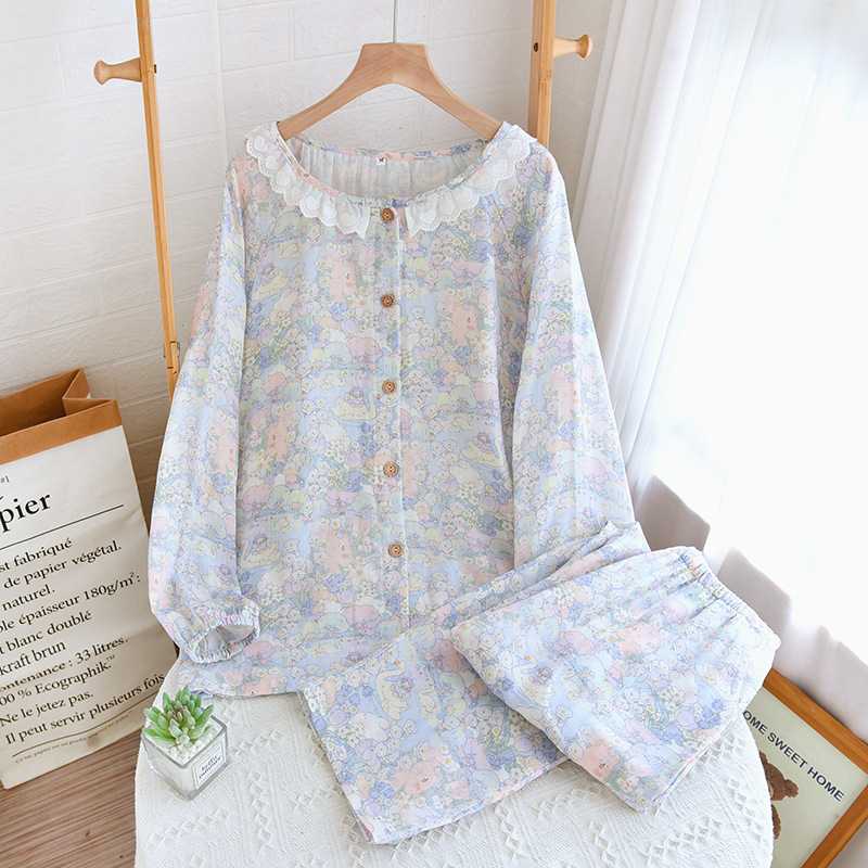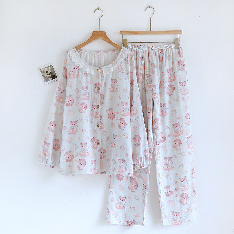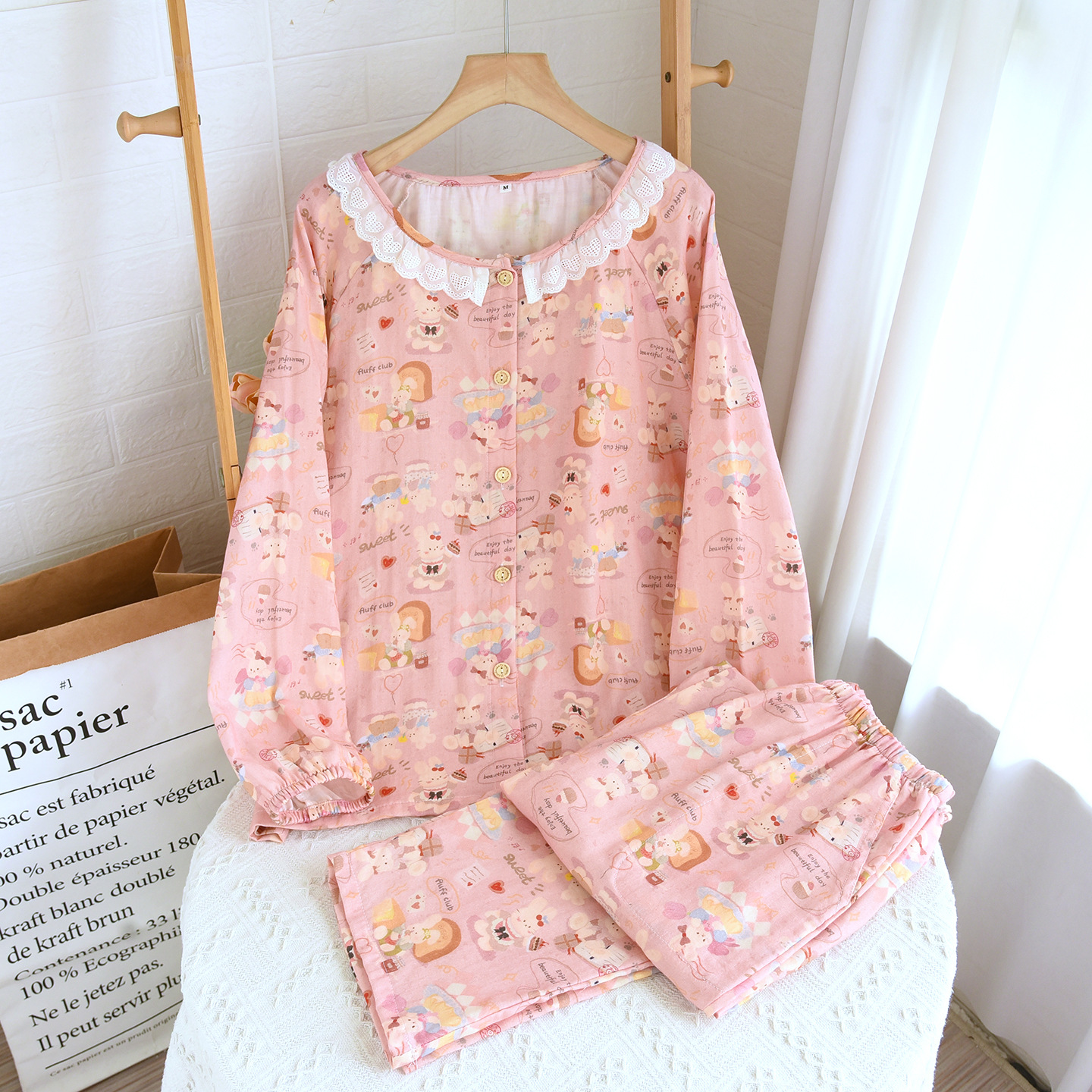 여성 봄과 가을 캐주얼 편안한 라운드 넥 홈 의류 의류 세트 새로운 긴팔 바지 거즈 파자마