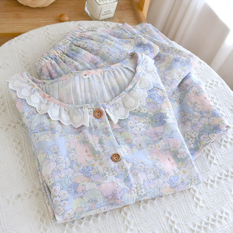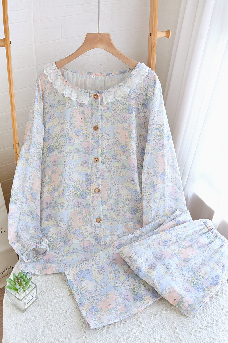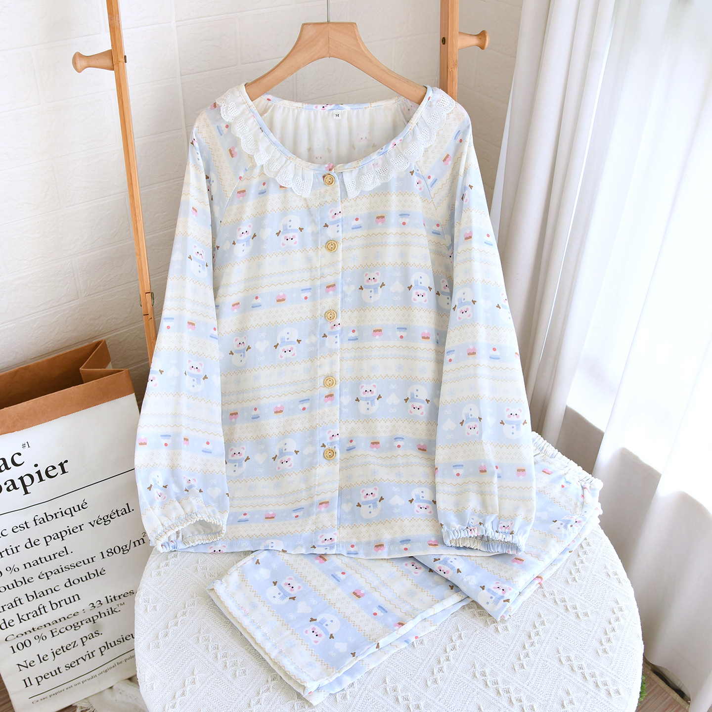 여성 봄과 가을 캐주얼 편안한 라운드 넥 홈 의류 의류 세트 새로운 긴팔 바지 거즈 파자마