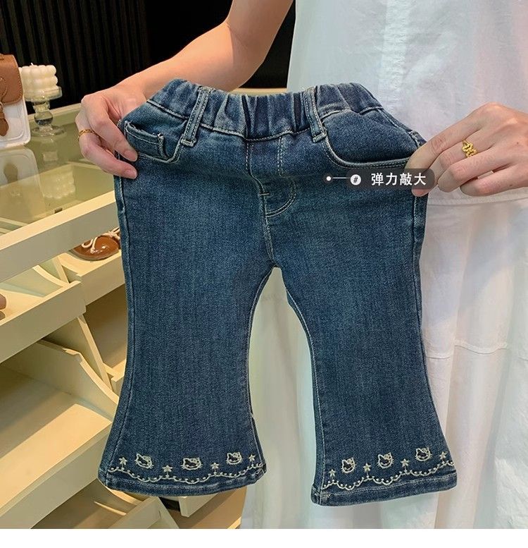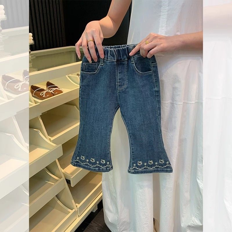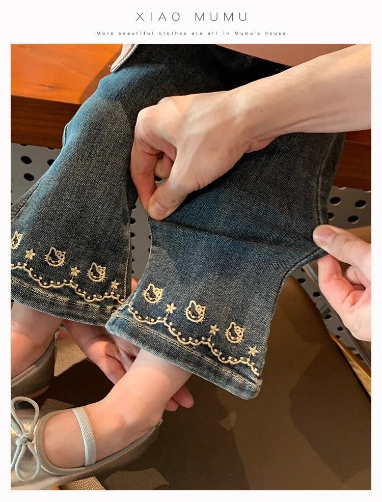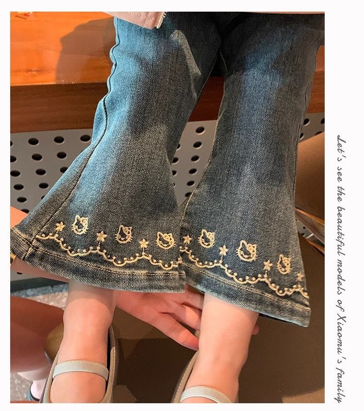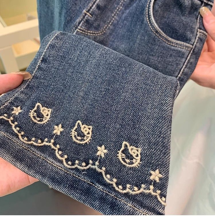 소녀 데님 꽃 바지 봄과 가을 2024 새로운 어린이 아기 소녀 가을과 겨울 고양이 자수 바지 올 매치 공주