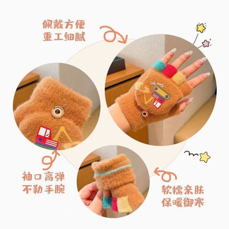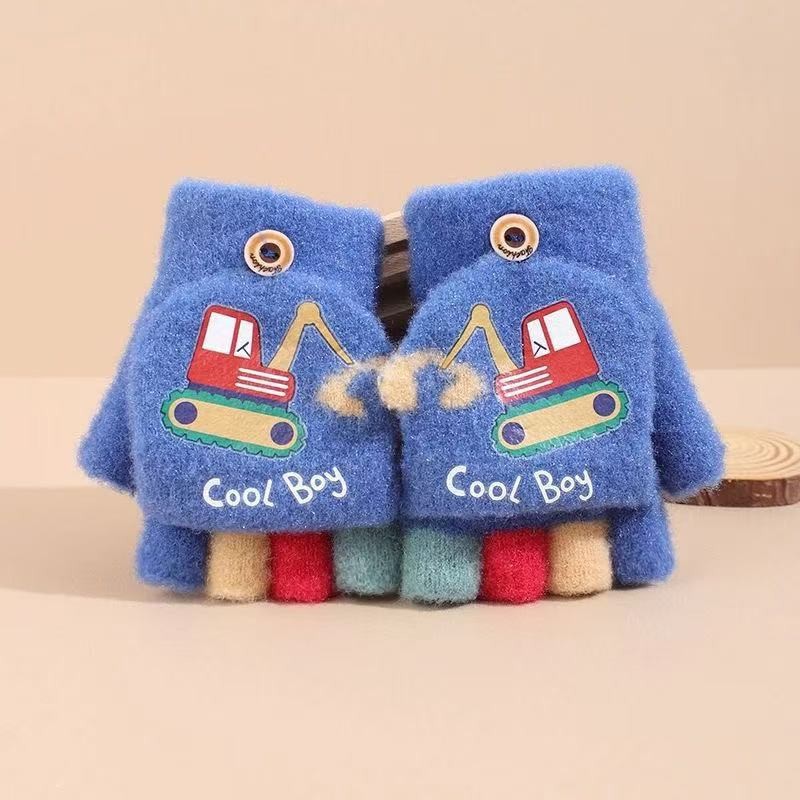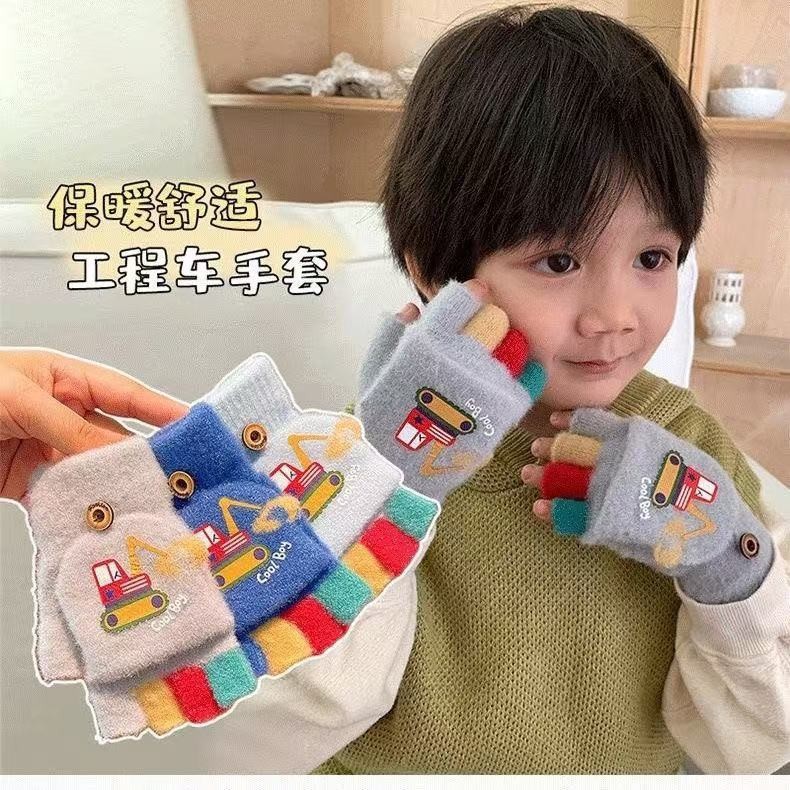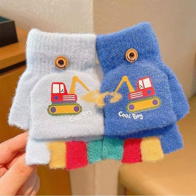 플립 니트 양모 감기 방지 따뜻한 장갑 어린이 장갑 굴삭기 소년 가을과 겨울 만화 귀여운 반 손가락