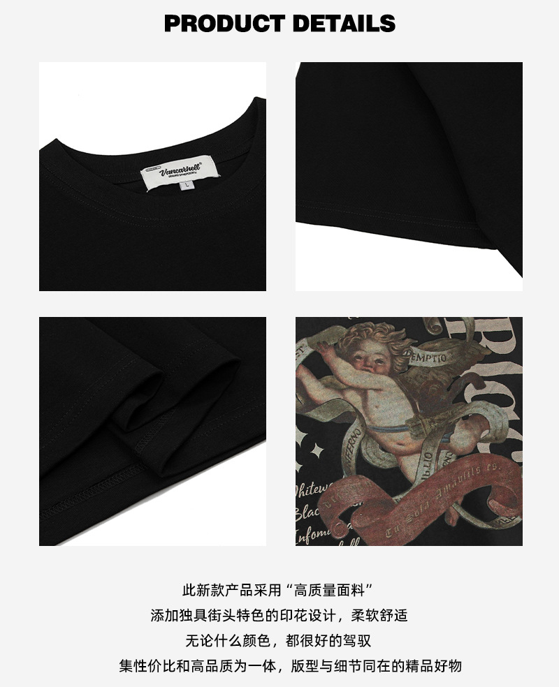 아메리칸 스타일 레트로 패션 브랜드 디자인 엔젤 프린트 반팔 티셔츠 남성 여름 새로운 느슨한 커플 캐주얼 반소매 셔츠