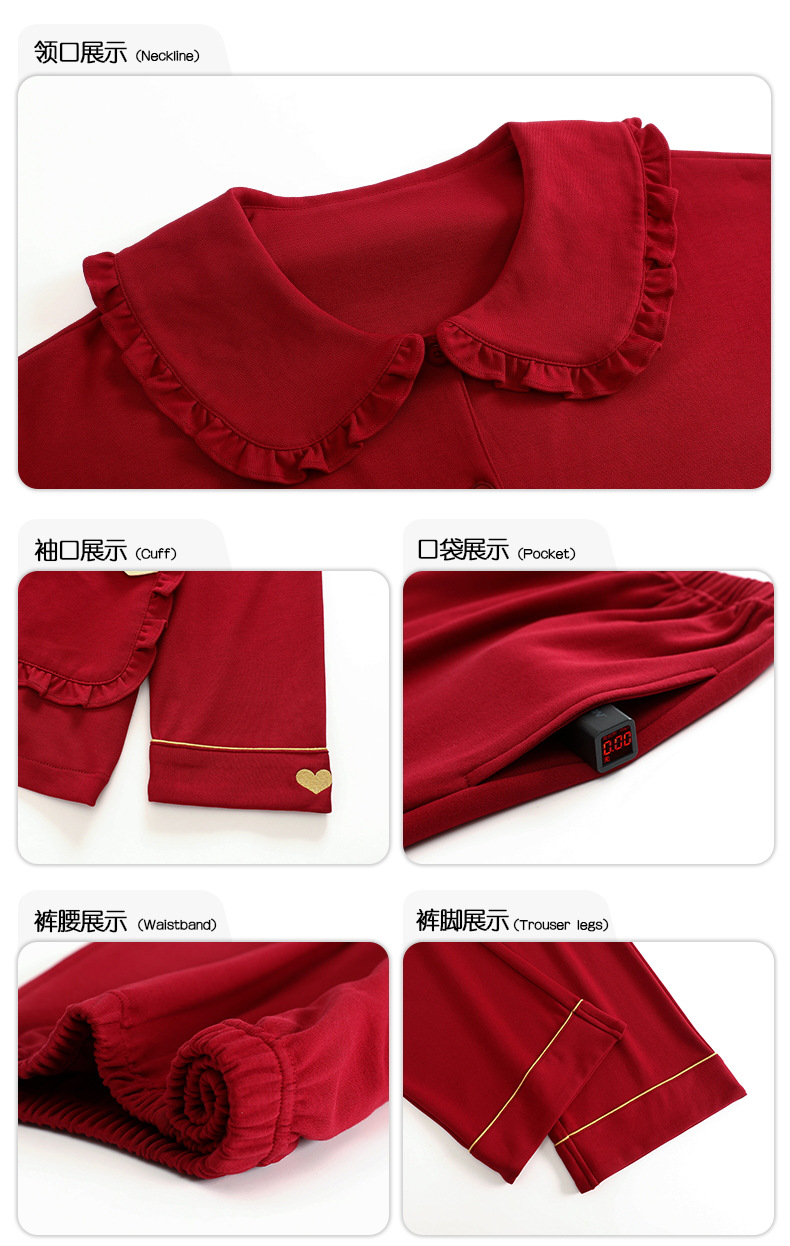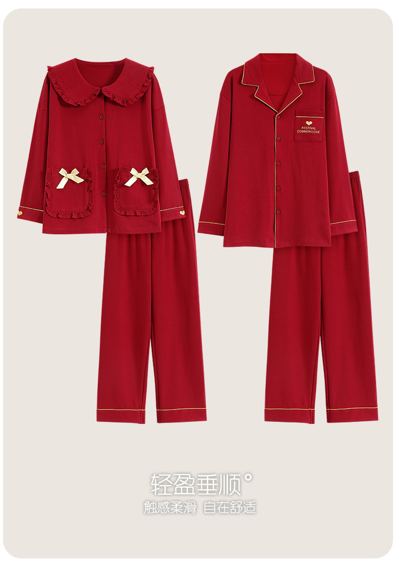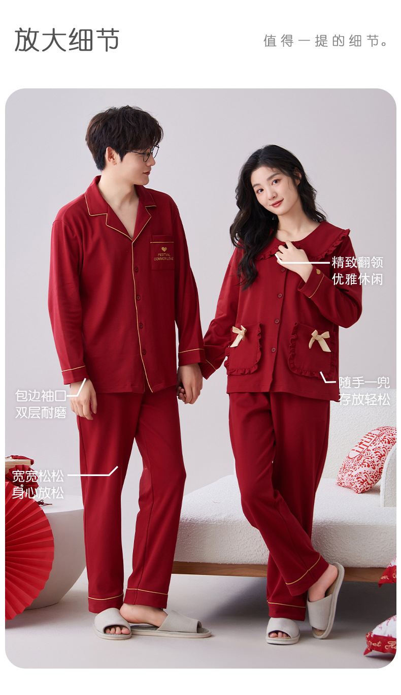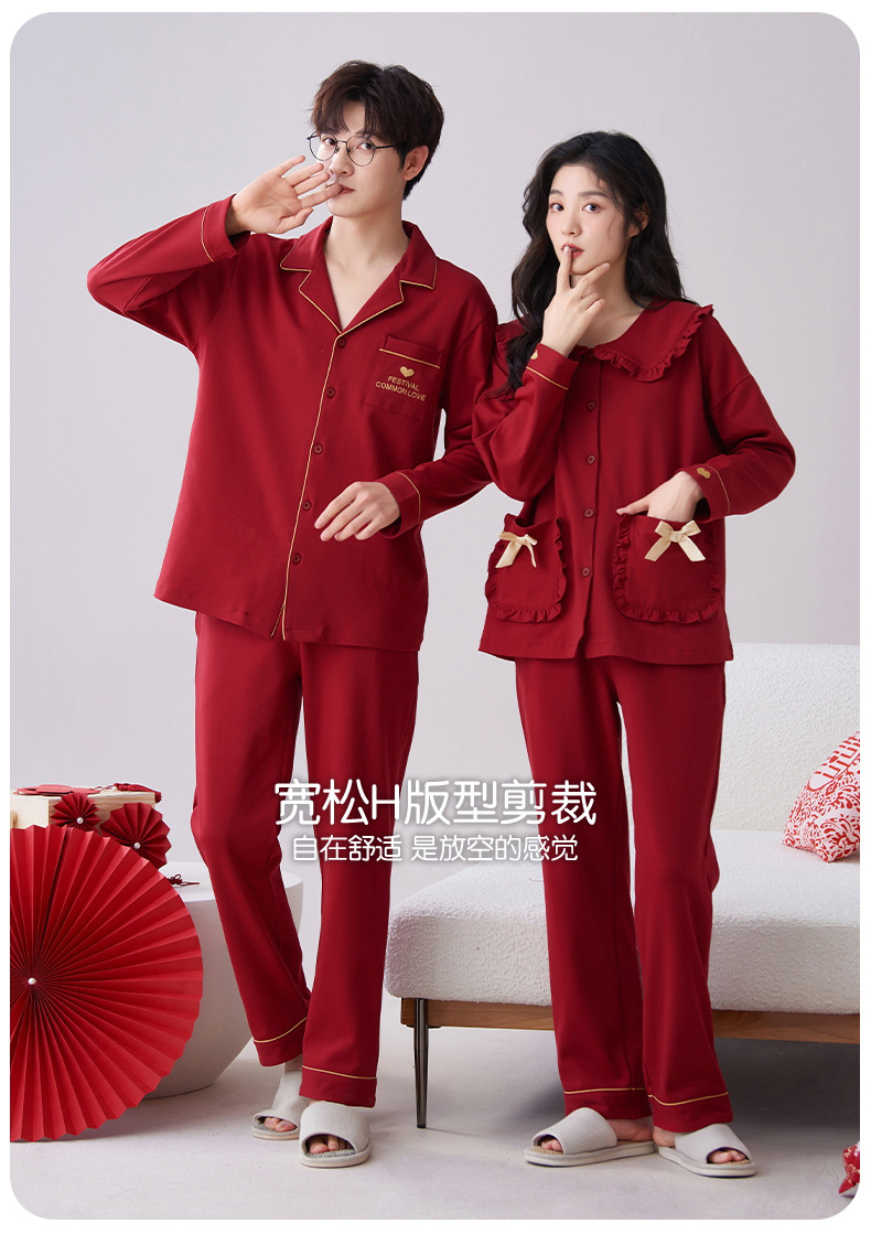 커플의 순수한면 잠옷 큰 붉은 결혼식 년 봄과 가을 긴 소매 바지 여성 생활 홈 의류 세트