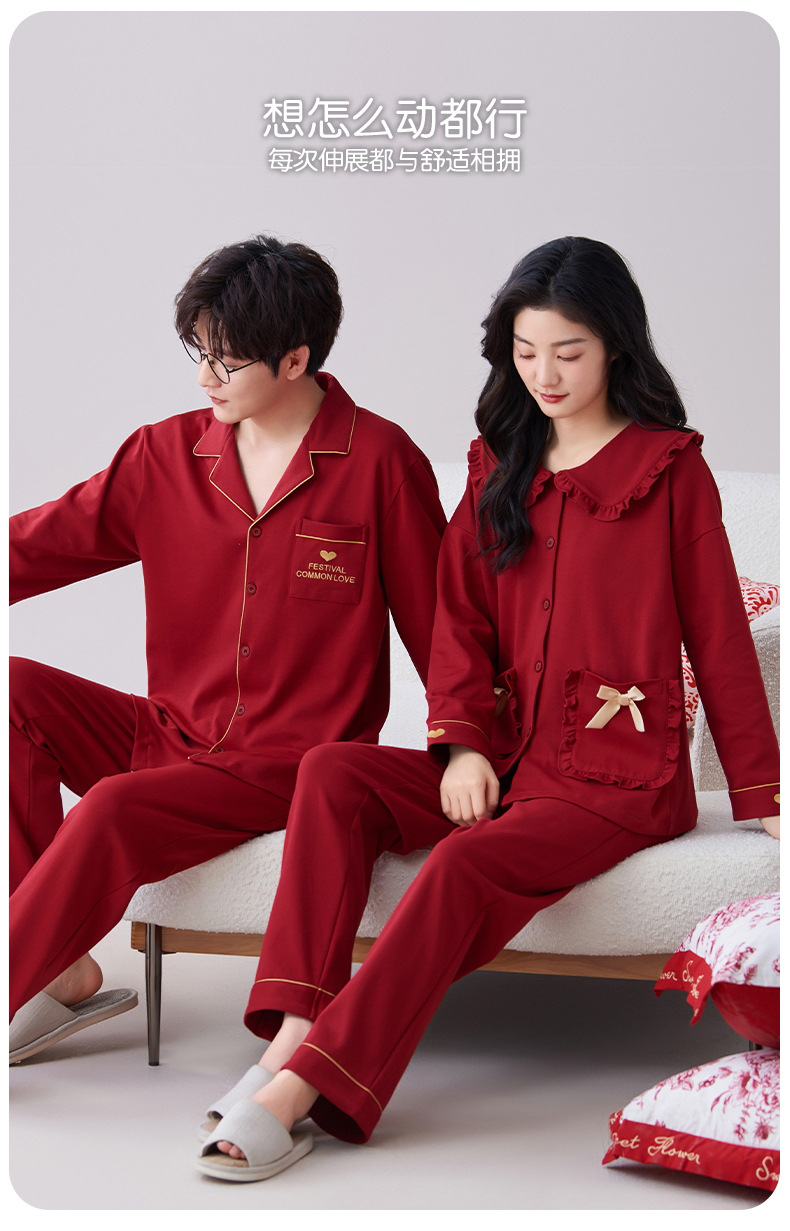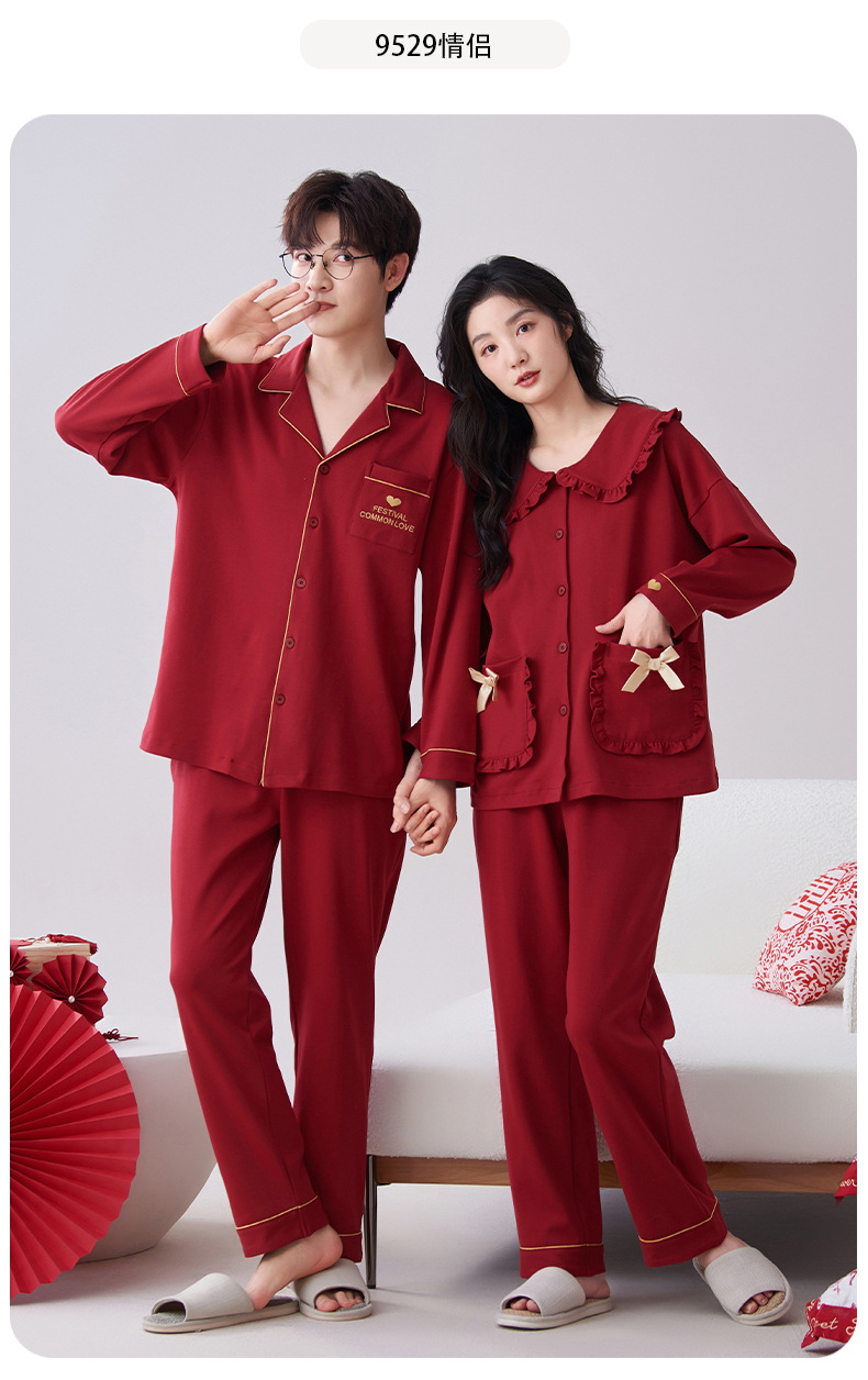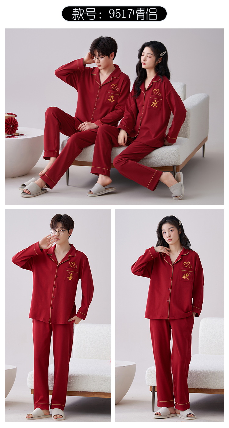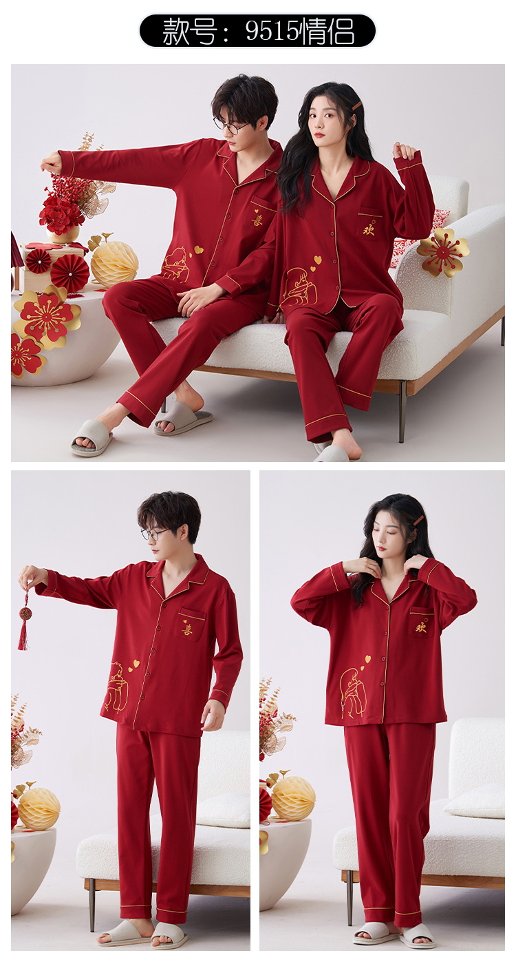 커플의 순수한면 잠옷 큰 붉은 결혼식 년 봄과 가을 긴 소매 바지 여성 생활 홈 의류 세트스토어 가기