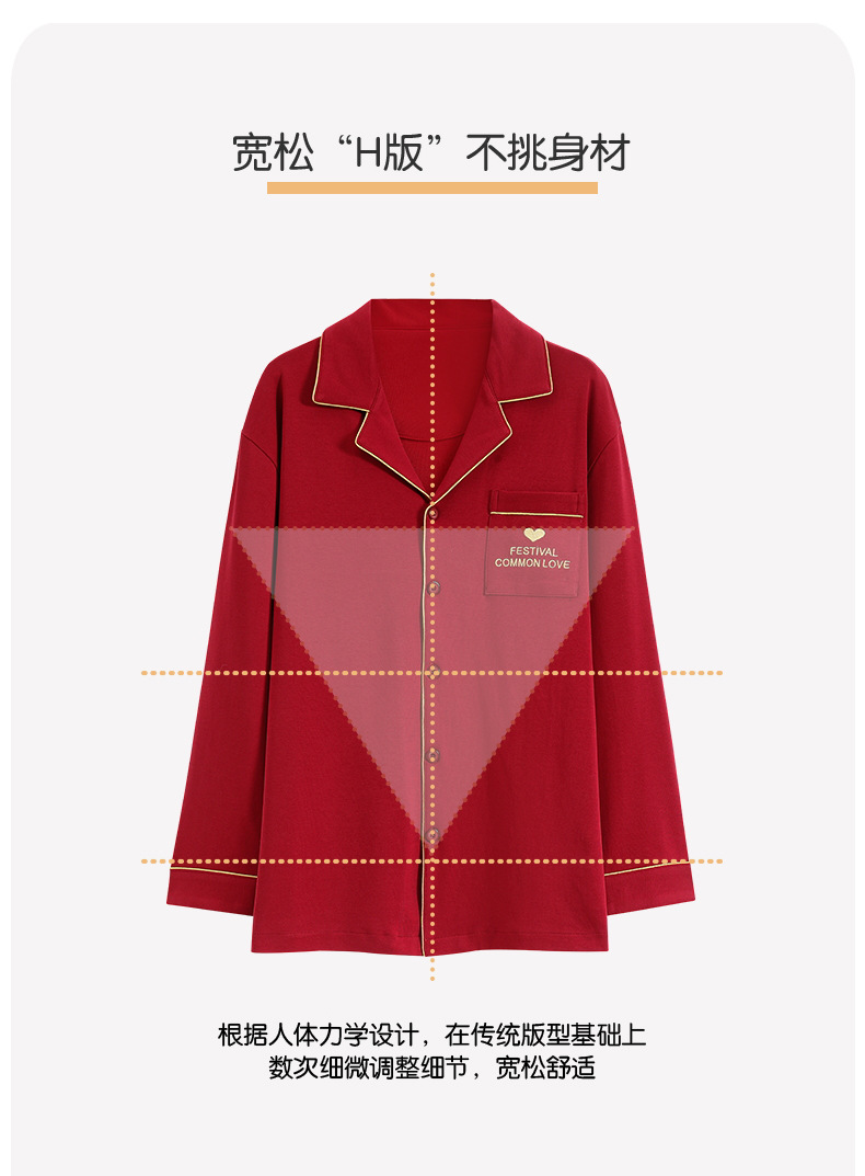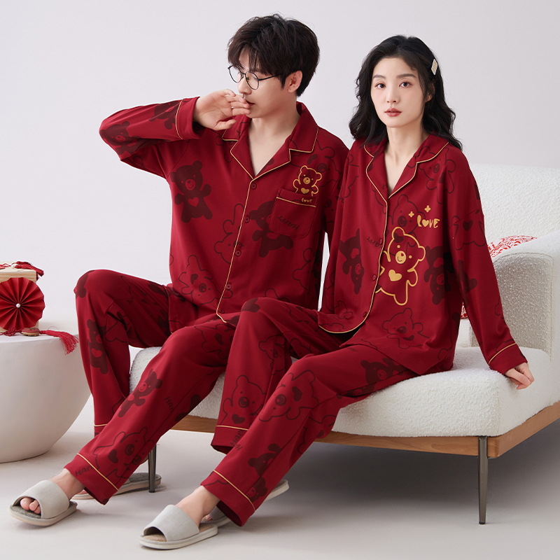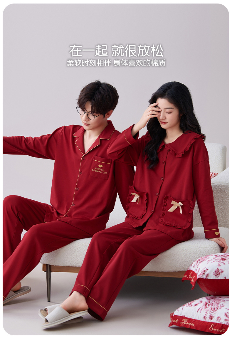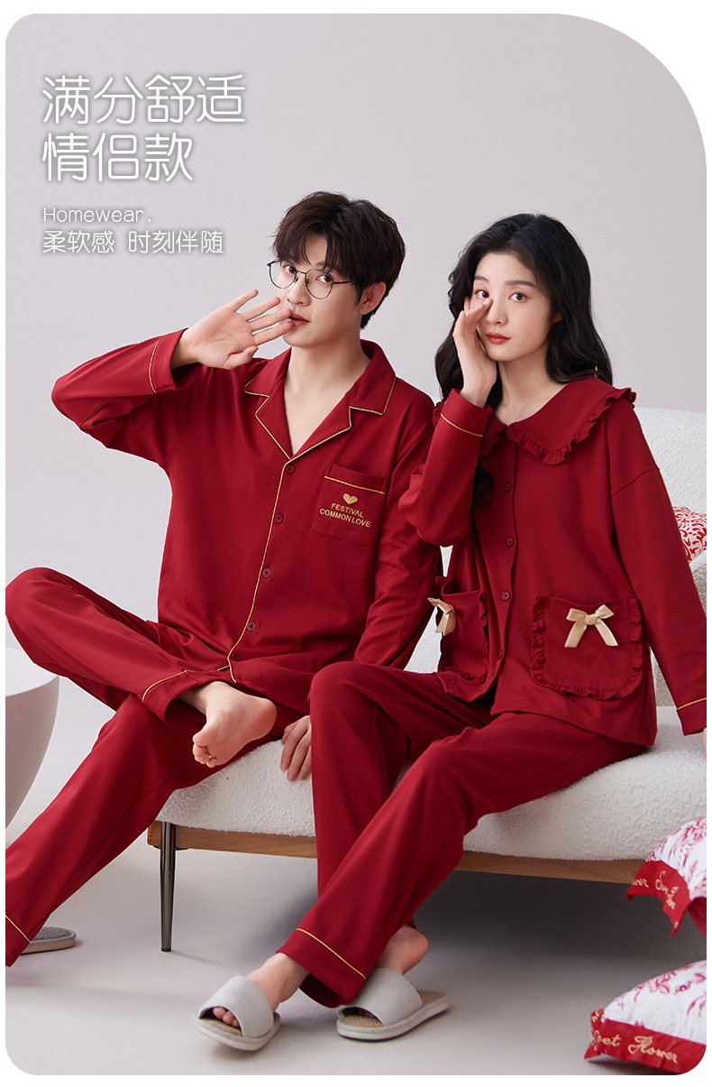커플의 순수한면 잠옷 큰 붉은 결혼식 년 봄과 가을 긴 소매 바지 여성 생활 홈 의류 세트스토어 가기
