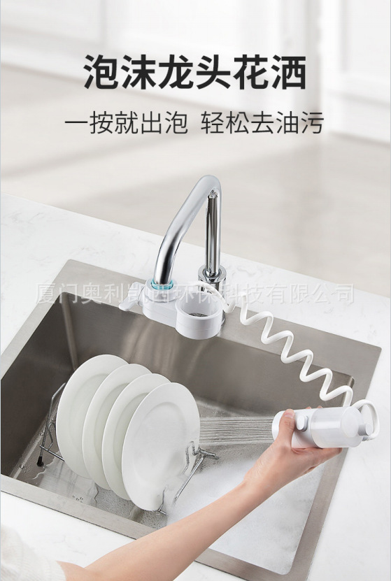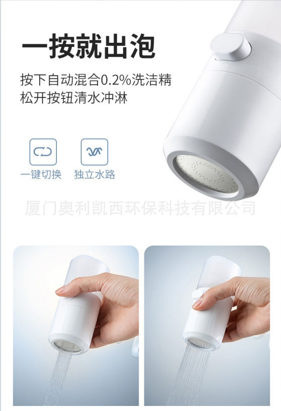 此为一款可选用泡沫冲洗和花洒的新型洗涤器,采用水动力技术,高效水流设计。配备食品级PU软管、激光微孔出水板、水量微调旋钮。一按就出泡,浓度恒定,科学配比,并且切换便捷,独立水路。轻松升级厨房,保护环境健康