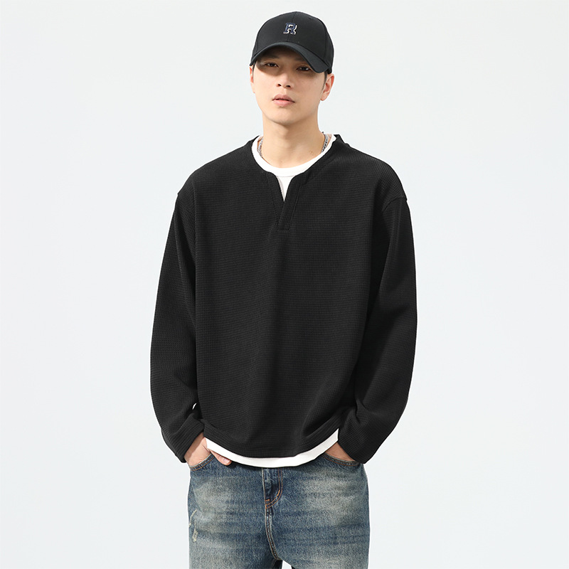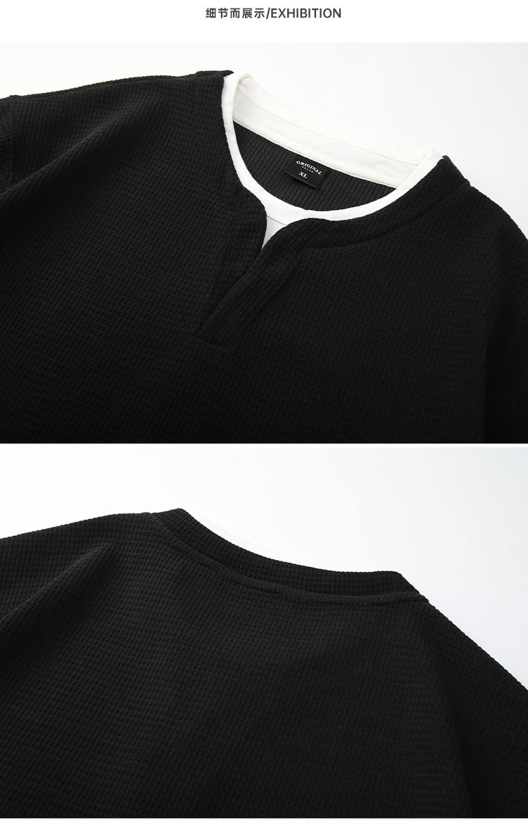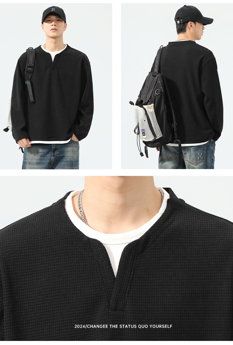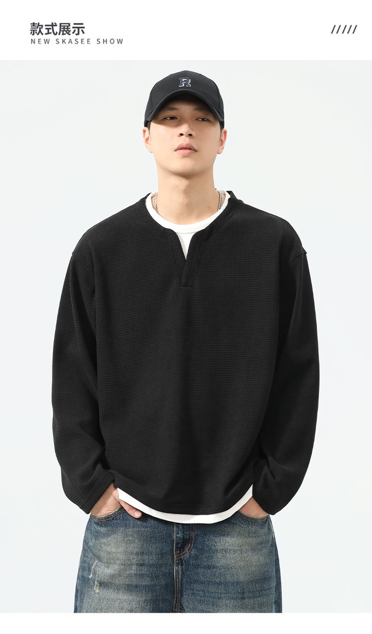型结2024年秋季山系户外华夫格假两件长袖T恤美式复古轻熟风V领亨