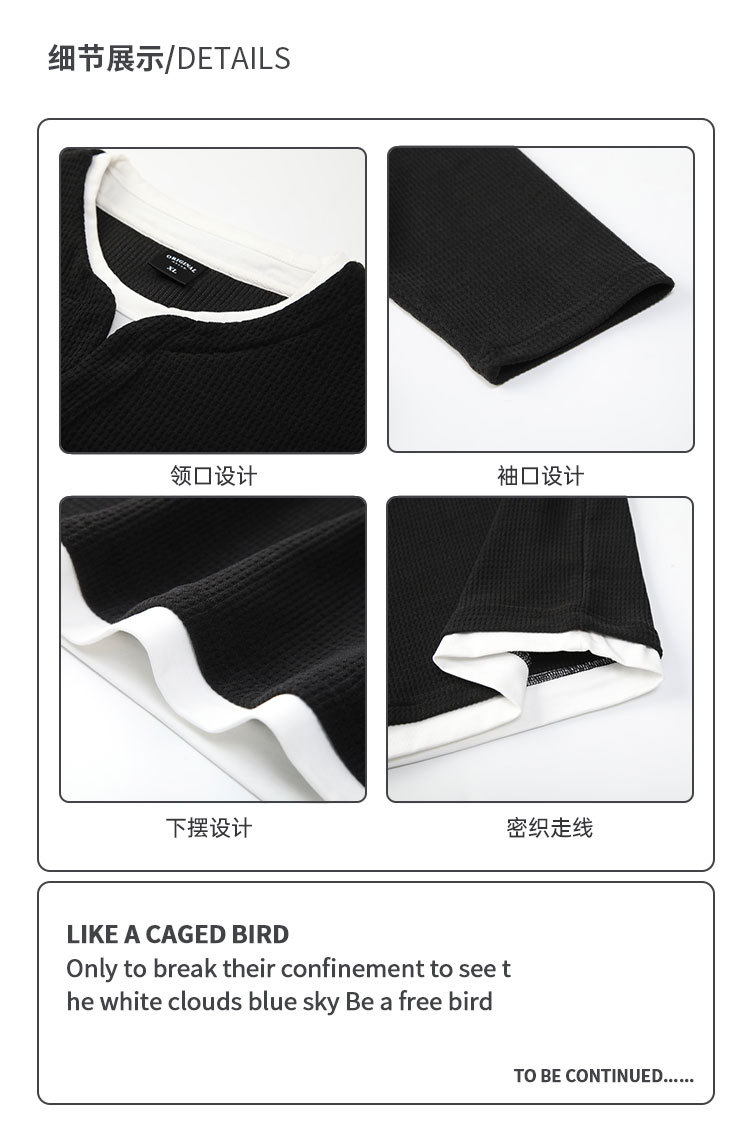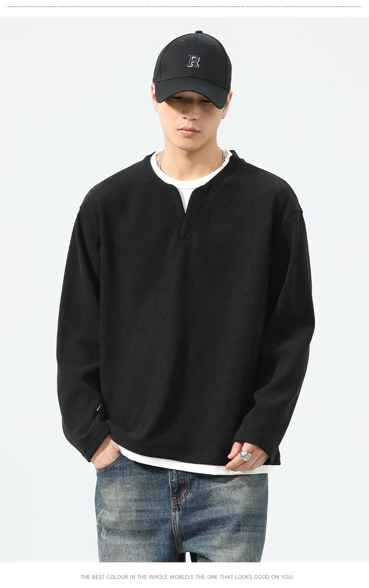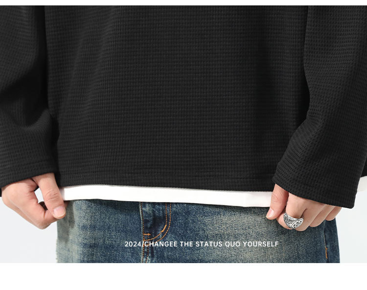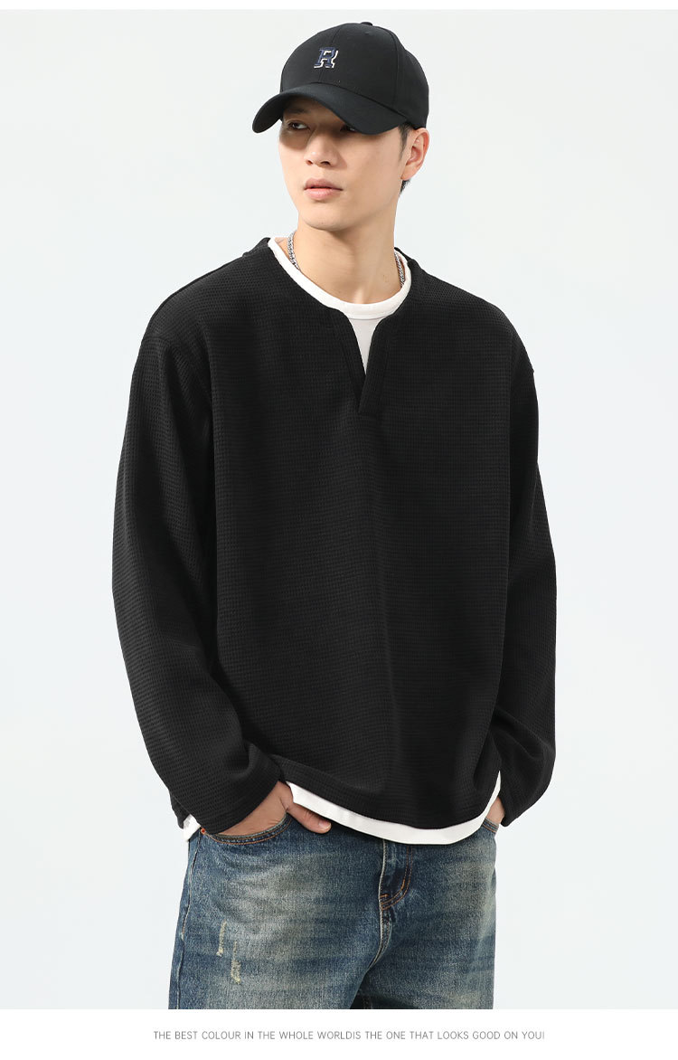 型结2024年秋季山系户外华夫格假两件长袖T恤美式复古轻熟风V领亨
