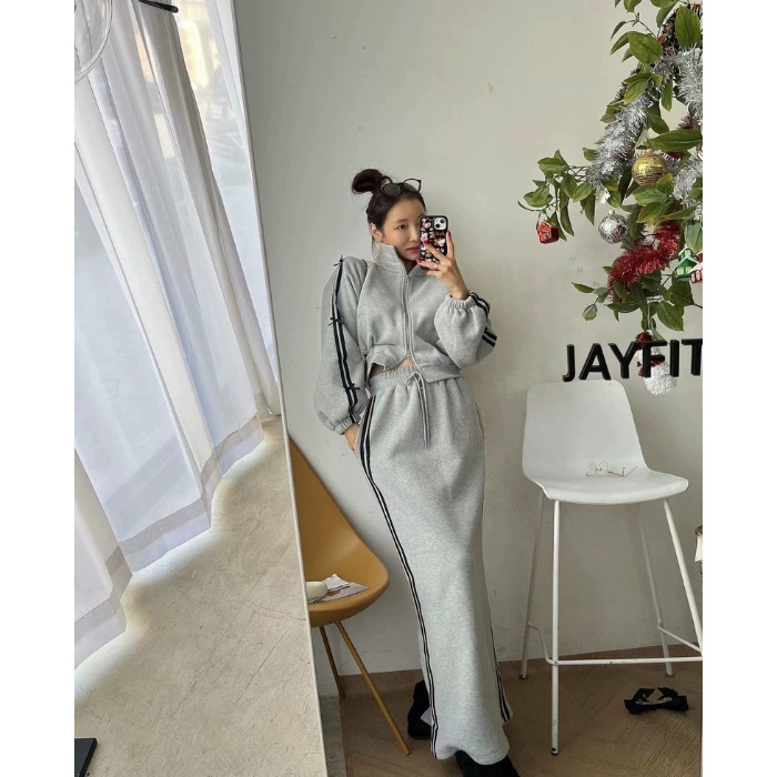 치마 세트 여성의 봄과 가을 새로운 스타일 수직 칼라 스트라이프 짧은 카디건 스웨터 슬리밍 높은 허리 긴 스커트 투피스 세트
