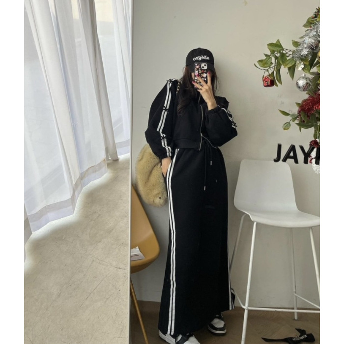 치마 세트 여성의 봄과 가을 새로운 스타일 수직 칼라 스트라이프 짧은 카디건 스웨터 슬리밍 높은 허리 긴 스커트 투피스 세트스토어 가기