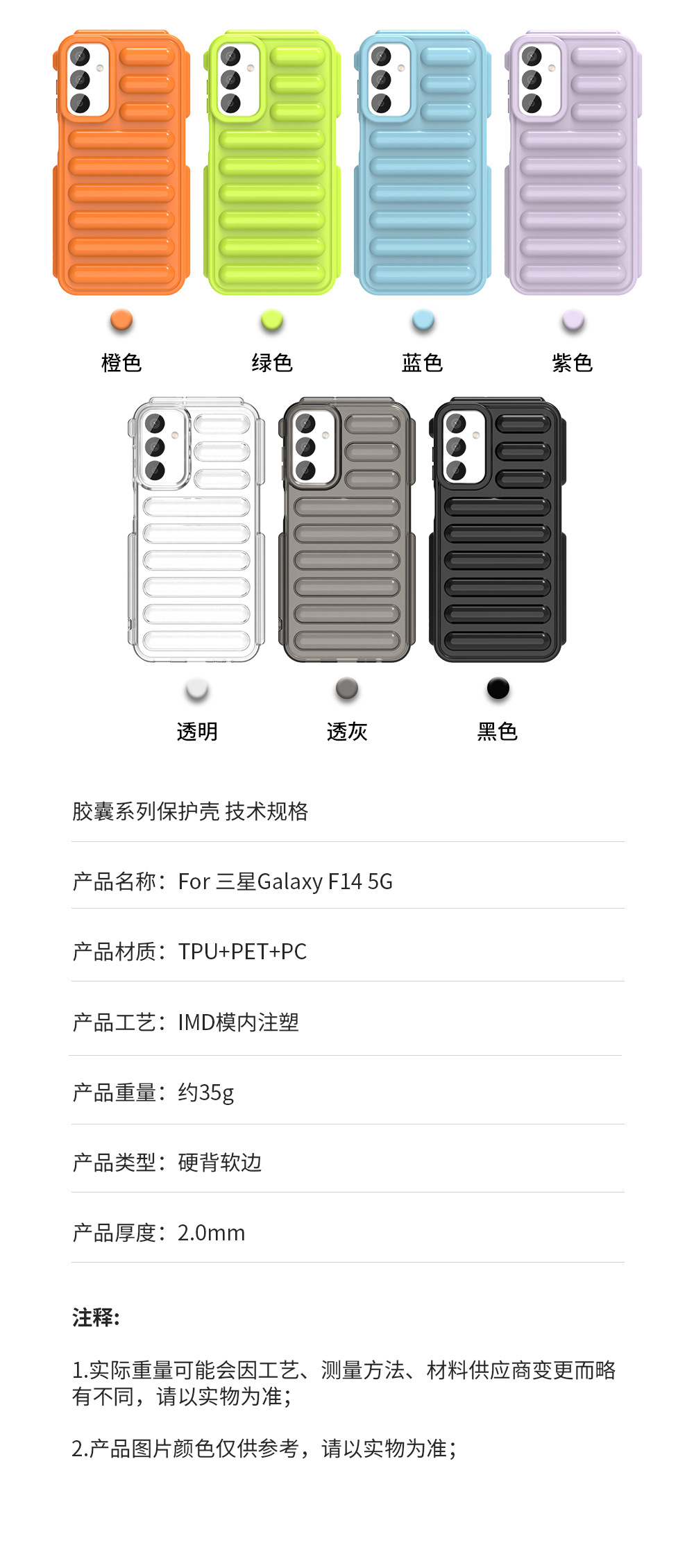 【产品颜色】:橙色、蓝色、绿色、紫色、透明色、透灰色、黑色(7色)