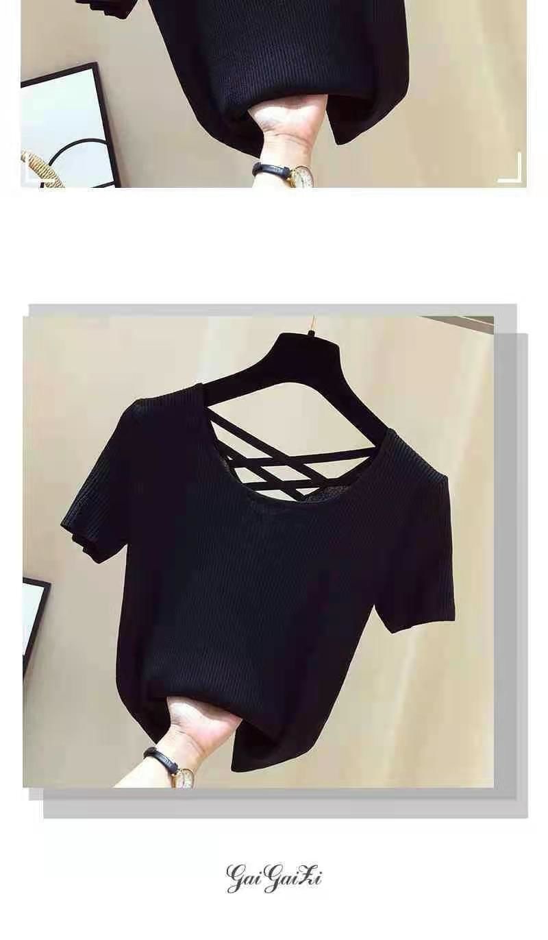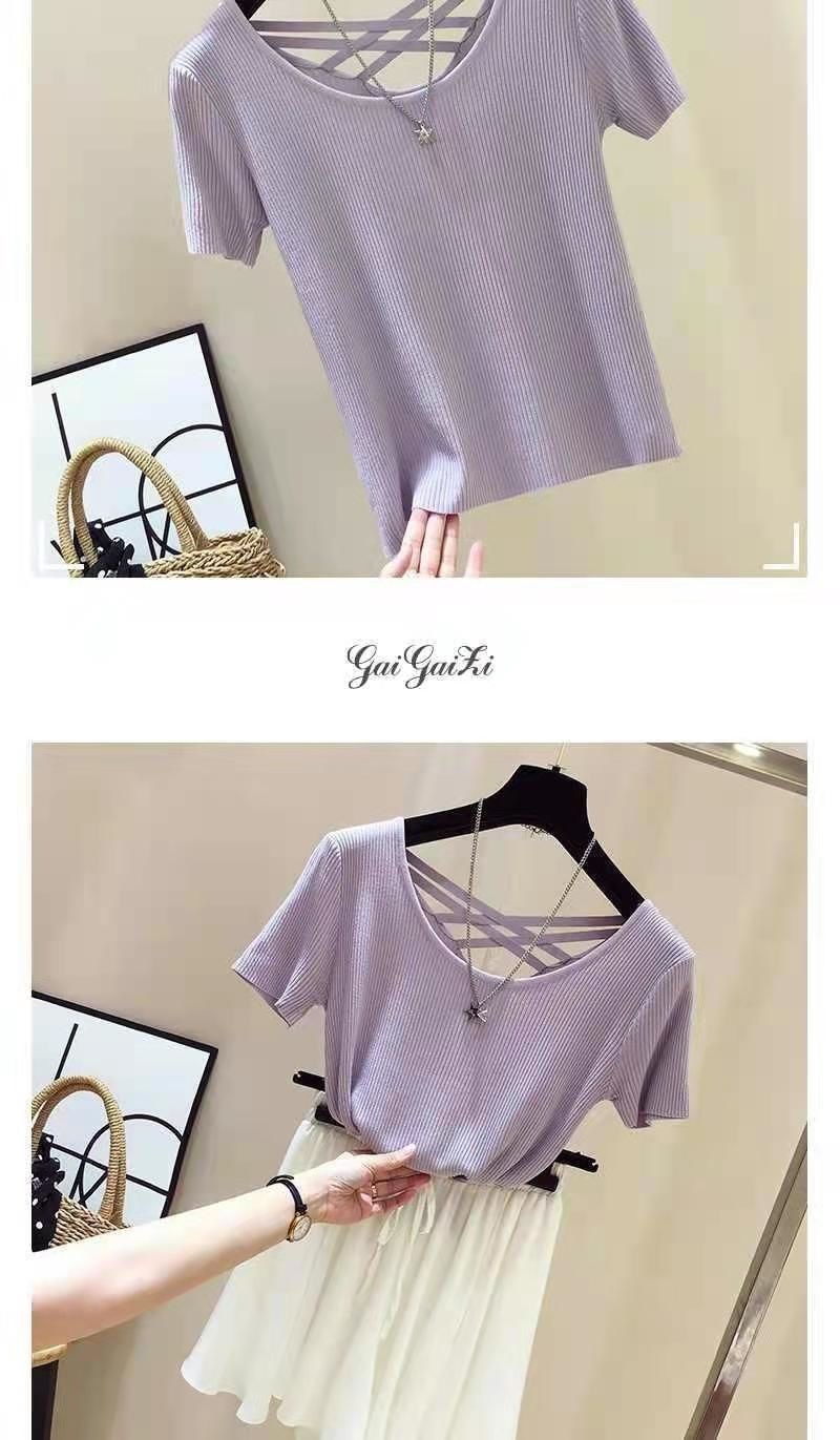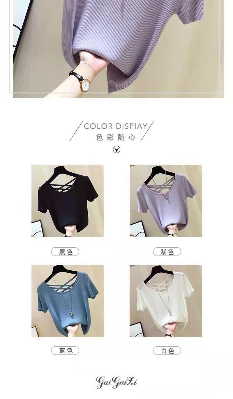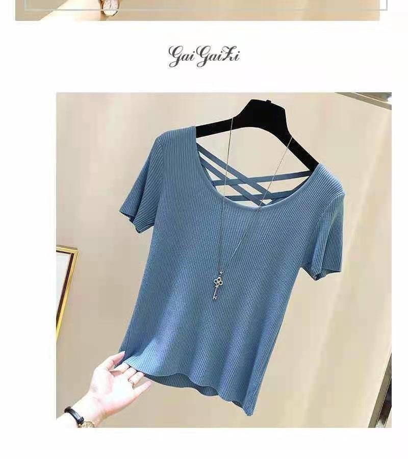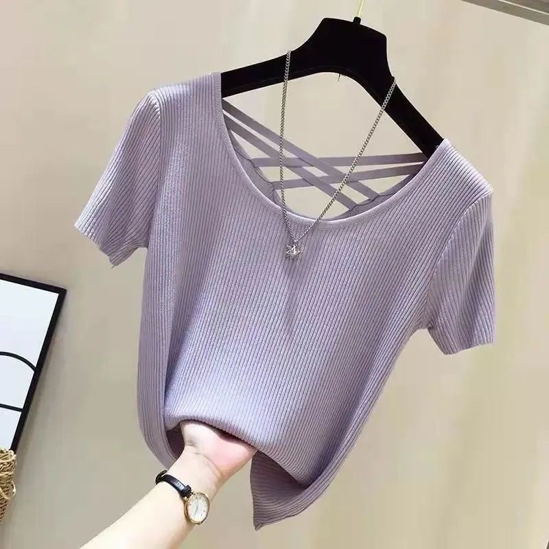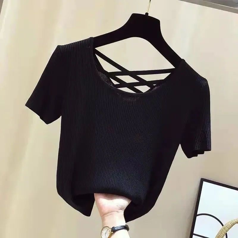 여성을위한 얼음 실크 스레드 반팔 티셔츠 여름 2025 새로운 한국어 버전 얇은 슬림 섹시한 백리스 탑 바닥 셔츠