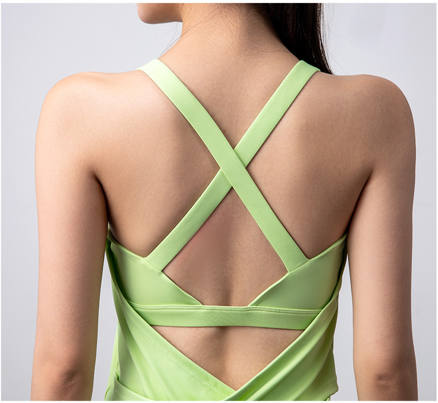 가슴 패드가 있는 가짜 투피스 스포츠 조끼, 여성용 런닝 트레이닝 피트니스 탑, 크로스 백 요가웨어, 민소매 조끼스토어 가기