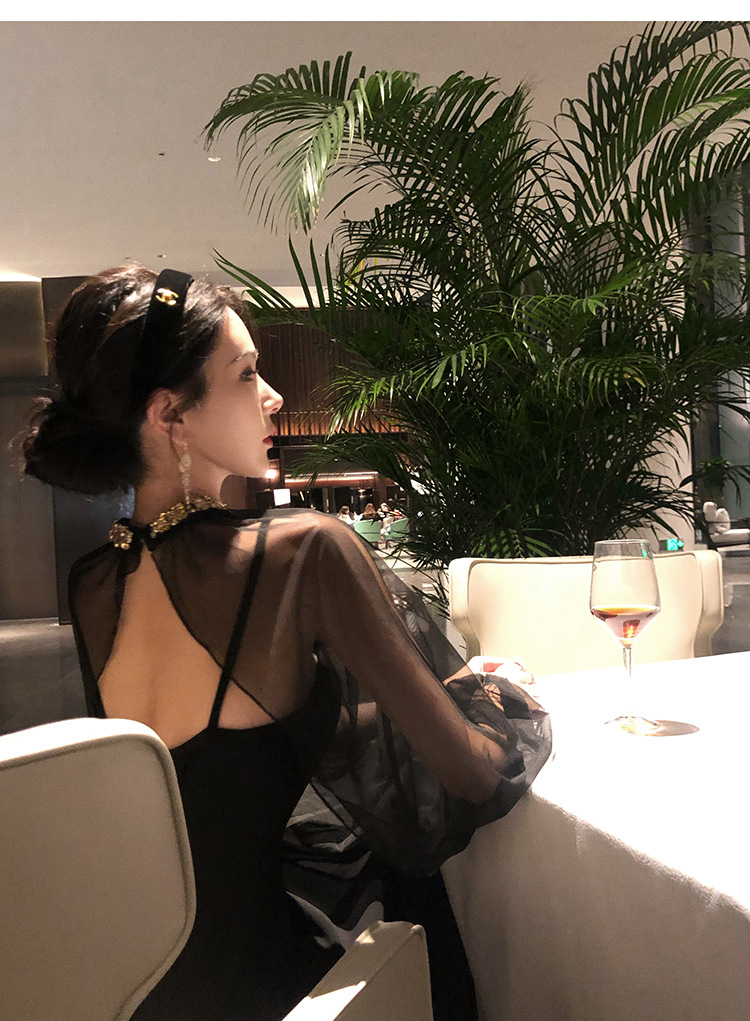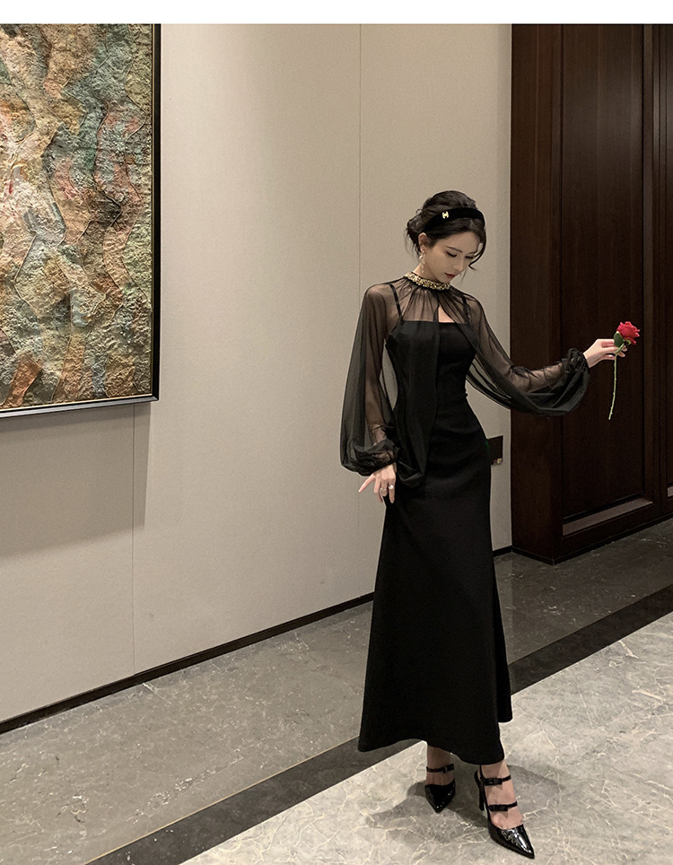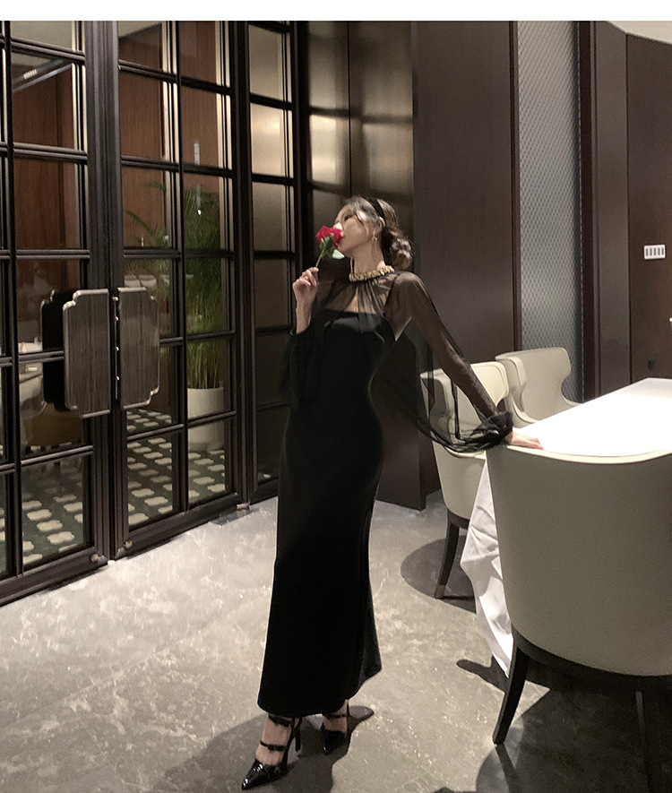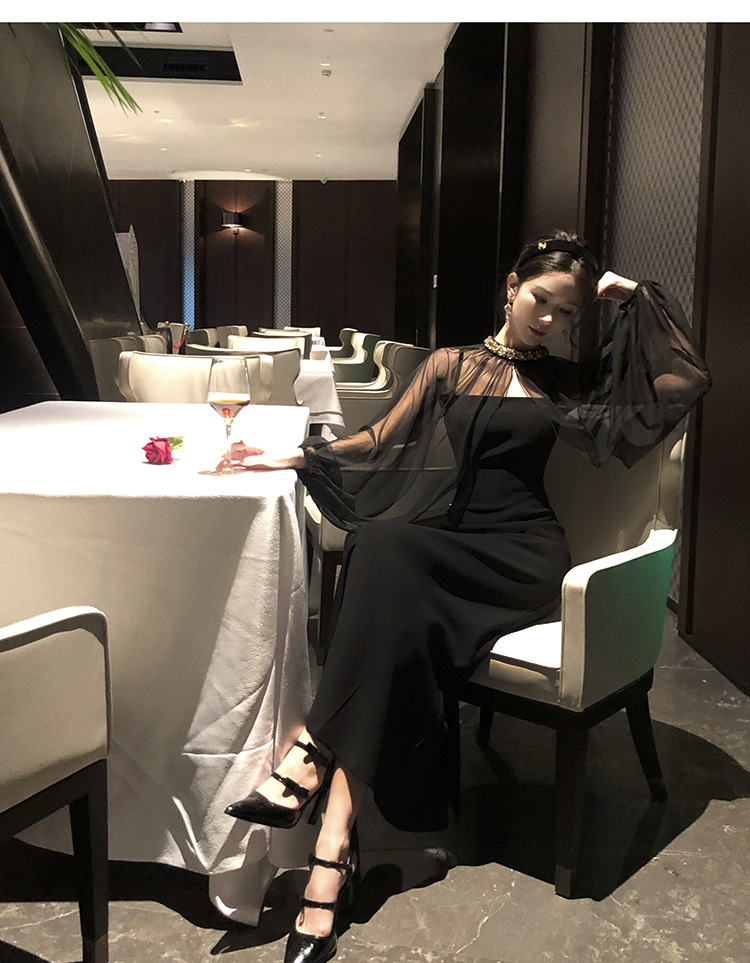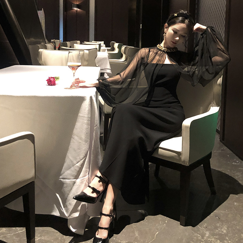 여자 가을과 겨울 원피스 섹시한 우아한 검은 메쉬 슬링 헵번 향기로운 프랑스 저녁 원피스
