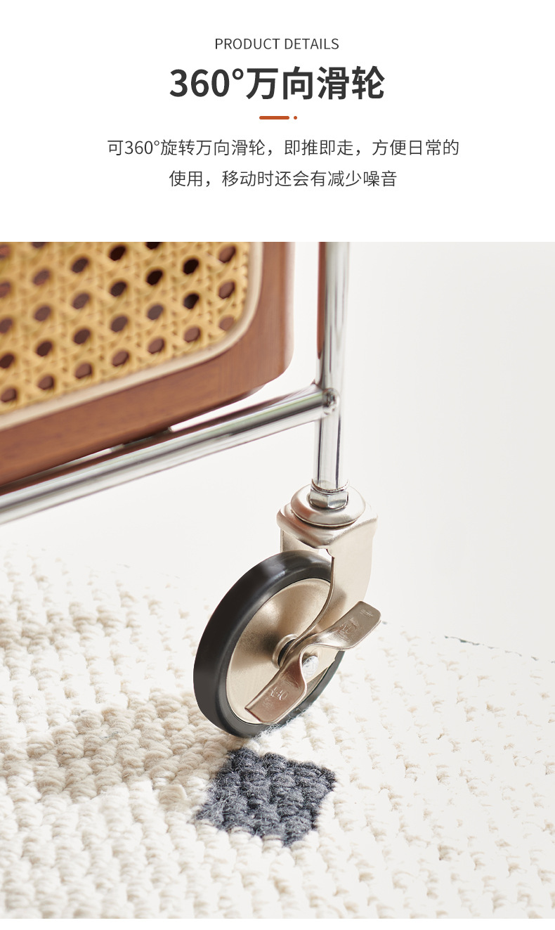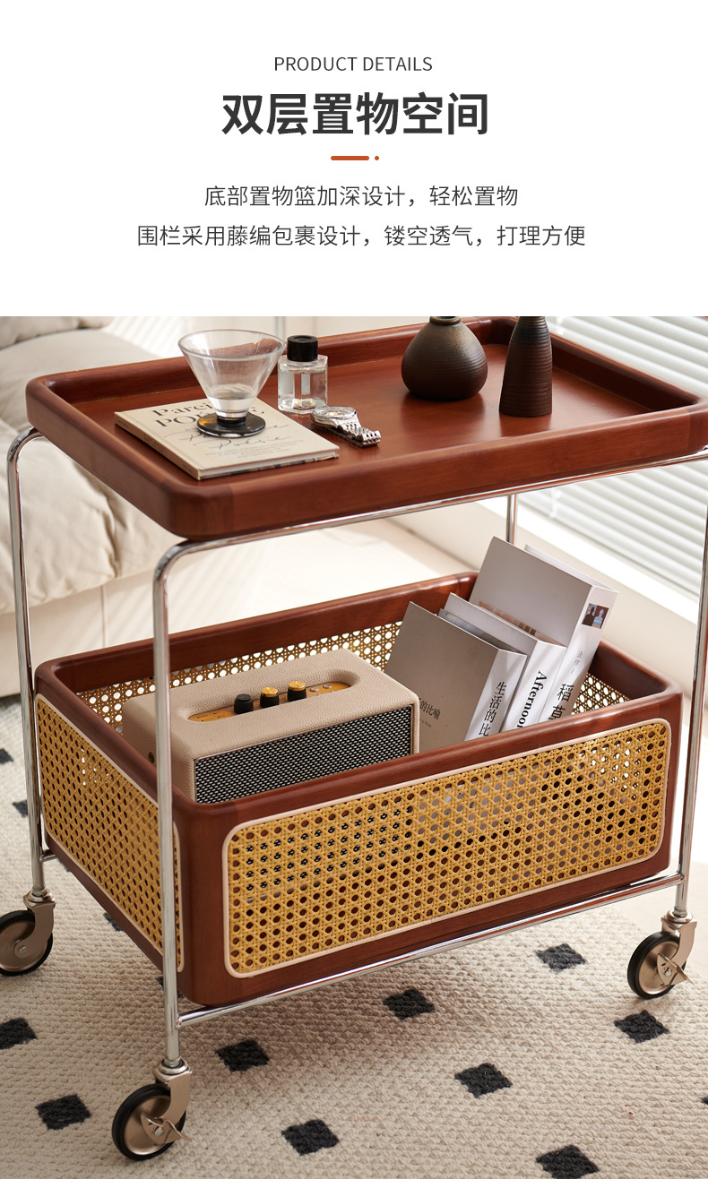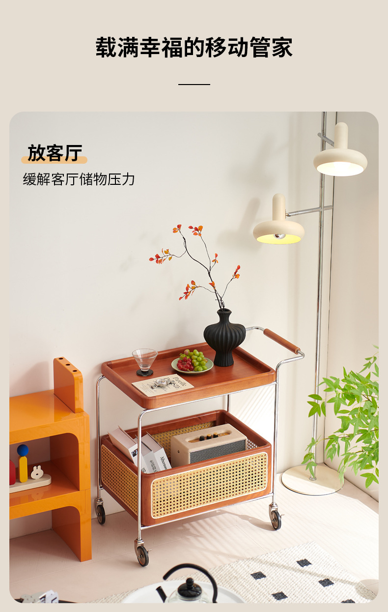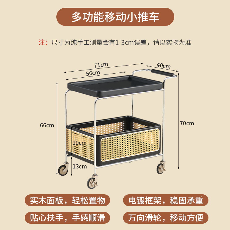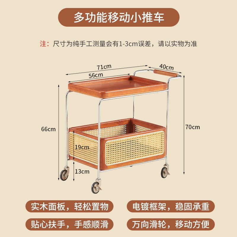 定制带扶手置物架小推车实木托盘带藤编收纳筐小推车双层收纳架