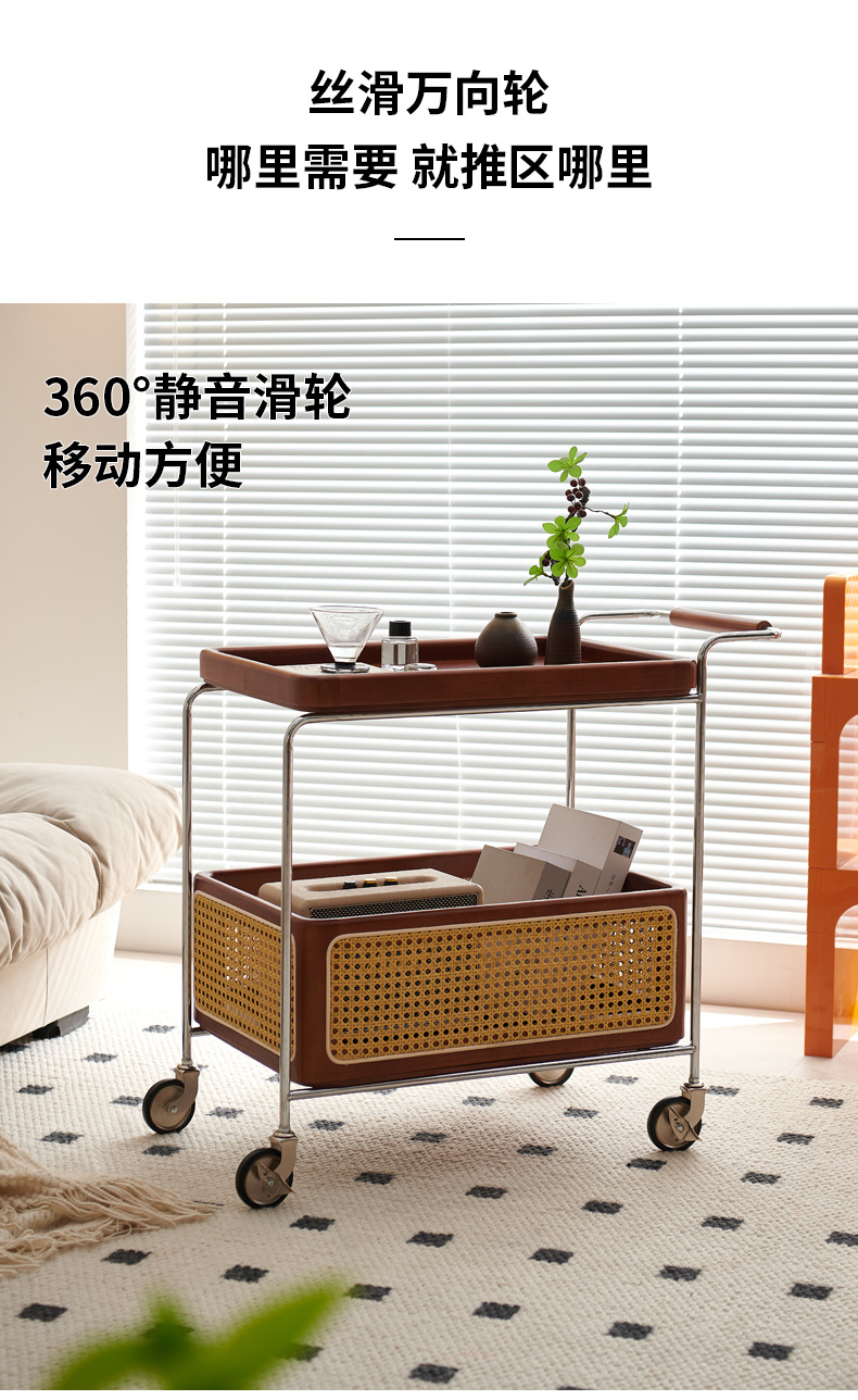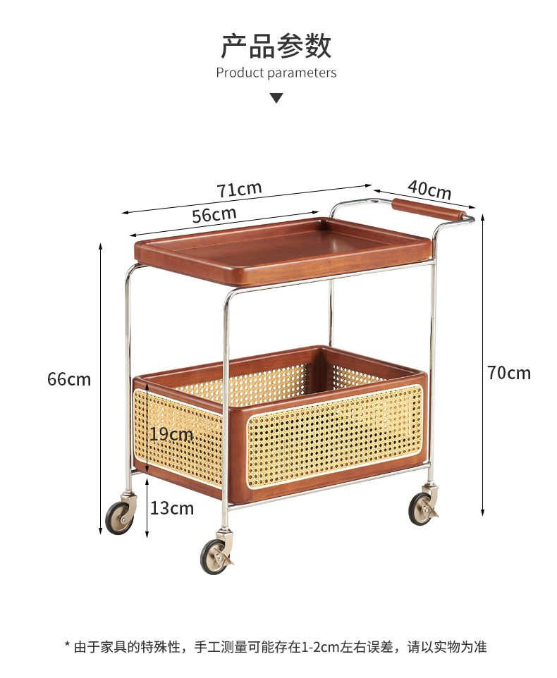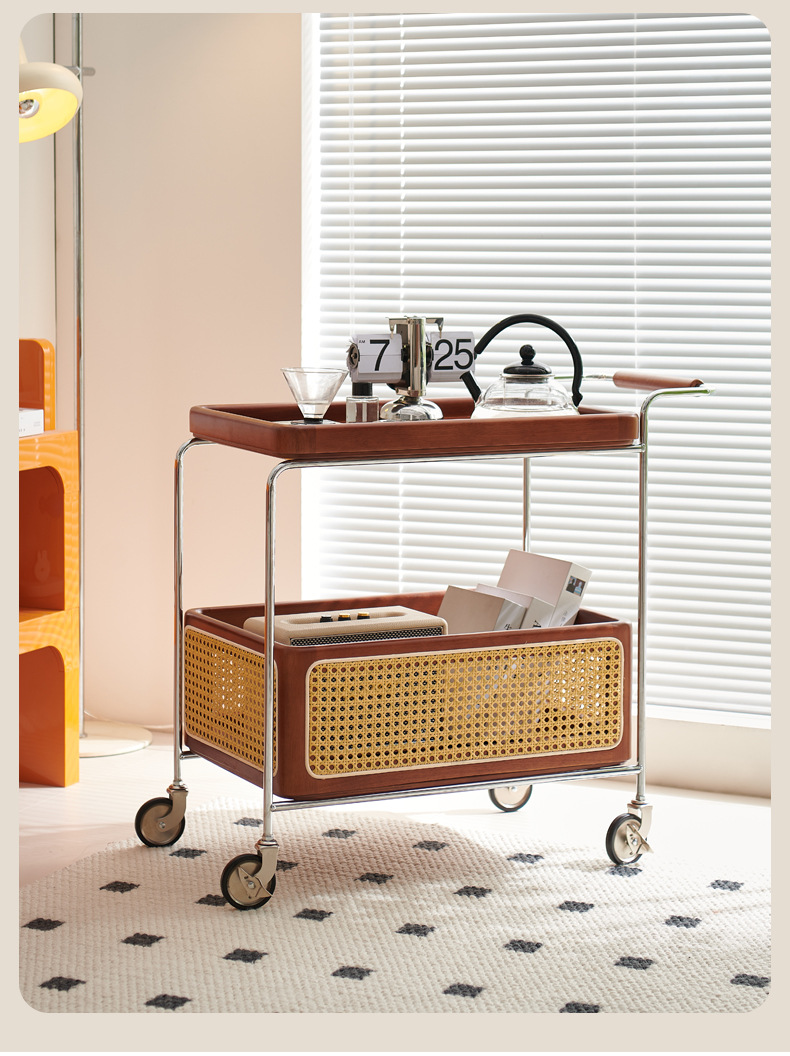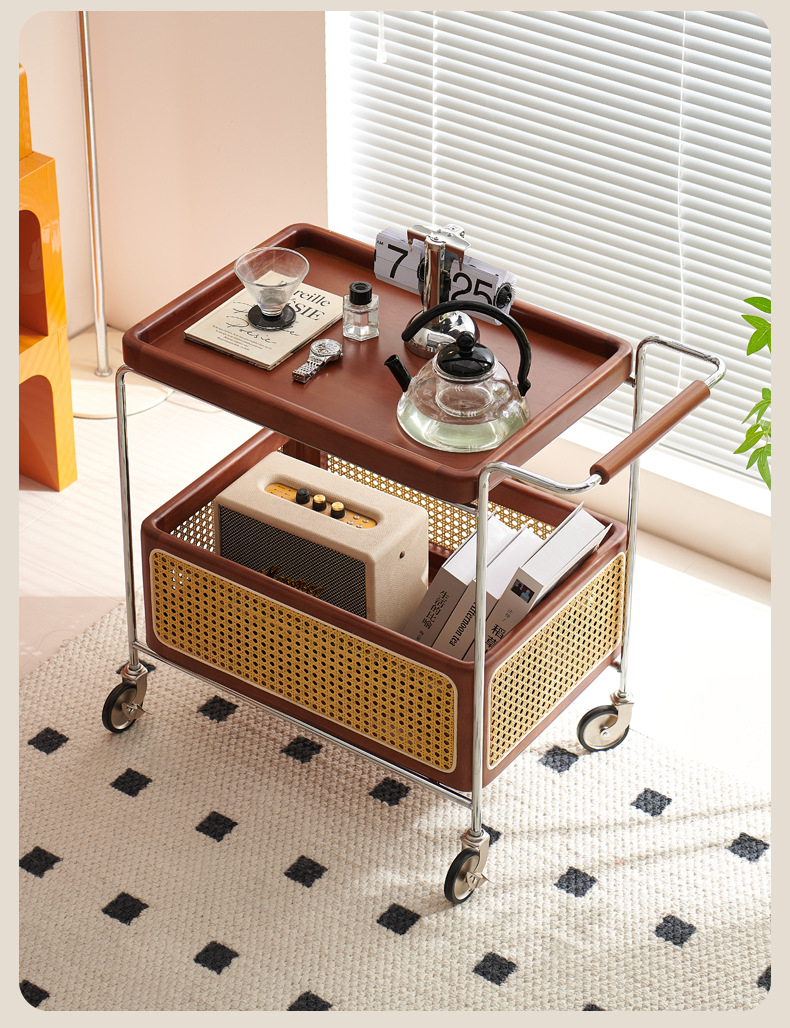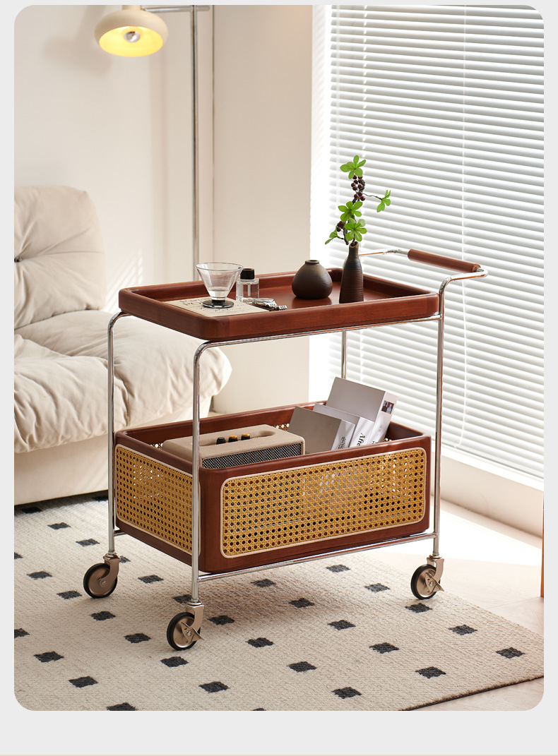 定制带扶手置物架小推车实木托盘带藤编收纳筐小推车双层收纳架