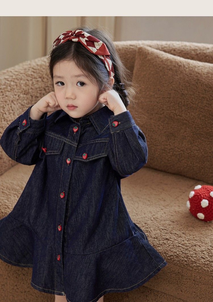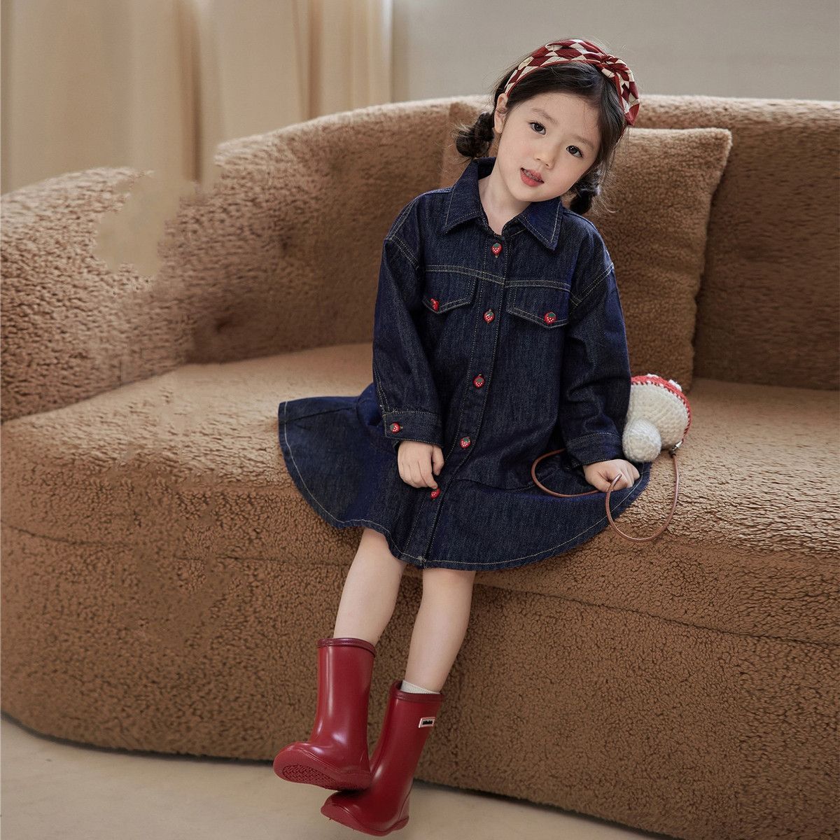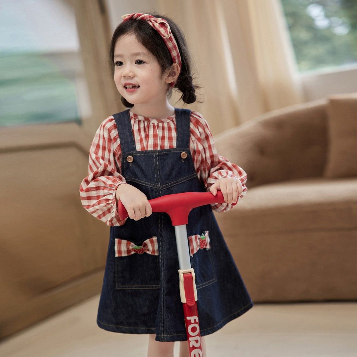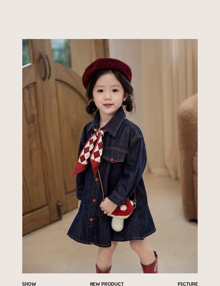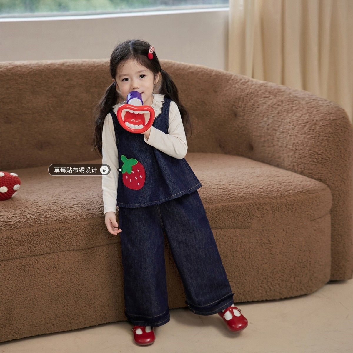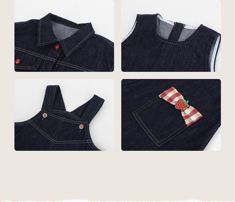 아기 소녀 가을 데님 세트 2024 새로운 아기 세련된 코트 유행 인형 셔츠 스트랩 투피스 세트 트렌디스토어 가기