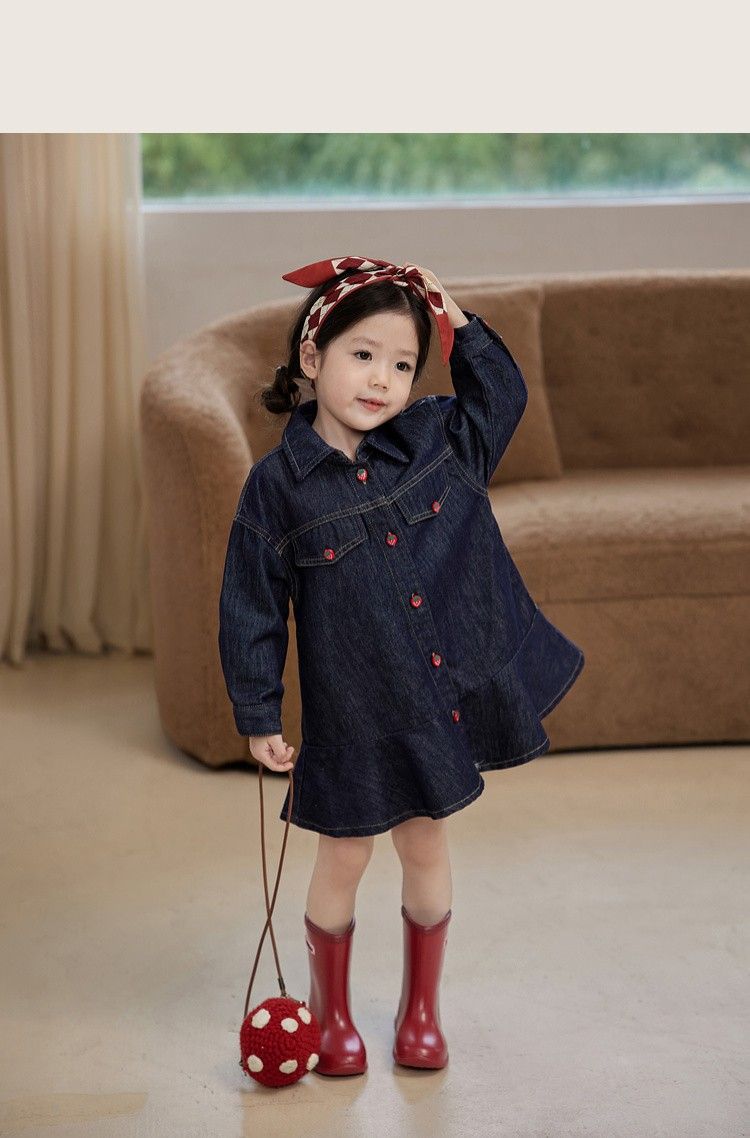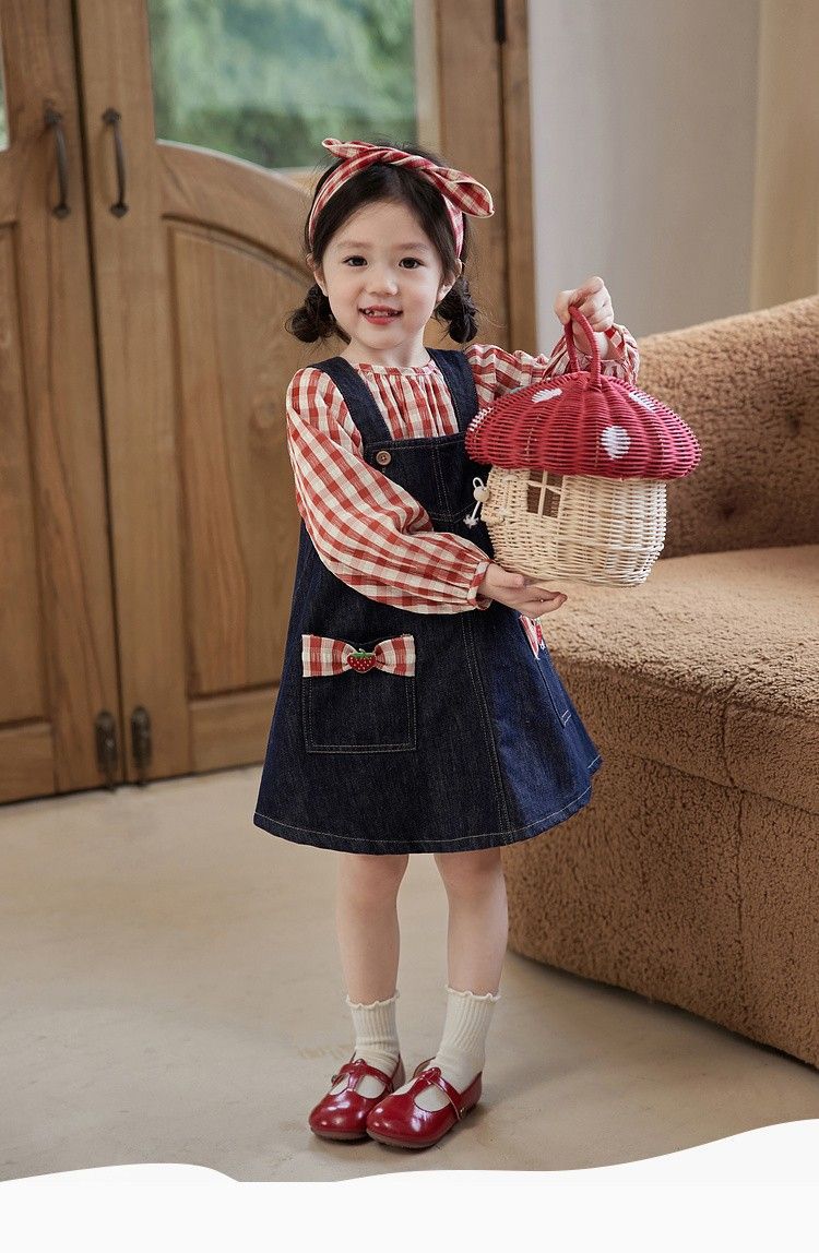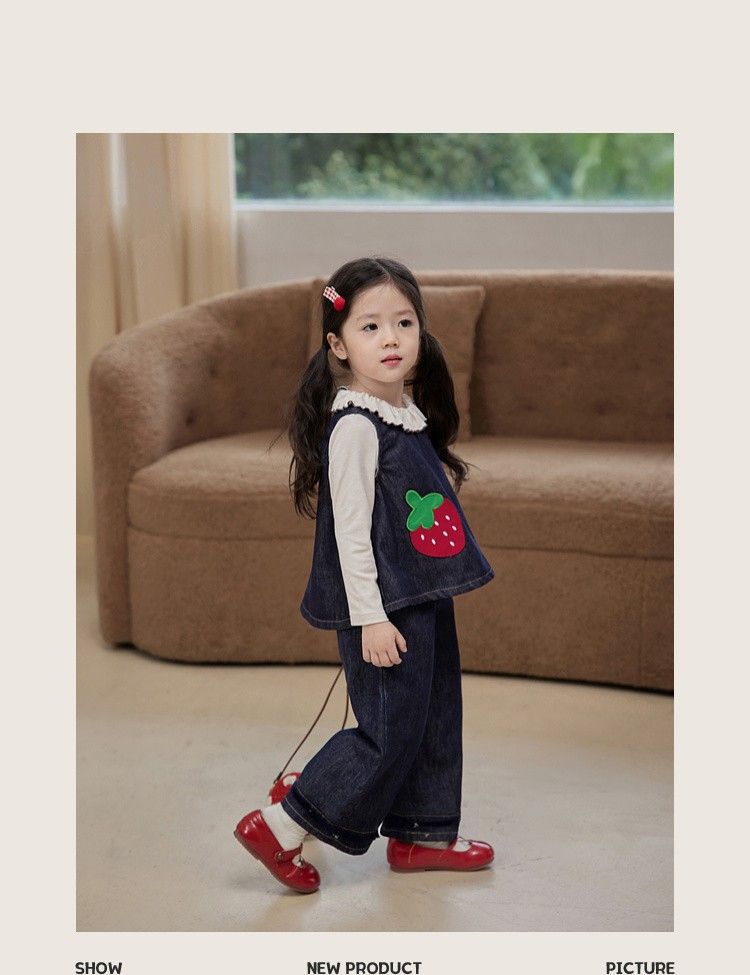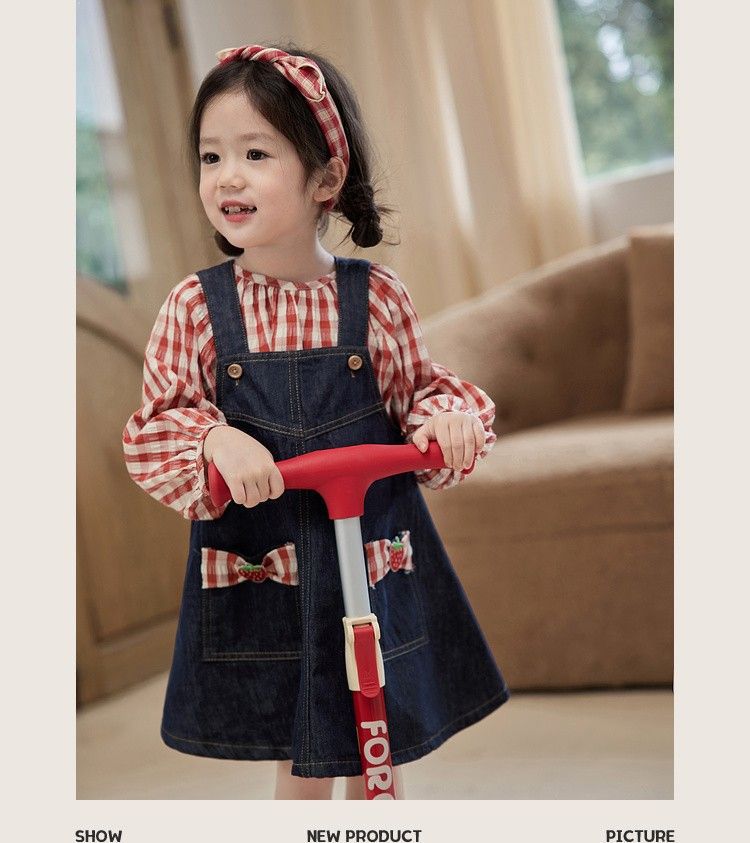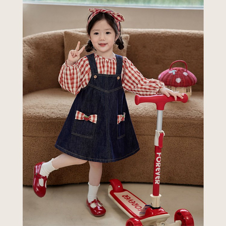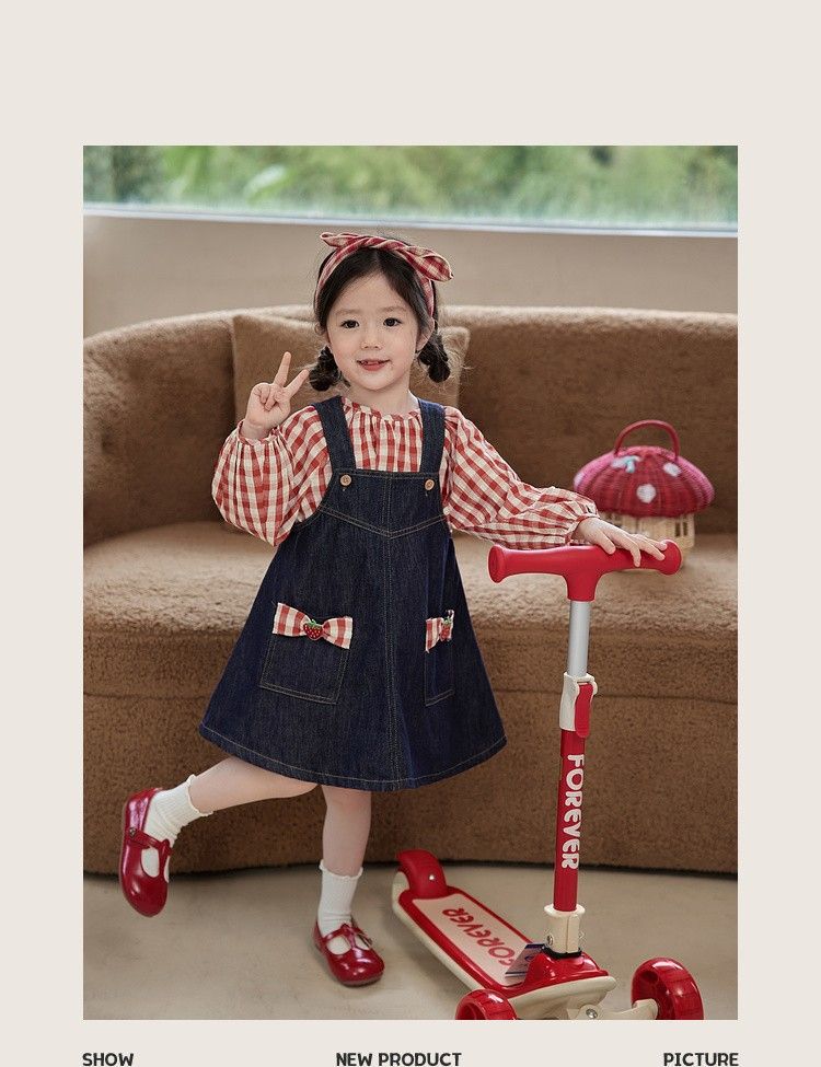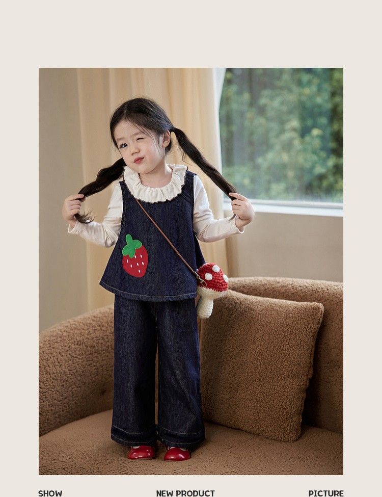아기 소녀 가을 데님 세트 2024 새로운 아기 세련된 코트 유행 인형 셔츠 스트랩 투피스 세트 트렌디스토어 가기