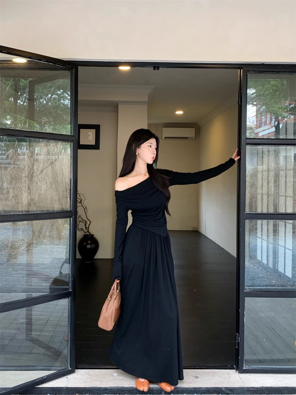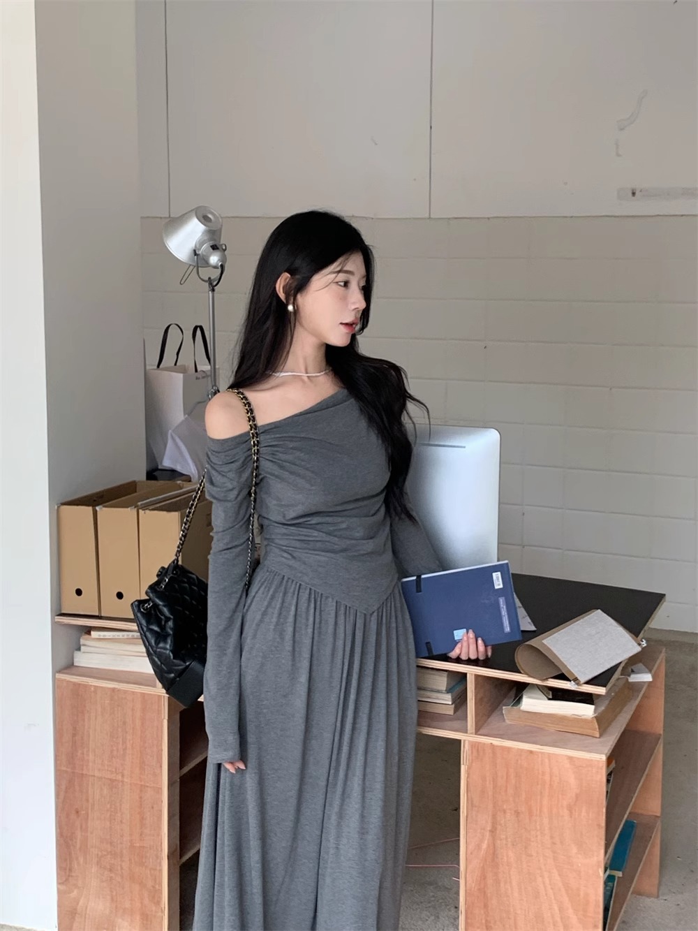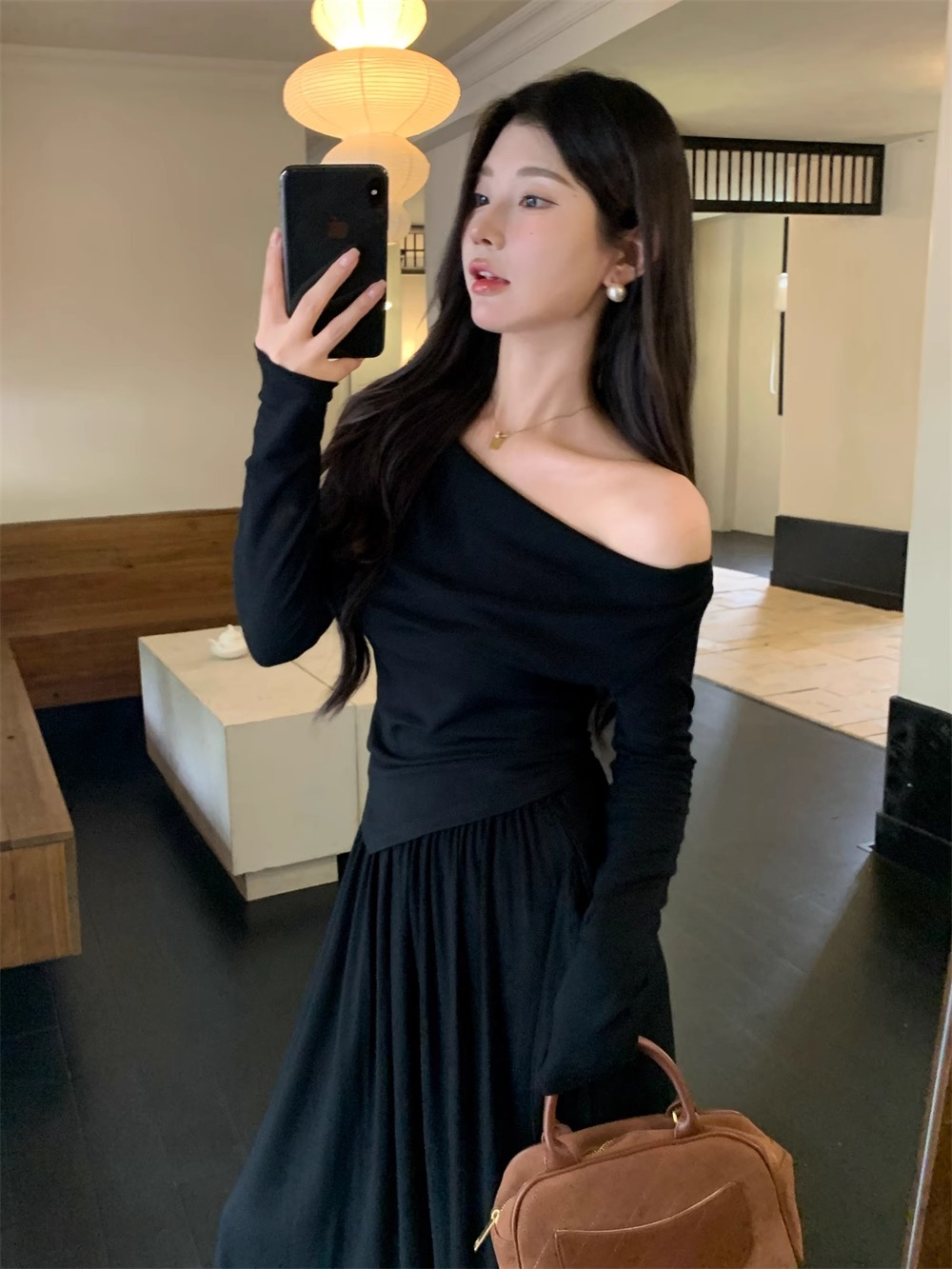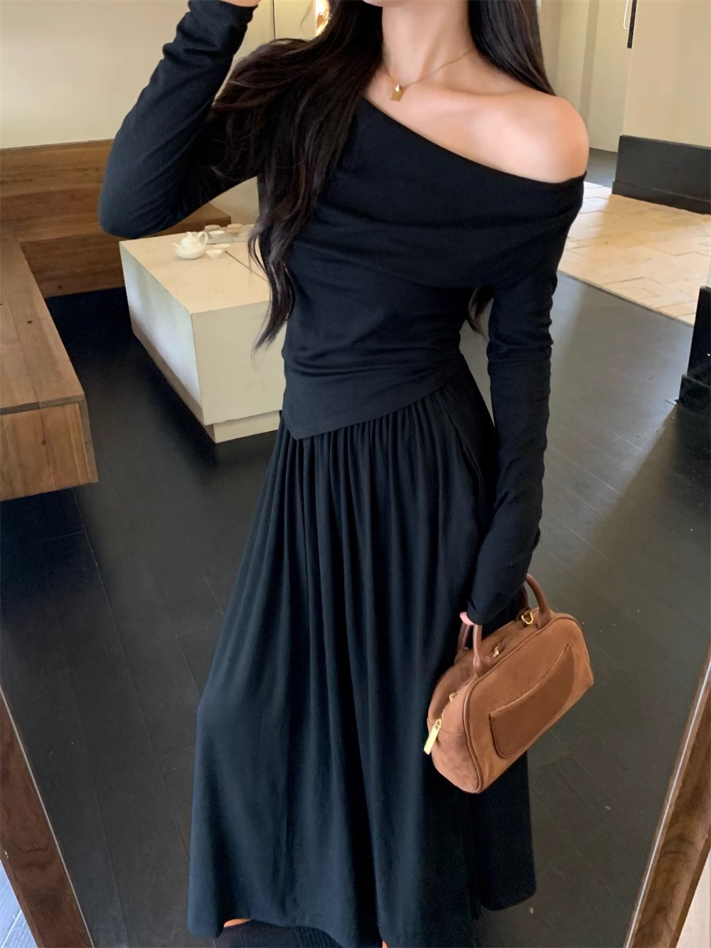 한국 스타일 패션 우아한 세트 여성 가을 새 도착 어깨 불규칙한 긴팔 탑 드레이핑 스커트 투피스 세트