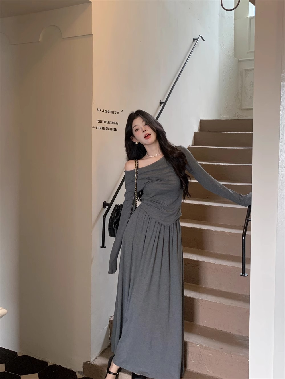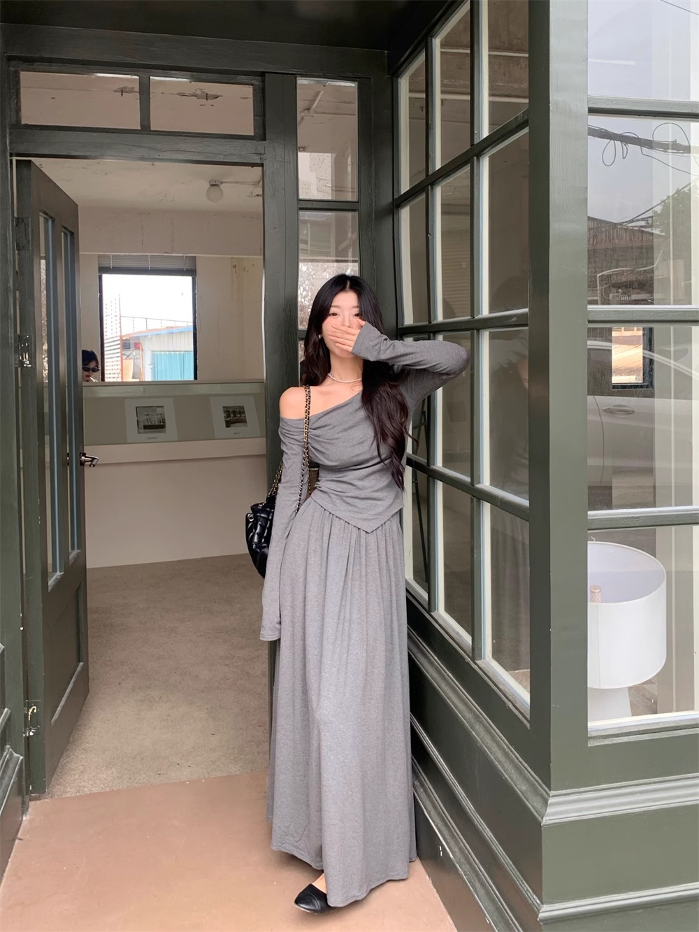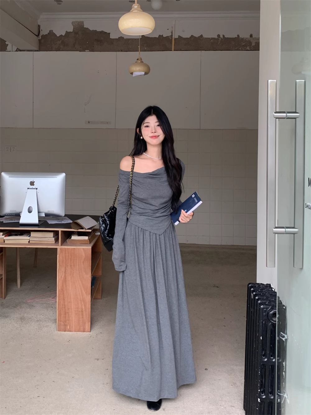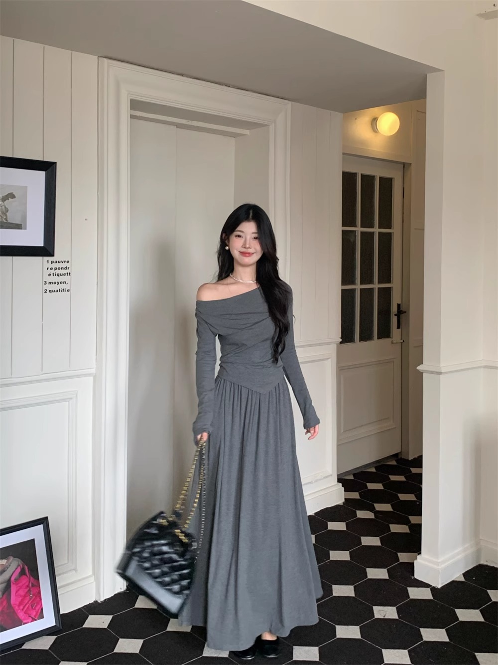 한국 스타일 패션 우아한 세트 여성 가을 새 도착 어깨 불규칙한 긴팔 탑 드레이핑 스커트 투피스 세트스토어 가기