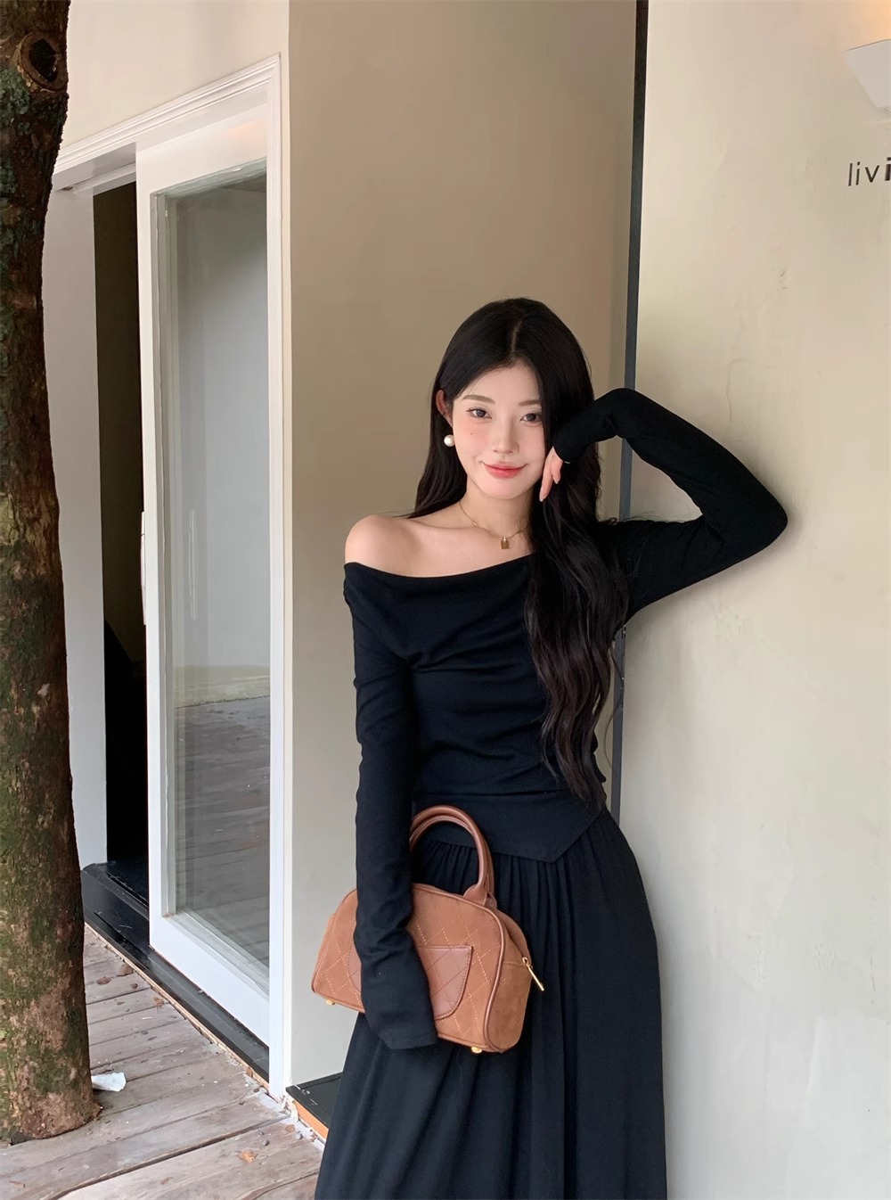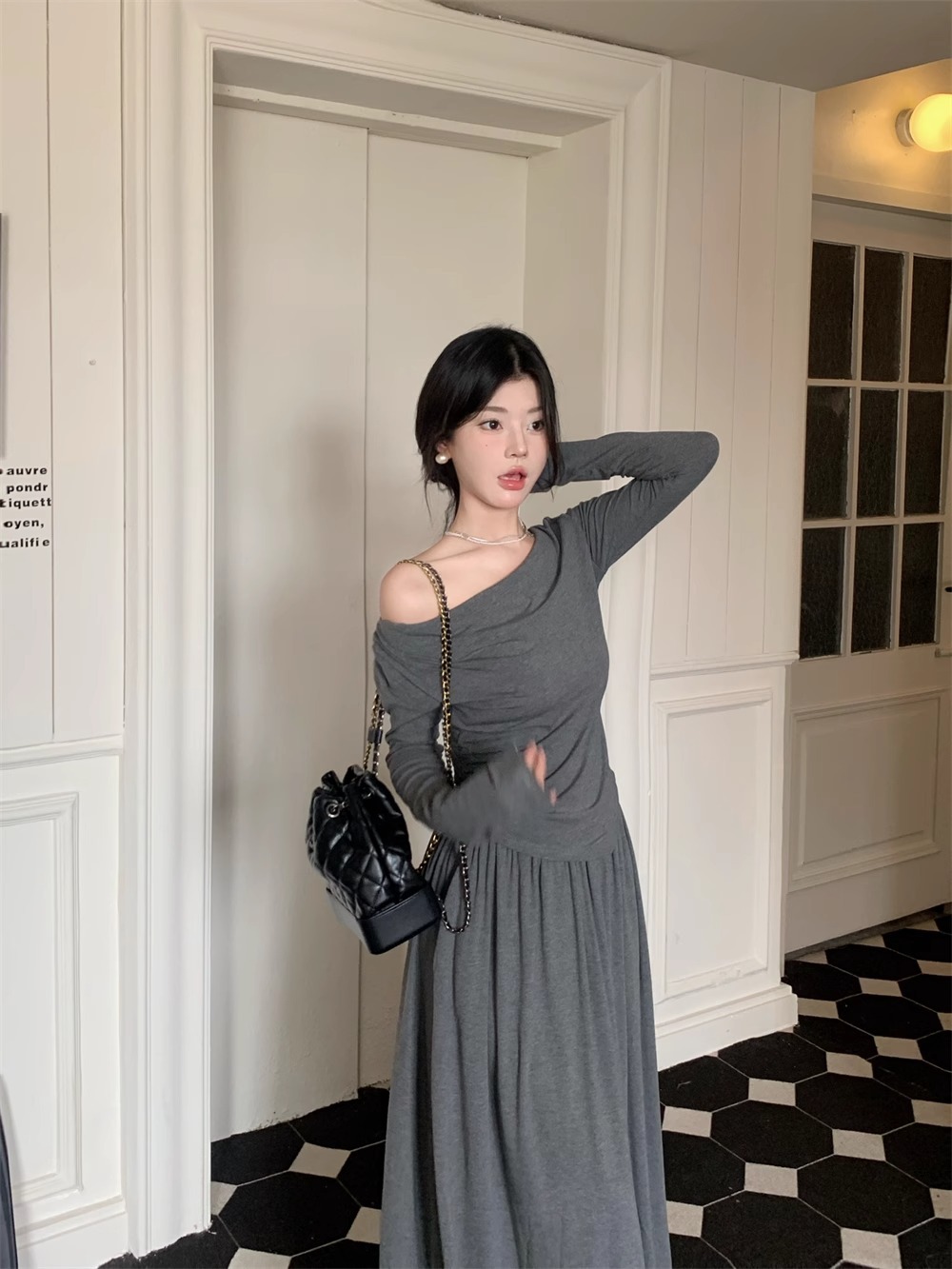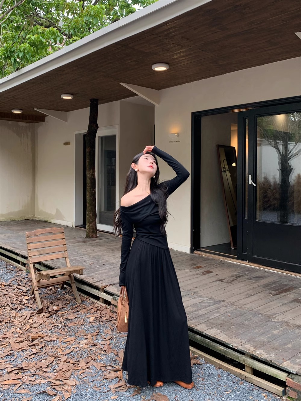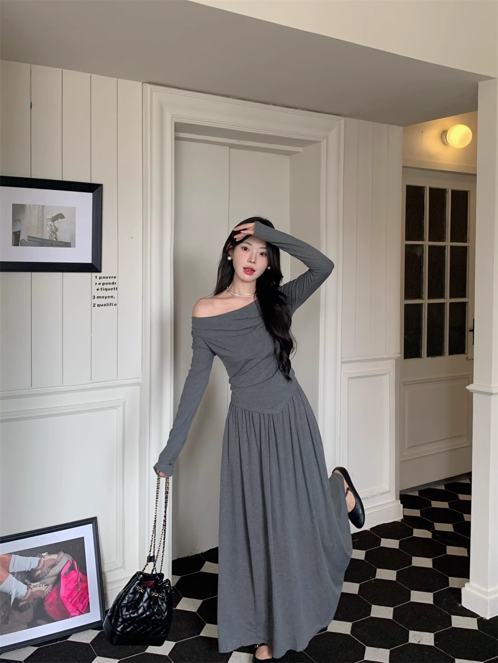 한국 스타일 패션 우아한 세트 여성 가을 새 도착 어깨 불규칙한 긴팔 탑 드레이핑 스커트 투피스 세트스토어 가기