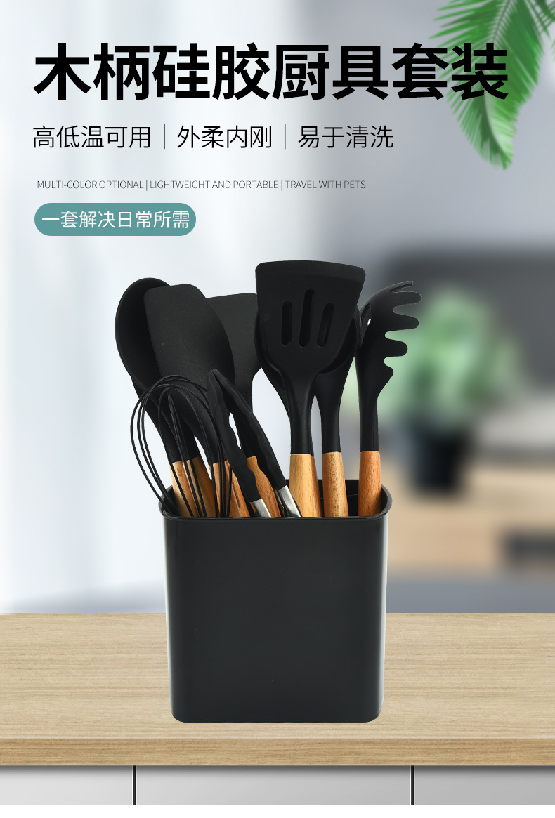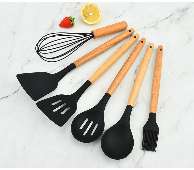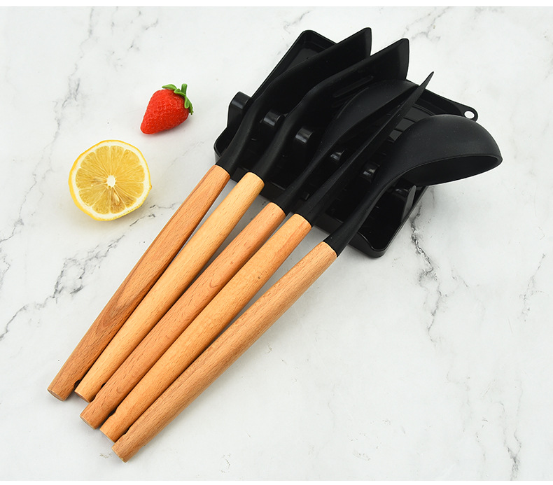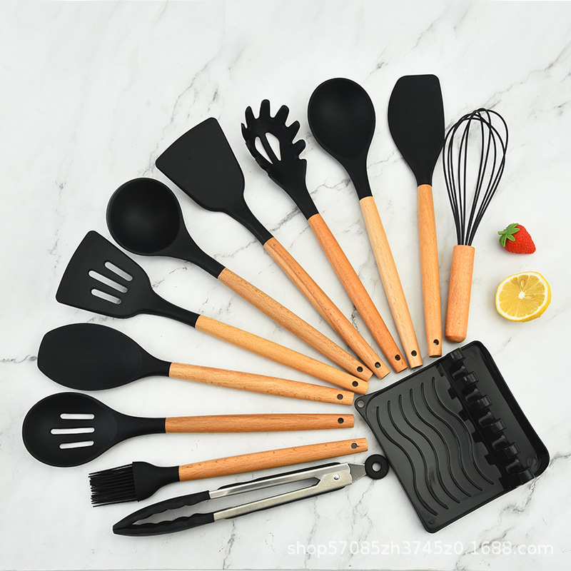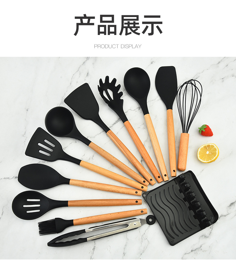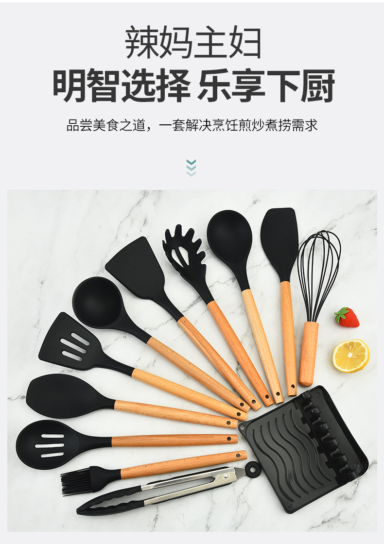 하이 퀄리티 실리콘 주방용품 12 조각 주방 요리 도구 너도밤 나무 손잡이 주방 세트 스틱 팬이 아프지 않습니다.스토어 가기