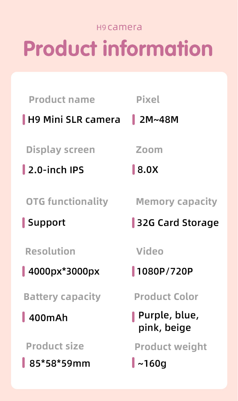 • H9 HD 핑크(전면 및 후면 듀얼 카메라) + 32g 카드 + 카드 리더기