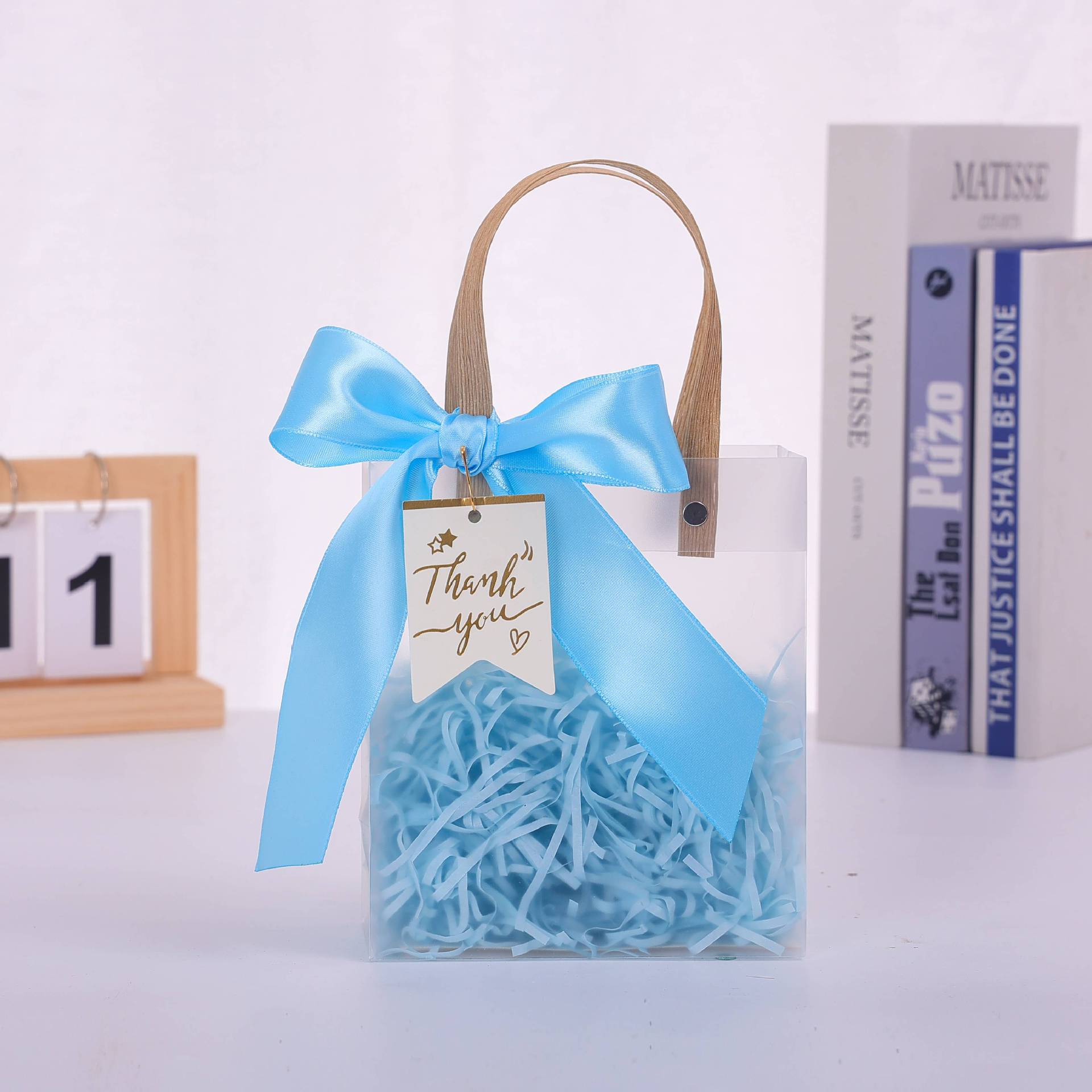 • 스카이블루(리본+라피아+태그) + 반투명 투명 핸드백, PP, 중형 정사각형 [높이 20 폭 10 길이 20] cm
