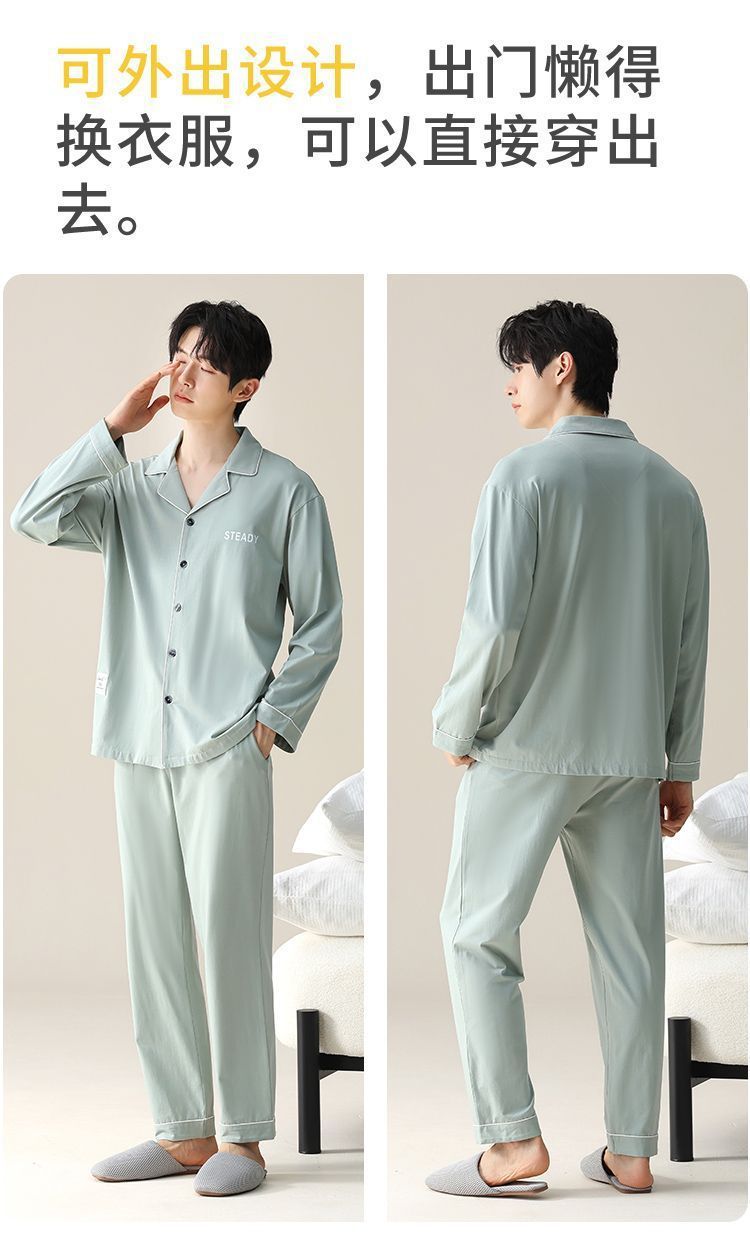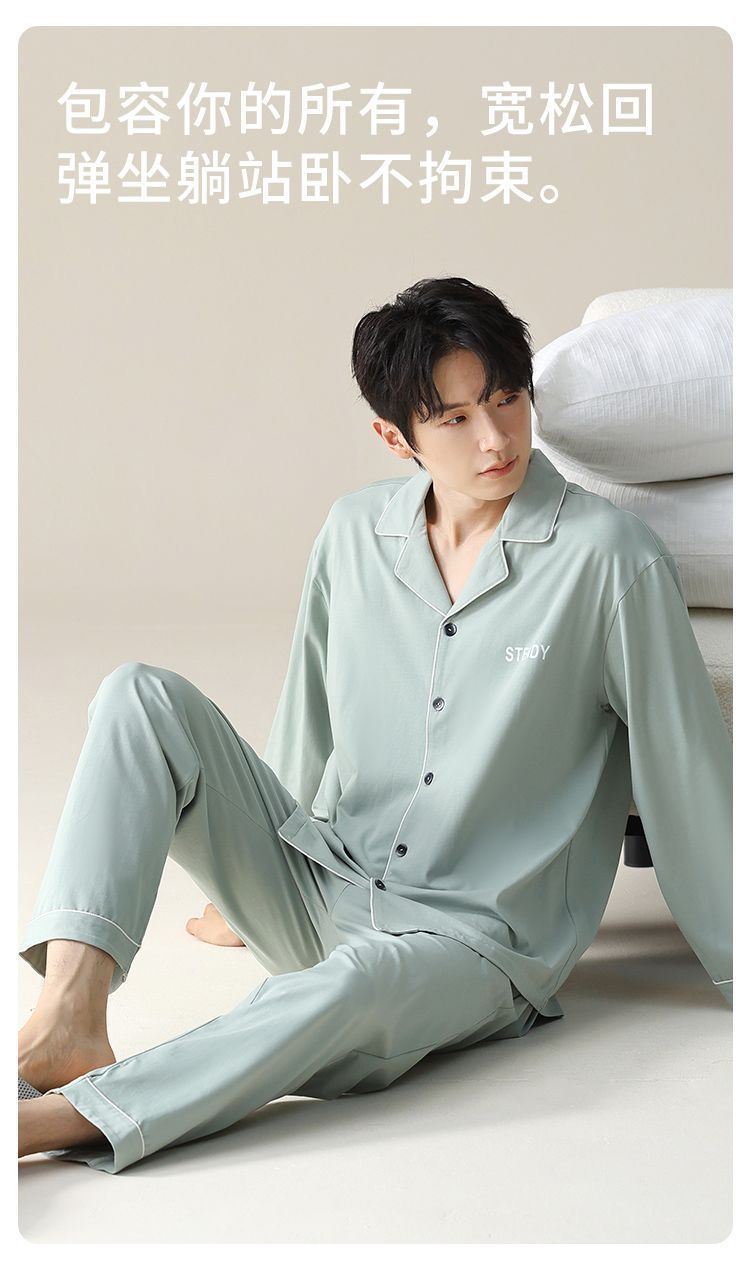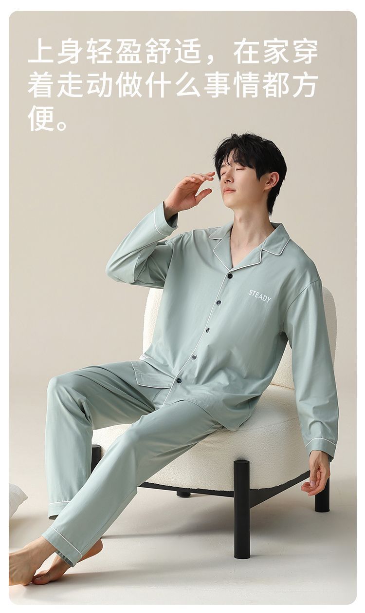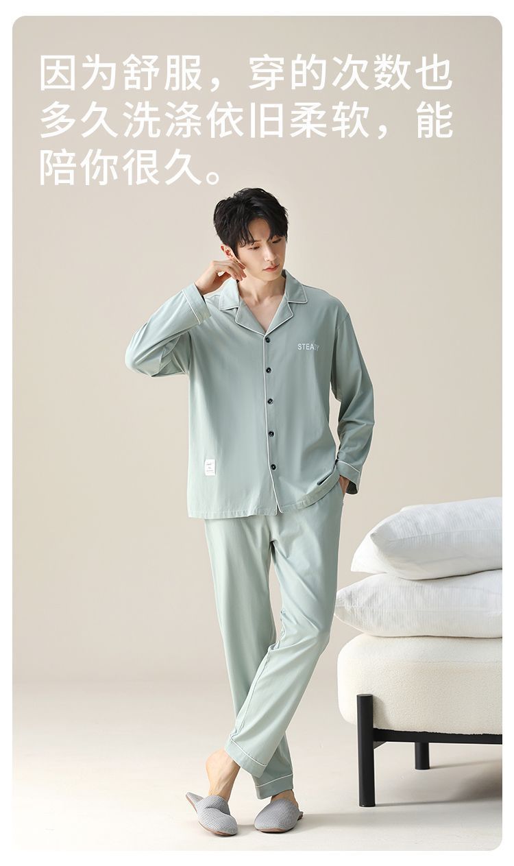 순면 잠옷 남자의 봄과 가을 얇은 긴 소매 십대 간단한 단색 플러스 사이즈 홈 옷스토어 가기