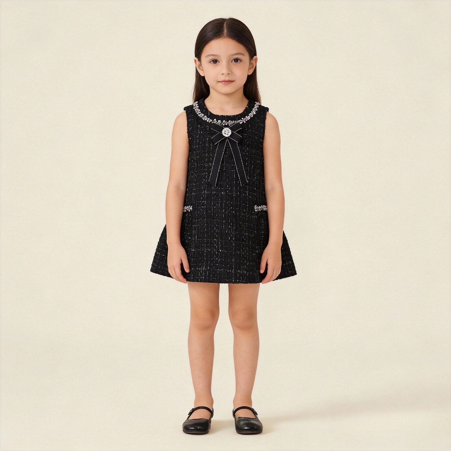소녀 트위드 스타일 민소매 꽃병 스커트 2025 봄 새로운 어린이 빛 럭셔리 블랙 라인스톤 원피스스토어 가기