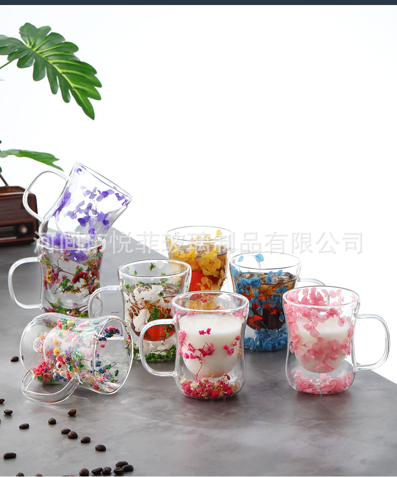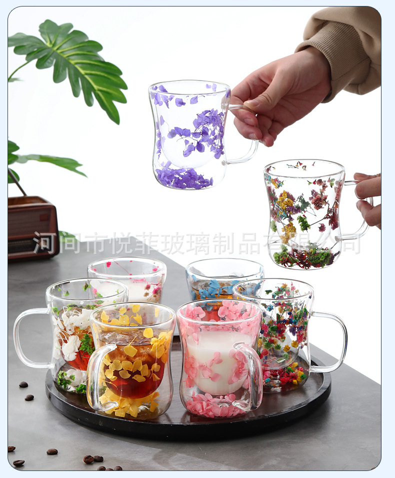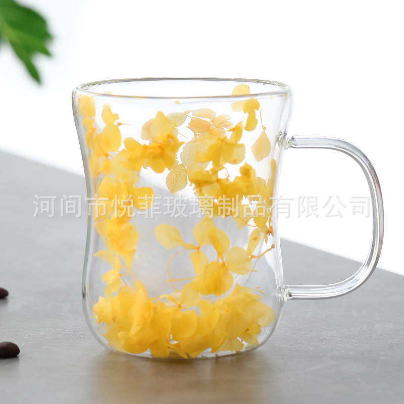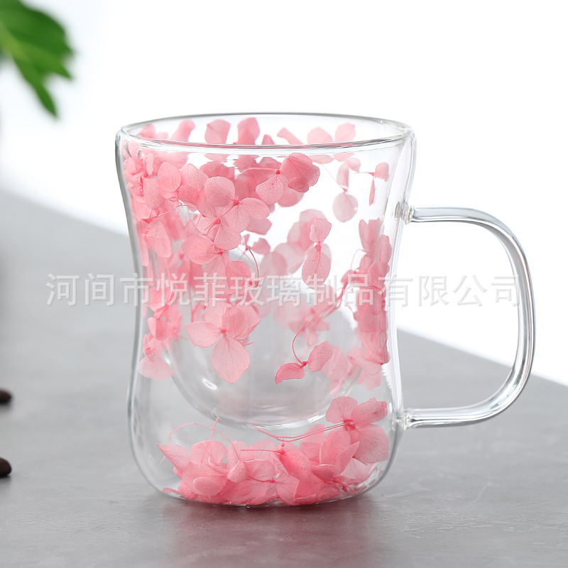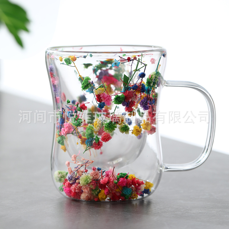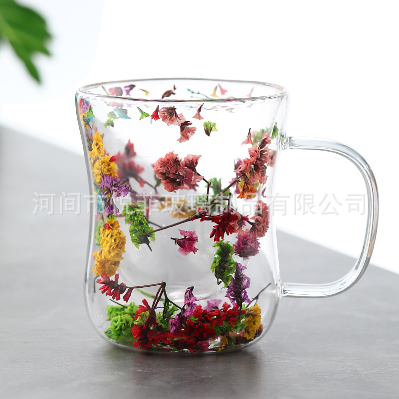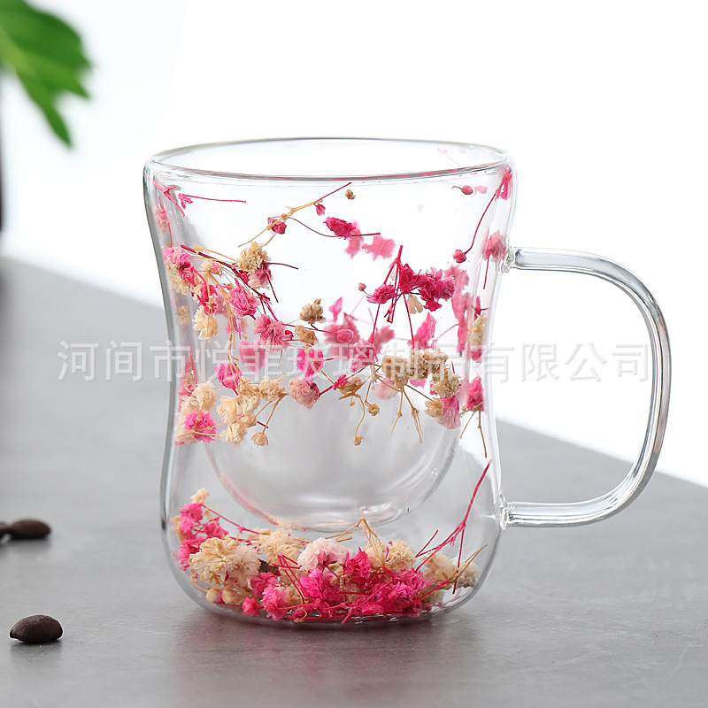 250ml 유리 컵 가구 높은 붕규산 우유 컵 핸들 차 컵 더블 유리 말린 꽃 컵 커피 컵