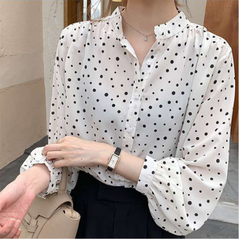 한국 웨이브 도트 쉬폰 셔츠 여성의 2024 년 봄과 가을 새로운 긴 소매 선스크린 탑 우아한 랜턴 슬리브 베이스 셔츠 트렌디스토어 가기