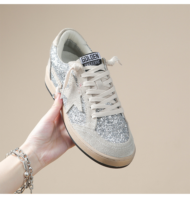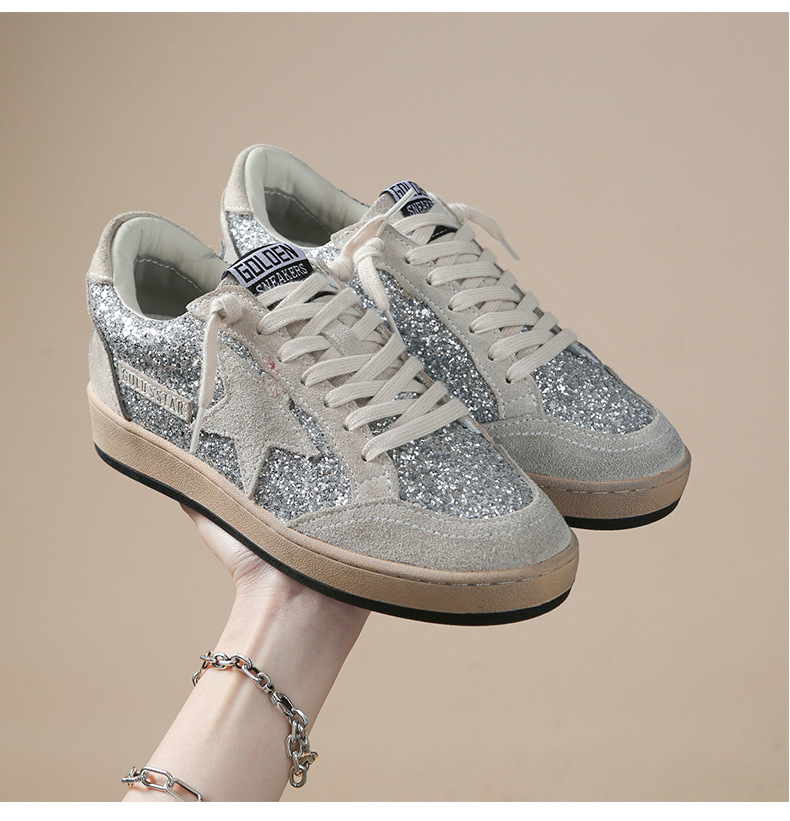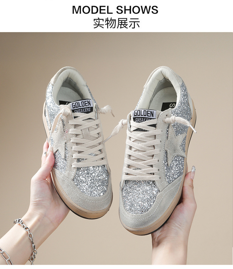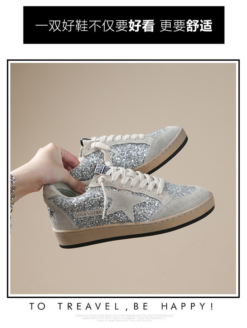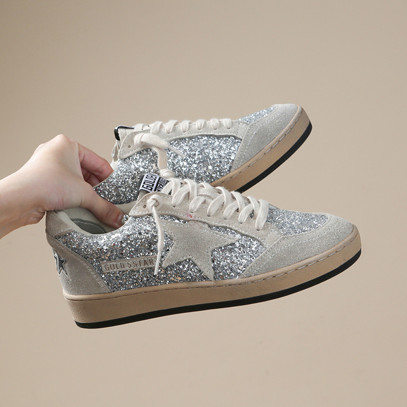한국 작은 더러운 신발 여성의 새로운 스타일 올드 스타 Sequins 학술 스타일 레이스 업 캐주얼 보드 신발 캐주얼 패션 100
