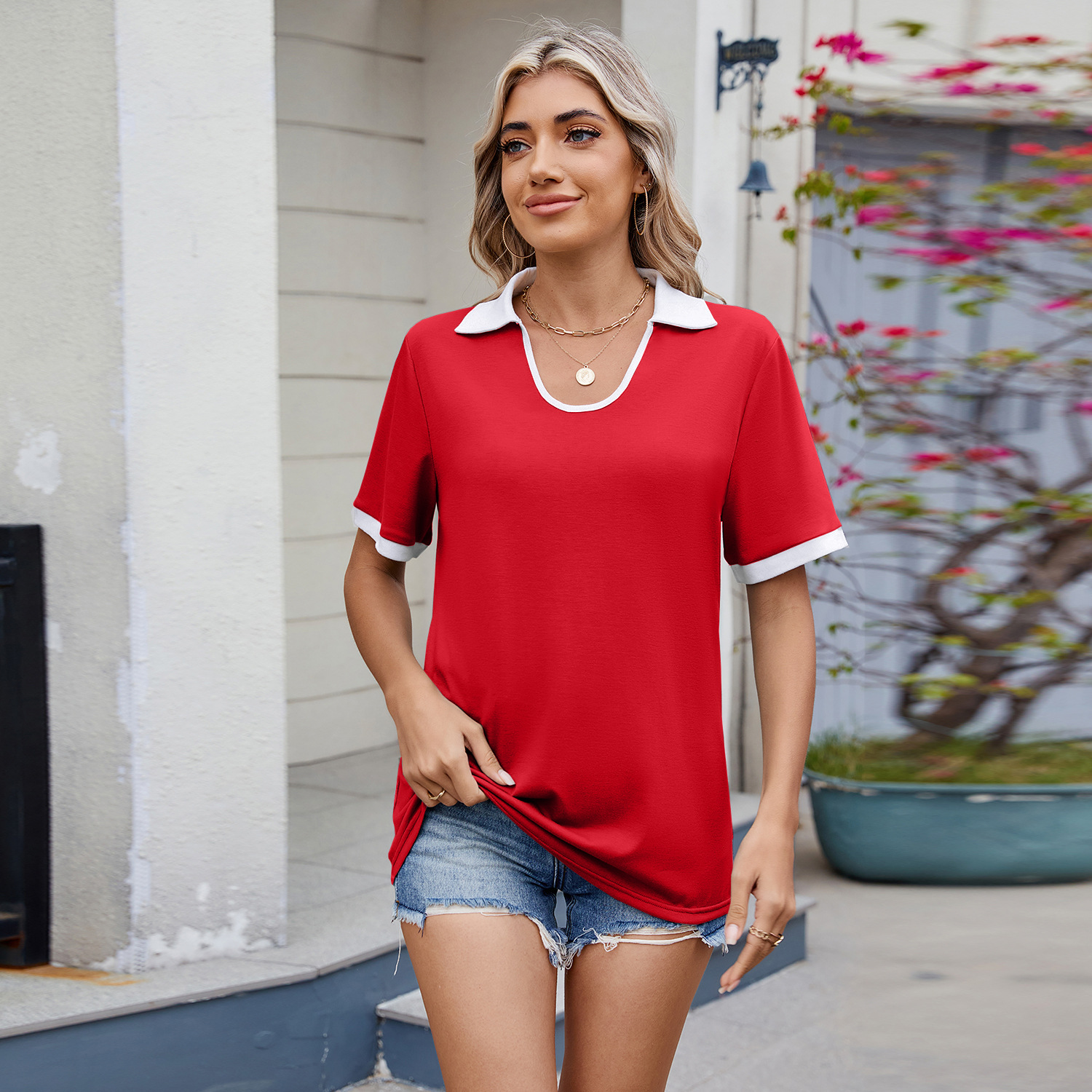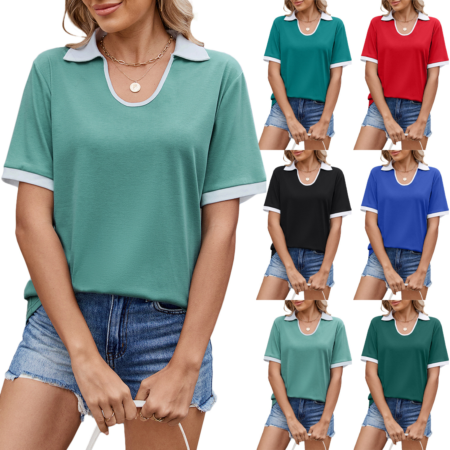아마존 유럽과 미국 국경 대외 무역 2025 봄과 여름 새로운 대비 컬러 옷깃 짧은 소매 느슨한 티셔츠 최고 여성 재고스토어 가기
