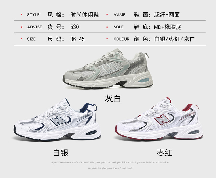 Nb530 Putian Pure Original Shoes New Bailun 트렌디 남성용 러닝 슈즈 스포츠 토르 슈즈 트렌디 한 실버 그레이 통기성 남성과 여성 신발